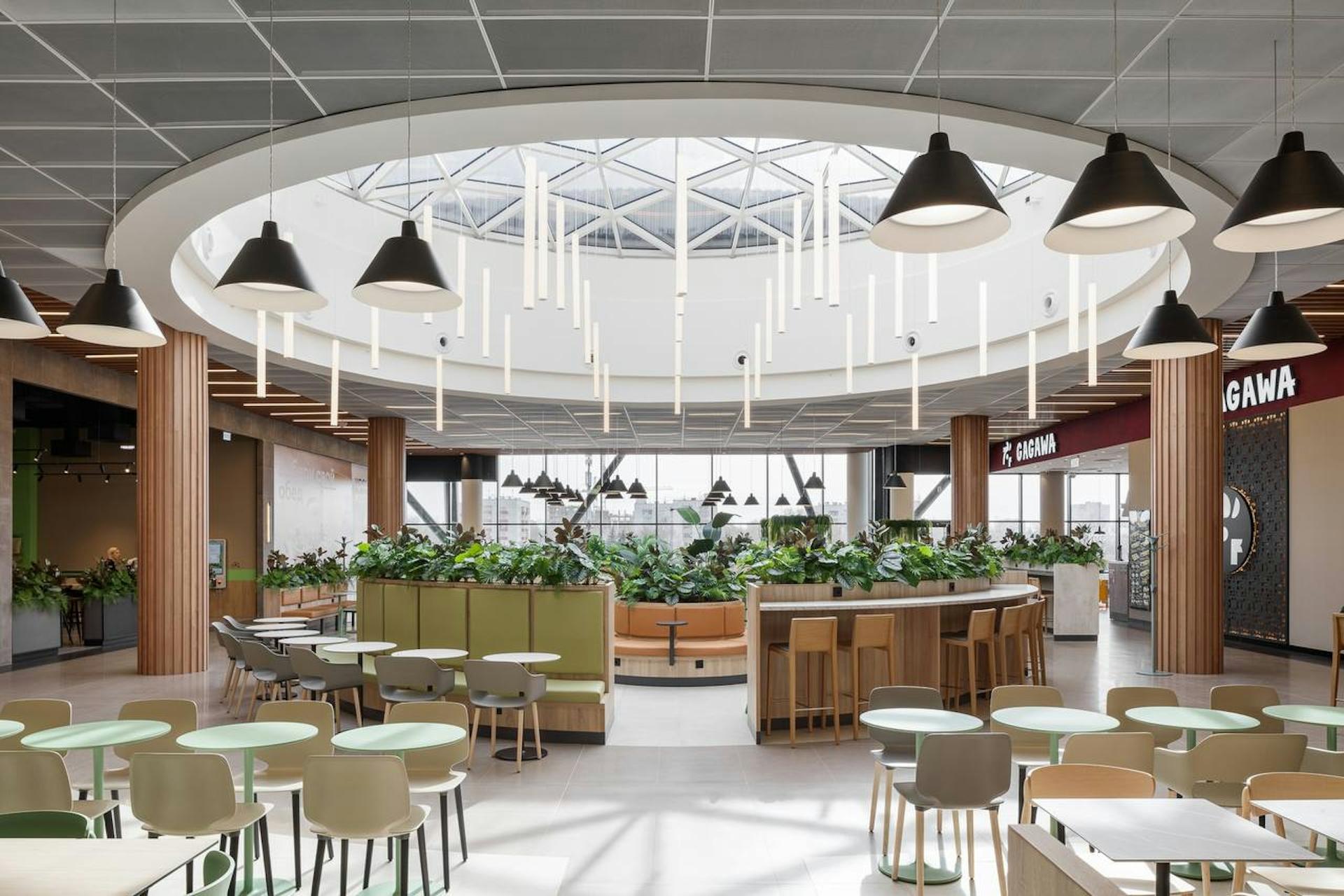 Теплый дневной свет, проникающий в залы, поддерживает атмосферу спокойствия и расслабления. Разнообразные функциональные зоны выделяются при помощи озеленения: от стильных кашпо и сухоцветов до тропических растений, которые радуют глаз в зоне фудкорта.