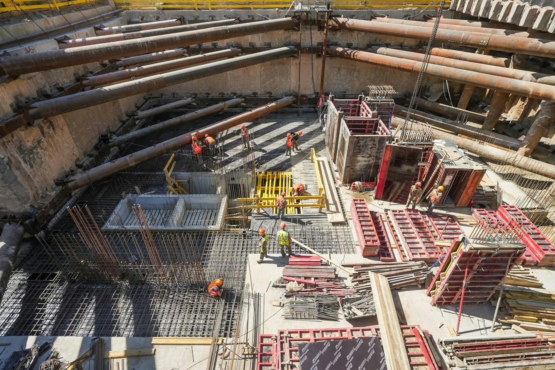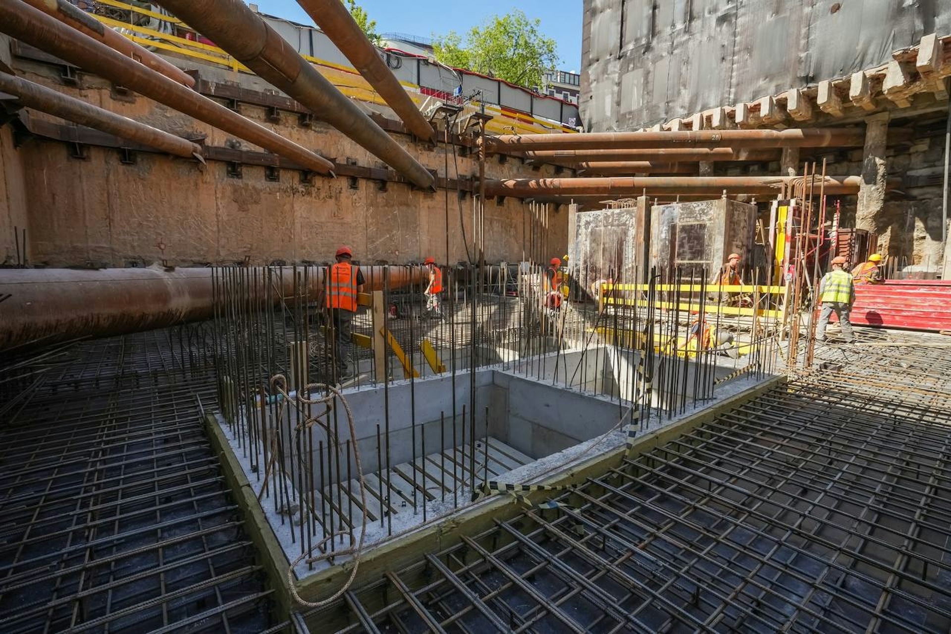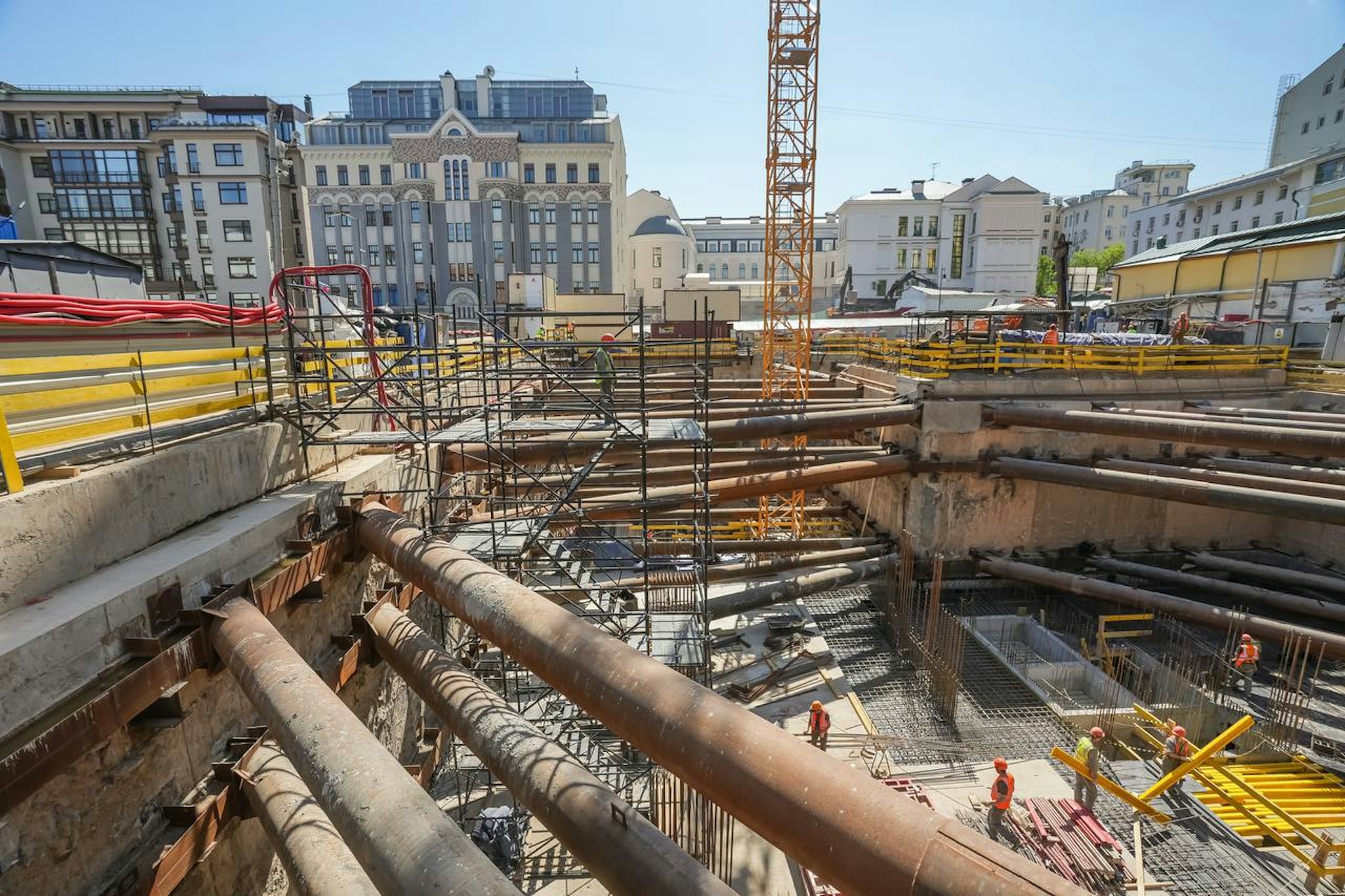 На сегодняшний день завершение котлована приближается к финальной стадии: разработка выполнена на 95%, а распорная система смонтирована на 90%. Ведутся работы по гидроизоляции подземной части и бетонированию фундаментной плиты.