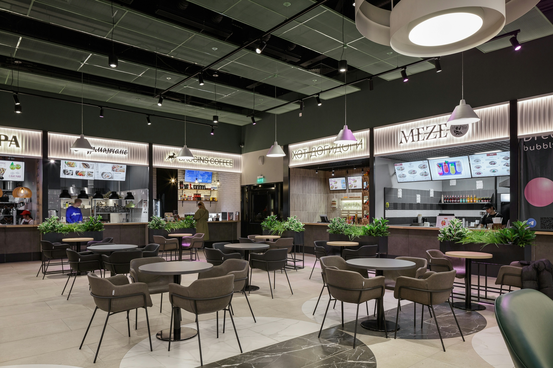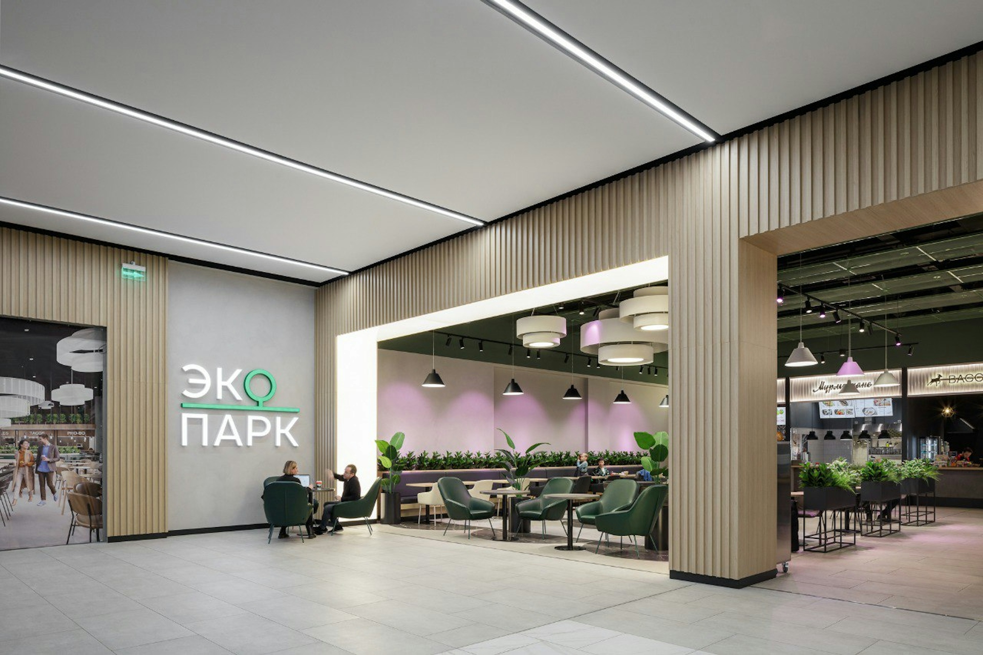 The design makes abundant use of natural natural textures in warm colors. In the food hall zone, wood dominates in the elements of decoration and a large amount of greenery is used. The concept emphasizes the brand of the shopping and entertainment center “EcoPark”, which is based on proximity to nature and care for visitors.
