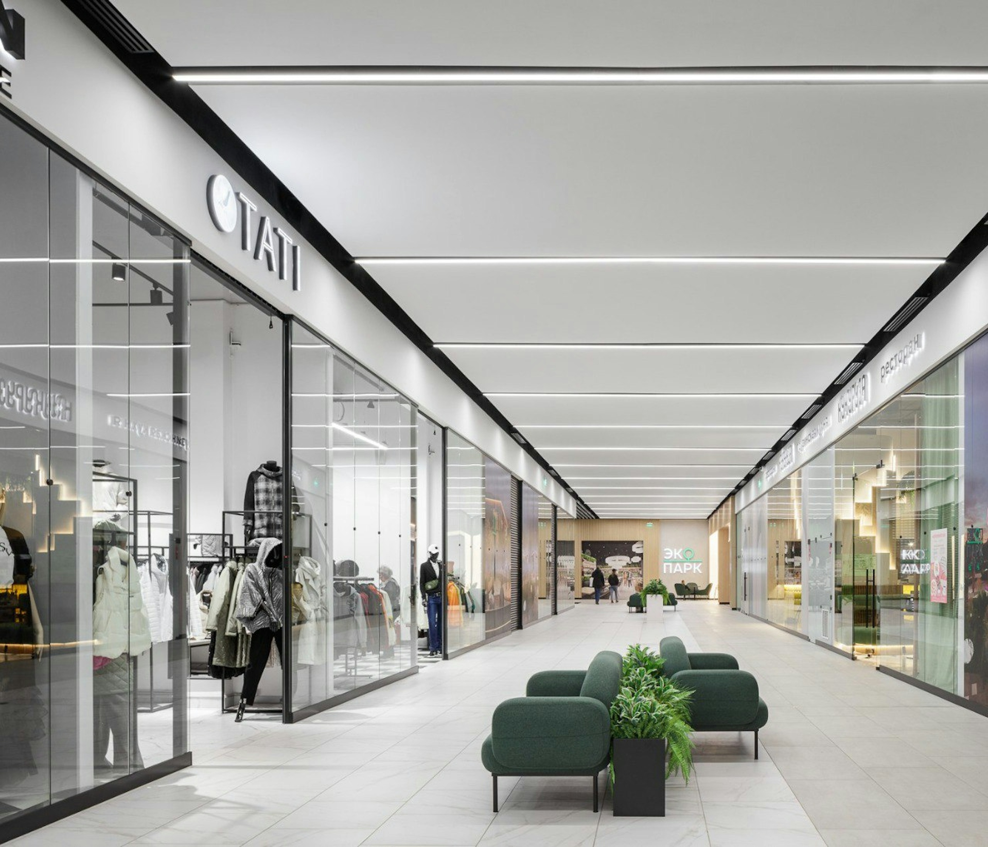 The total area of the shopping and entertainment center “EcoPark” is 25,000 sq. m., the area of public spaces, including a gastronomic cluster of 1,450 sq. m., is 5,328 sq. m. The construction of the second stage of the shopping and entertainment center is planned in the future.