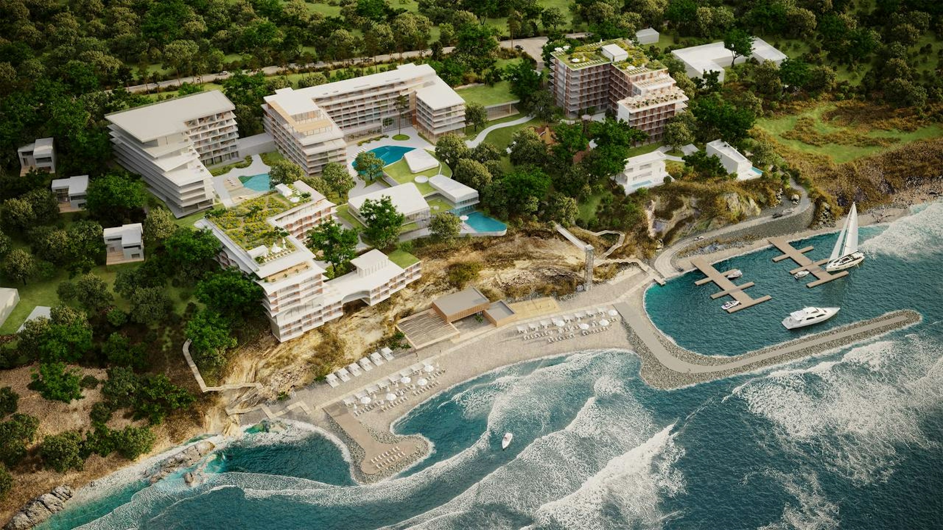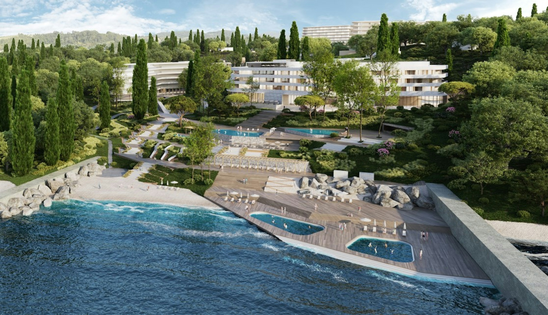 Maysky Hotel Complex, Krasnodar Region: inspiring hotel and villas on the Black Sea coast. We designed the new volumes while preserving the natural landscape and rare plant species on the site. This is architecture for contemplation and peace, complemented by a colorful component for family vacations.