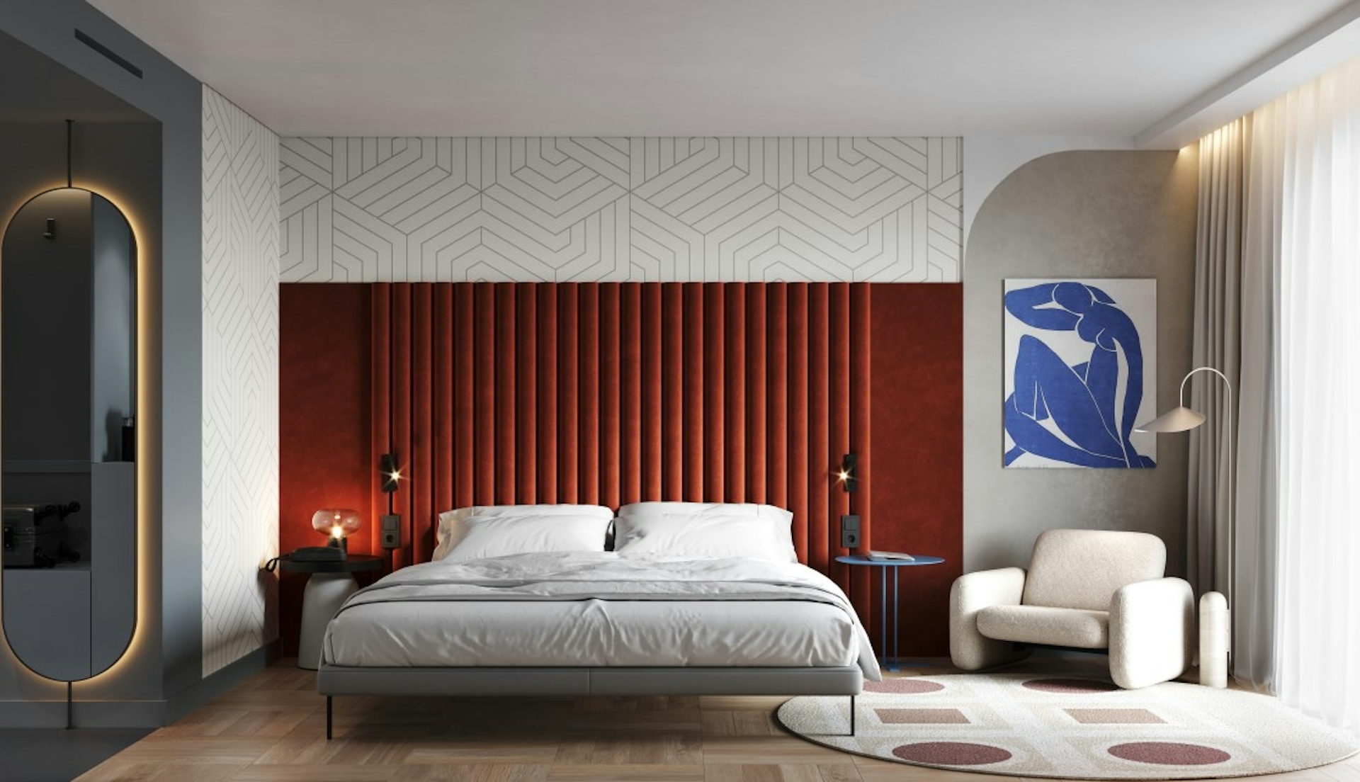 Mercure Hotel in Moscow: we created interiors for the rooms of the 5* hotel in the historical center based on the color scheme of the surroundings. Blue and blue shades echo the pipes of HPP-2, rich scarlet is in tune with the Krasny Oktyabr factory and the Kropotkinskaya lobby. The art in the design refers to the proximity of the Pushkin Museum.