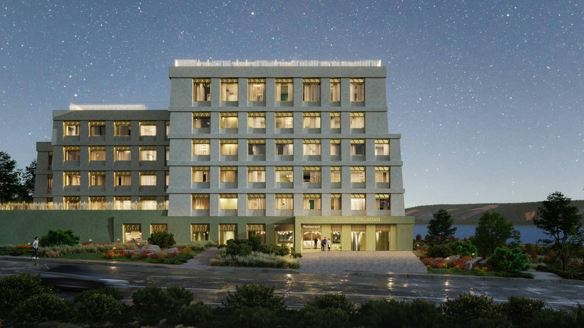 Azimut Group Hotel in Magadan: a chamber hotel of 4* category. For the low-rise complex we designed an aesthetic volume with panoramic glazing and unusual color of facades.