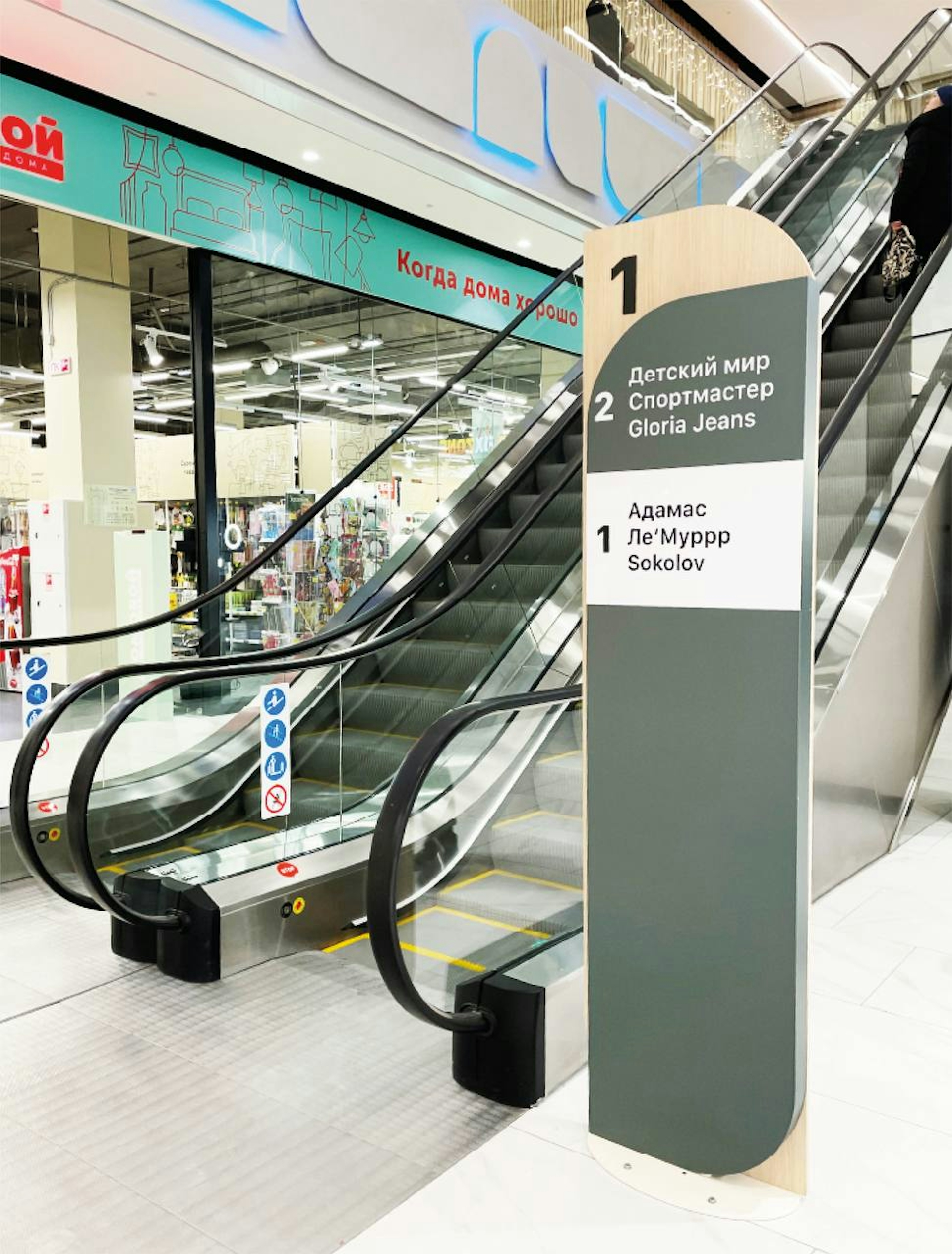The BLANK team developed an intuitive and effective navigation system that guides visitors to their desired destinations. This work was carried out alongside the creation of interiors and a corporate identity for the facility, allowing for the integration of navigational elements into the overall branding of the shopping center.