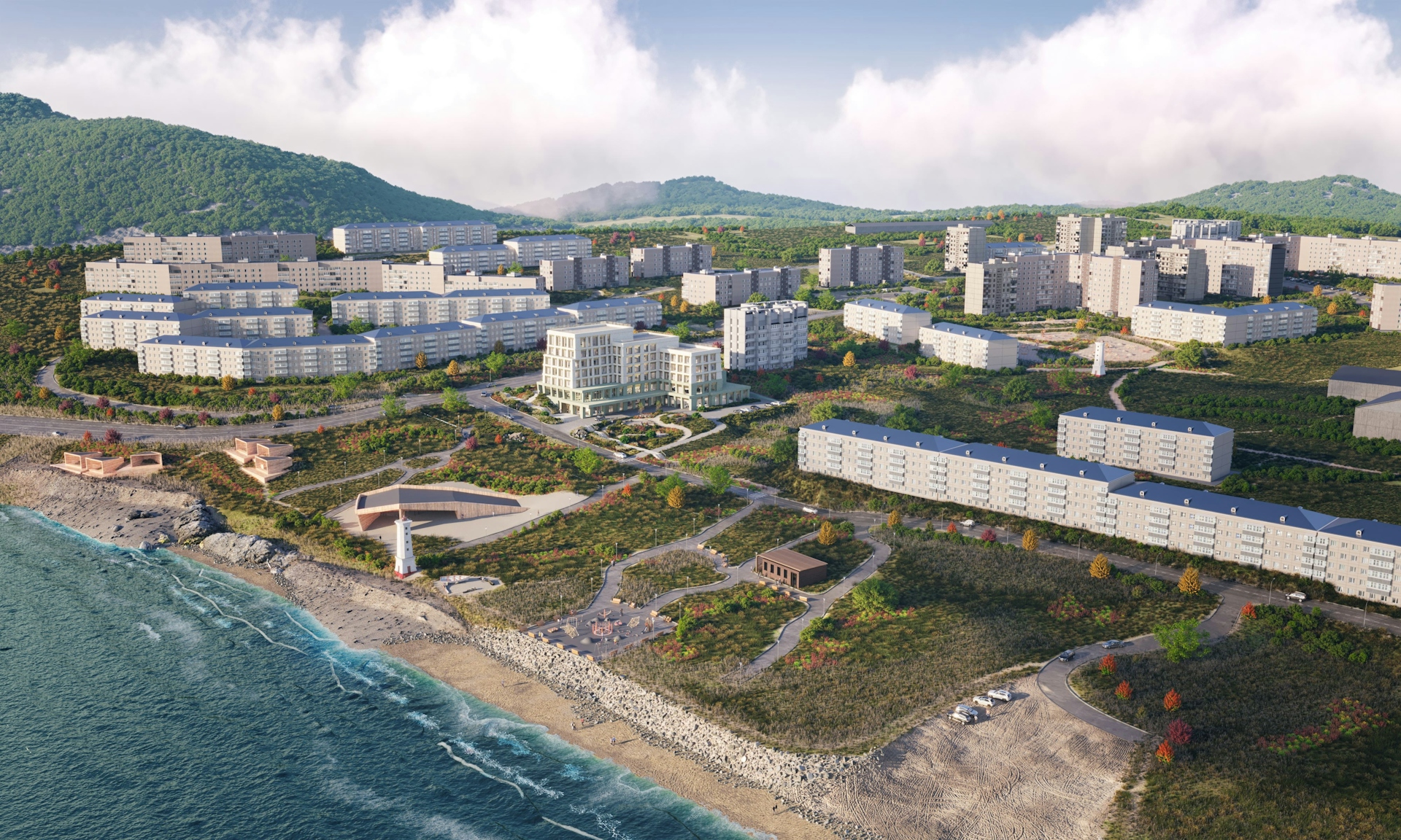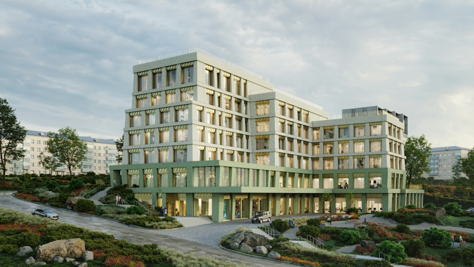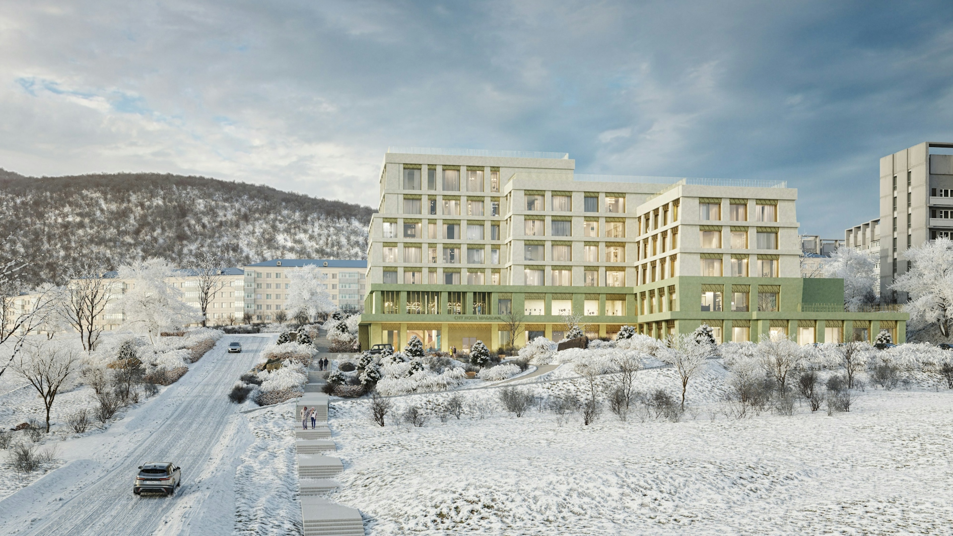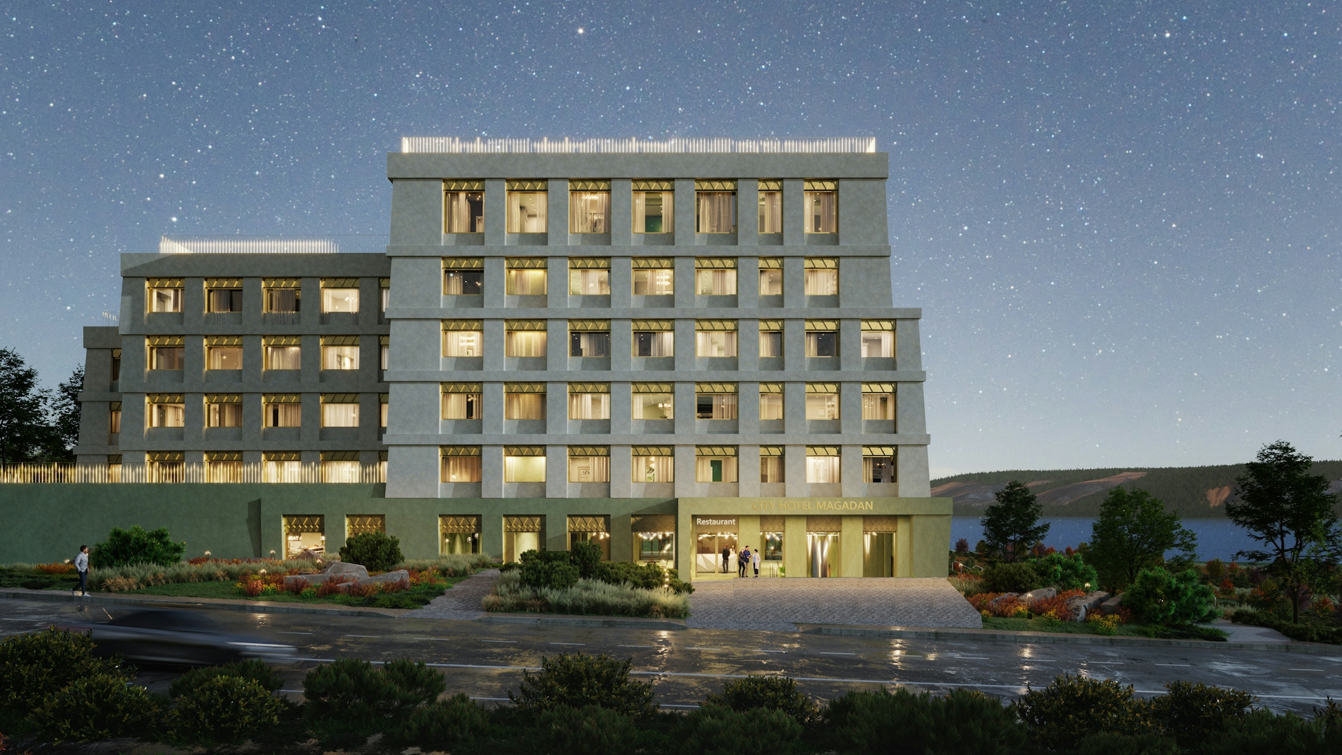 The power of the northern landscape sets unique spatial experiences and has a deep tourist potential, already partially revealed in numerous routes along capes, peninsulas and hills. The silhouettes of rocky shores in the northern landscape were chosen as inspiration. The nature of the shape and volume of the buildings, as well as their way of organization in space, create a recognizable impression: it is as if we are looking at man-made rocks. With the help of an interesting rhythm of window openings, the geometry of the masses became more complicated, highlighting the entire complex in space. An important detail of the plastic facades is geometric symbolism, which was created by simplifying the traditional ornaments of the peoples of the north. The small indigenous people of the north live in the Magadan region and are endowed with a special status, and an ethnic park is being developed in the Gertner Bay. The use of ornaments of ancient peoples in the modern interpretation preserves a unique cultural layer and sets a specific visual language. Such patterns can manifest themselves both in the tone and color of materials, and in microplastics of finishing surfaces. The location of the hotel's volumes is dictated by the desire to provide for the maximum number of rooms a direct view of the sea in Nagayev Bay. For the restaurant in the hotel there is an additional separate entrance from the side of Portovaya Street. The exterior walls in the restaurant area are made with panoramic glazing. From the restaurant hall, access is provided to its own glazed terrace - the exploited roof of the basement, which will also be a view. Access to the roofs of the 4th and 5th floors for maintenance is provided through the corridors of the 5th and 6th floors, respectively. The hotel's own territory also provides for conceptual landscaping in the traditions of northern nature. Soft coverings on the territory will be tundra carpets – rocky-juniper and from flowering groundcover plants: bagulnik, blueberry, fescue, Kamchatka rhododendron. Landscaping is complemented by natural stone and blocks of shungite, and the paths are paved with inlaid street granite and concrete tiles. Mountain pines, dwarf birches, juniper and cereals will make landscaping accentuated and allow you to visually connect it with a natural park outside the boundaries of the design zone.