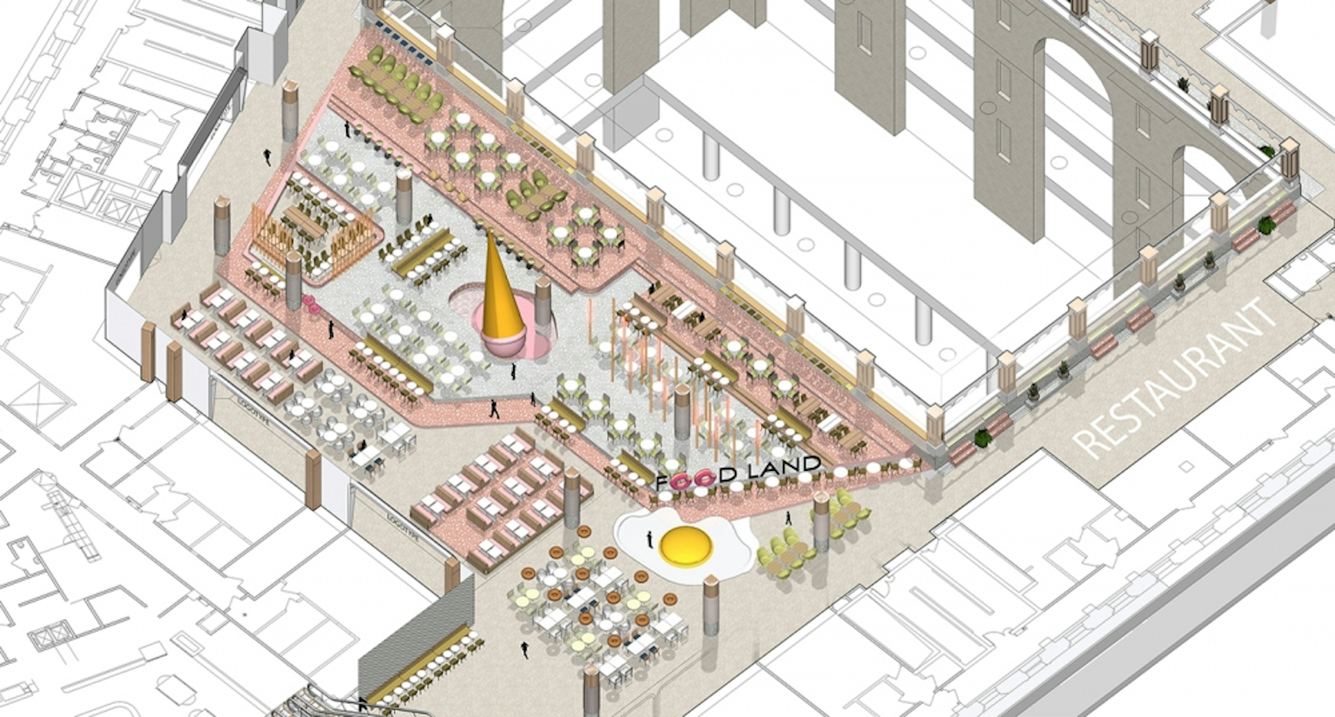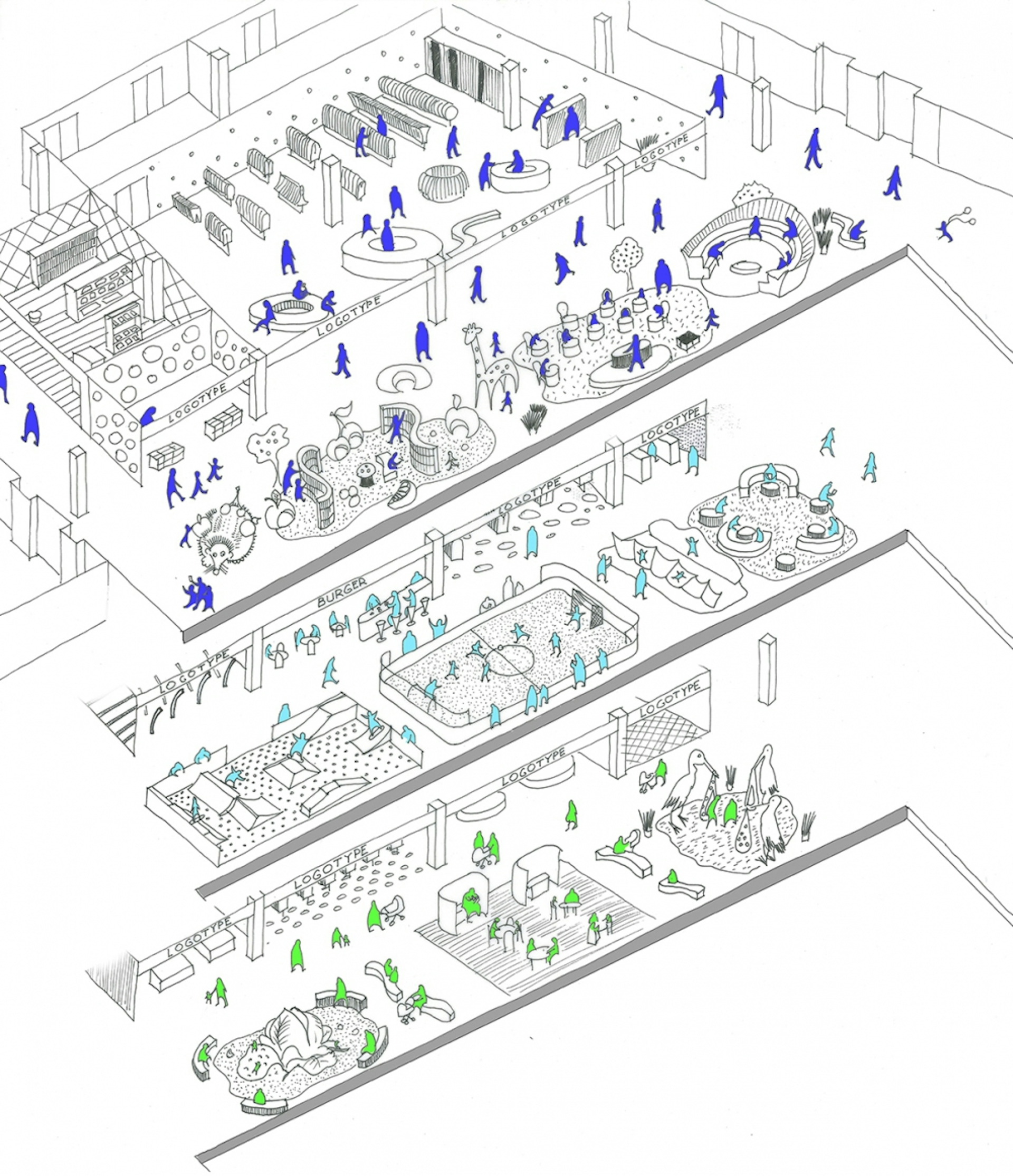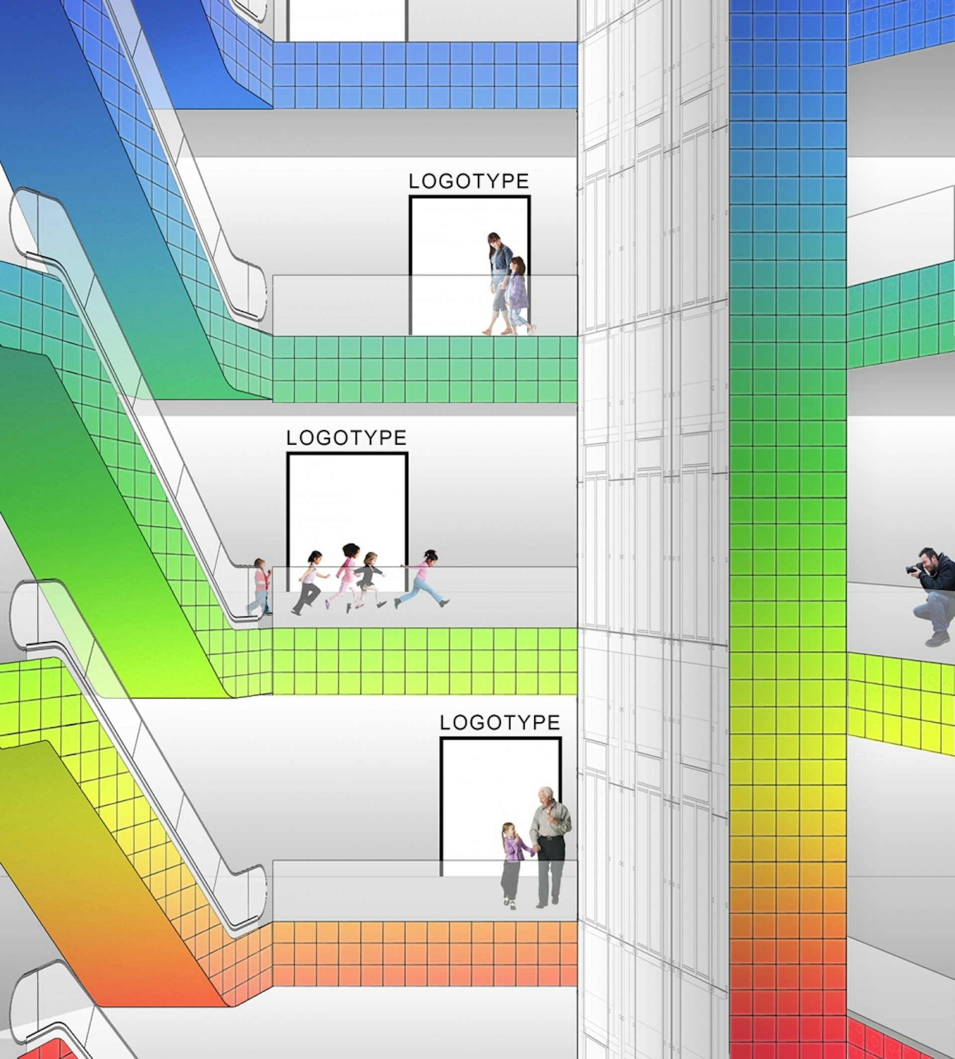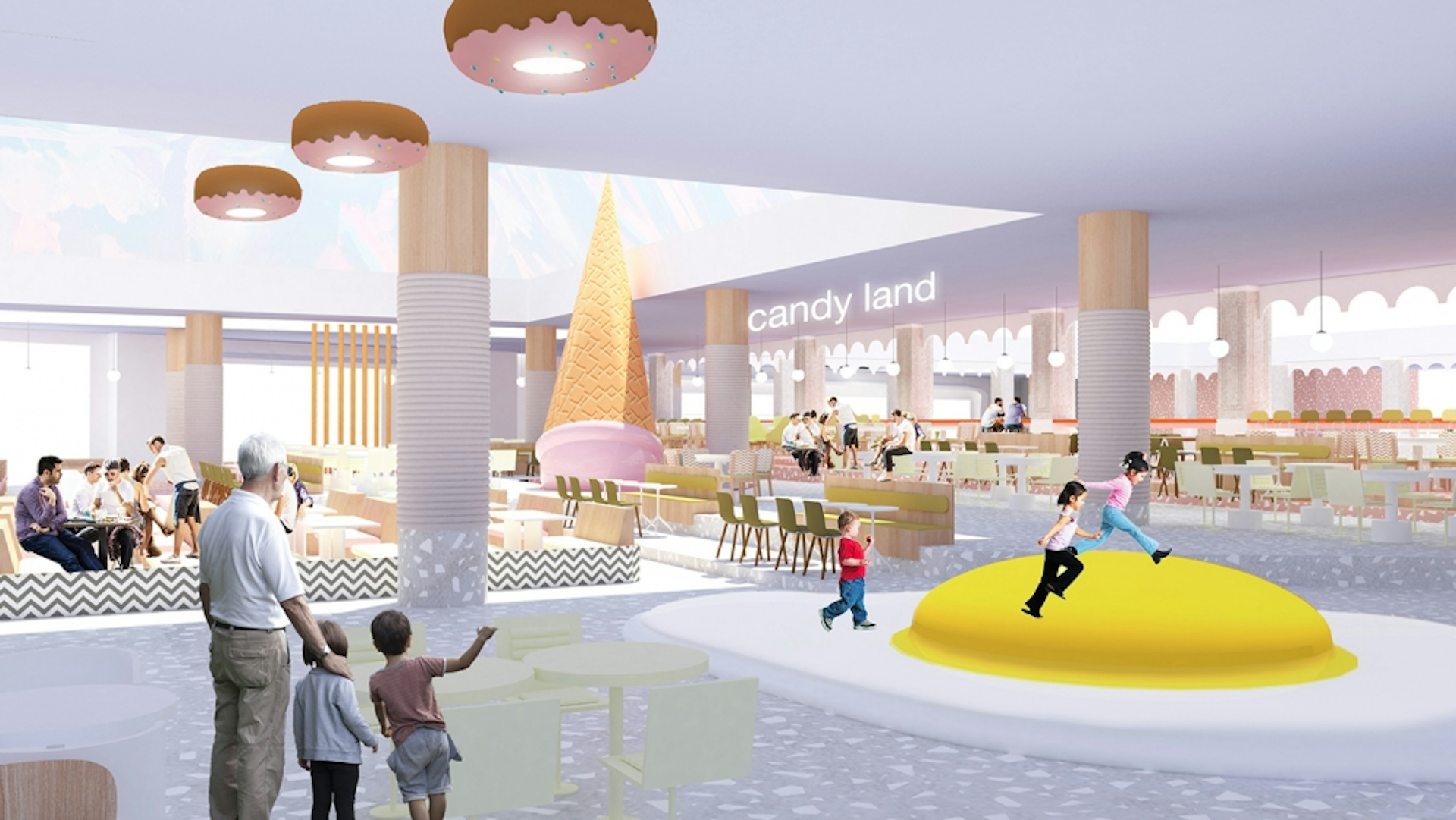 Design approach was to transfer the idea of imaginary world which creates an unforgettable customer journey. Dream land as experience of the world of a kid. Imaginary world of a kid is bright and colored, full of surprises, delusive scale, no time or space relevance. As art objects we use resting zones and furniture’s on the gallery and as well on the food court. Huge ice creams and mushrooms appear in unexpected locations that will bring fun and positive atmosphere. Each floor we dedicated to different guests. Colors and navigation will change as per floors, where different age guest will find their stores and entertainments. We use colorful pallet and different type of materials to make it as much as possible interesting.