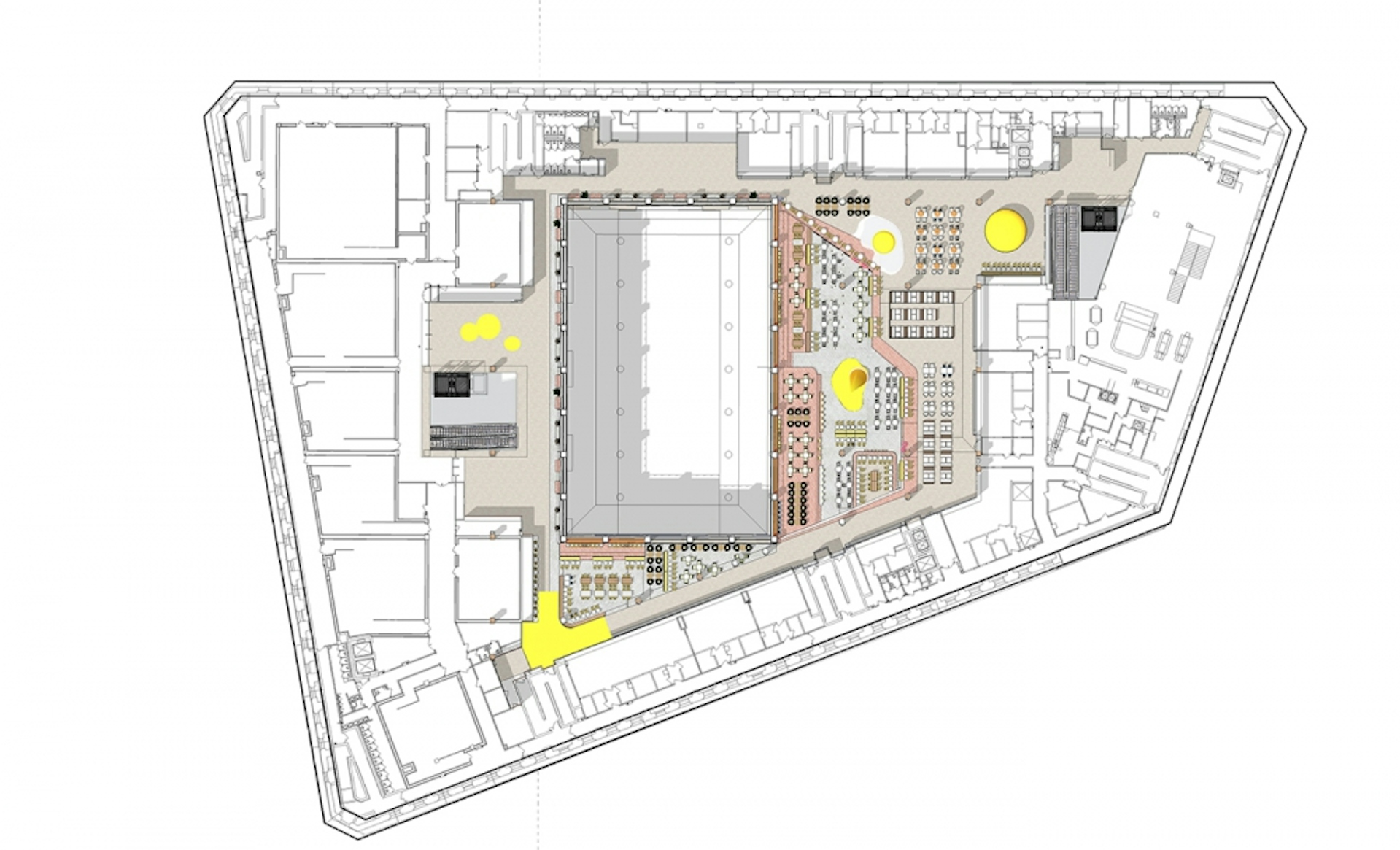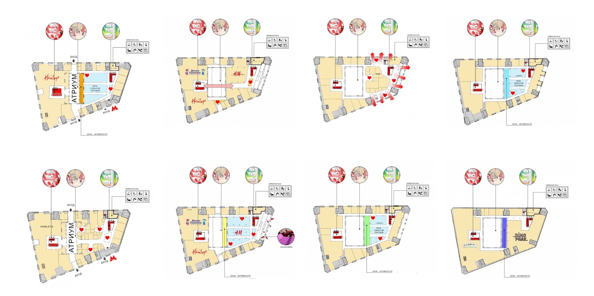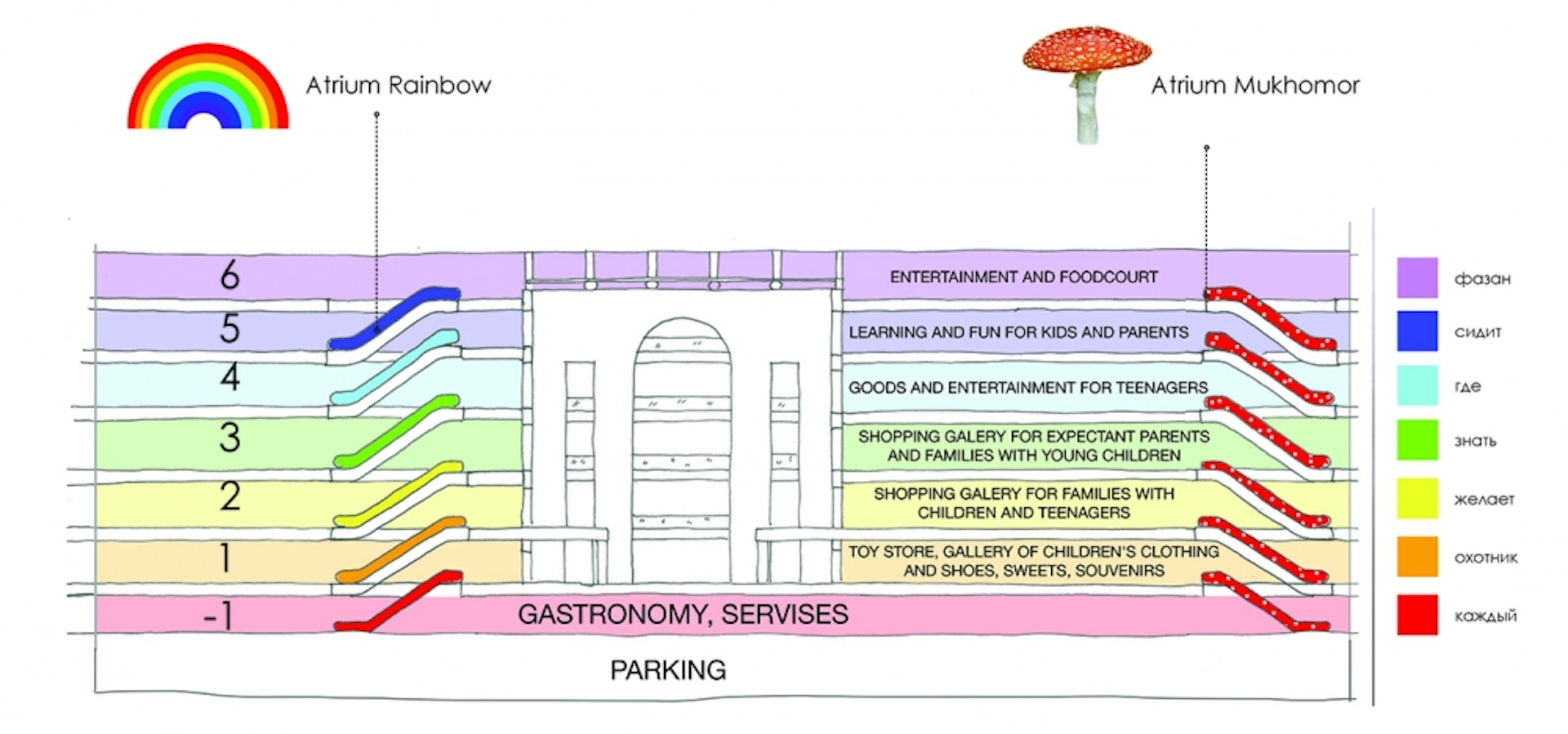 We accent main atrium making it full of activity zones. Client's path rotates between the two dominants - large and small atriums, each of which should be a point of attraction for visitors. Atriums are full of life and points of interest suggesting the visitor to proceed further and discover new points for yourself.