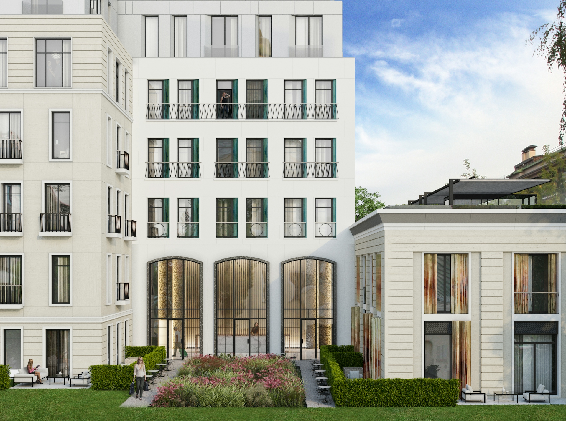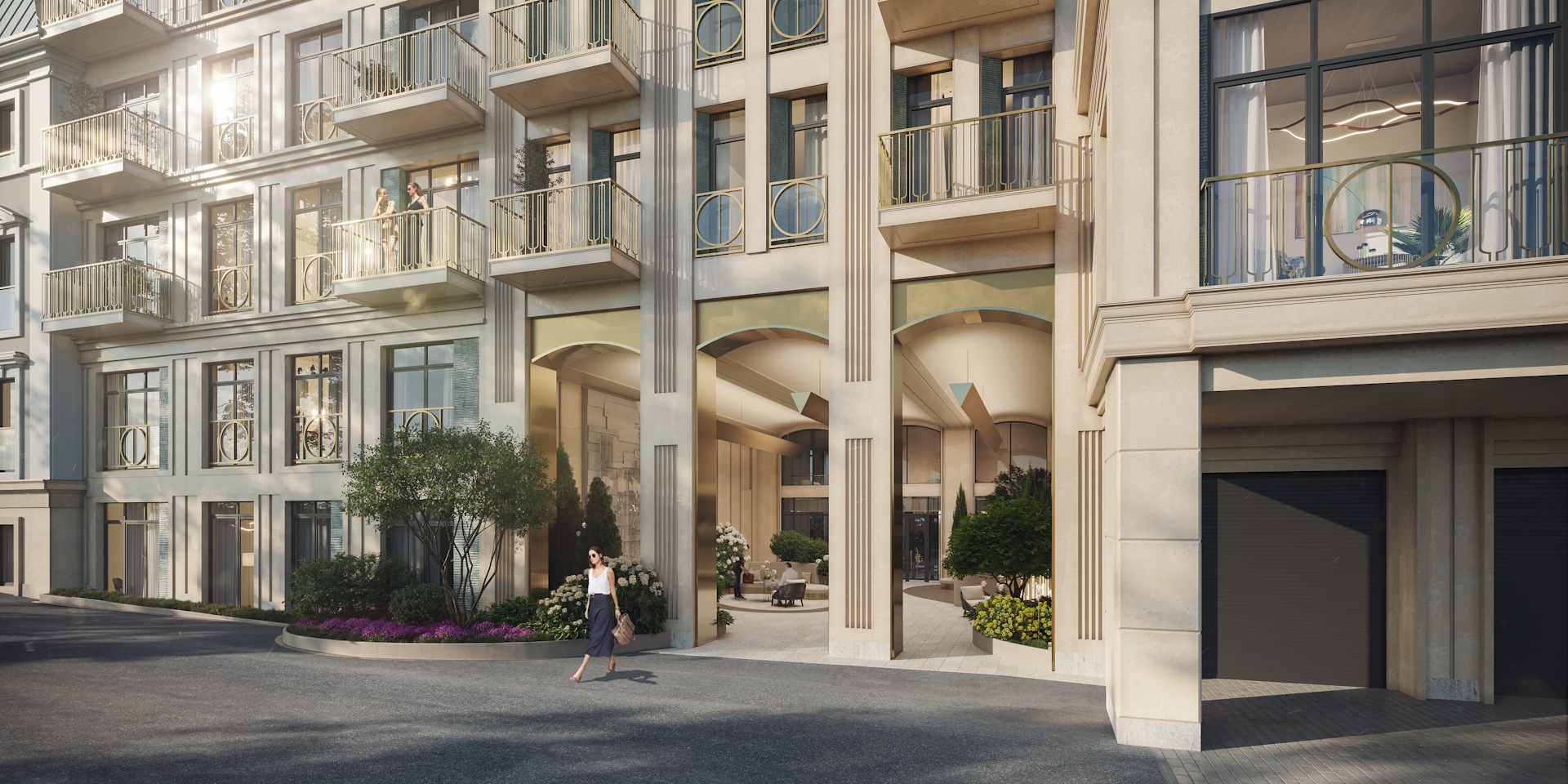 The multi-level architecture of the project, despite its small volume, is not accidental. It emphasizes the individuality of the house and creates a sense of scale. The facades of Obydensky № 1 are made of natural limestone, which serves as a background for rich marble and brass decoration. Green marble frames the tall floor-to-ceiling windows, adding grace and lightness to the facade. Symmetry is a distinctive feature of the composition of the house, it can be traced in the solution of the facade and in the individual elements of decoration. Patinated copper roof harmoniously fits the house into the panorama of Ostozhenka, giving it an aristocratic charm. In the evening and at night, Obydensky № 1 comes to life thanks to hidden lighting that delicately emphasizes its volumes and facade relief, creating a unique atmosphere of luxury and comfort.