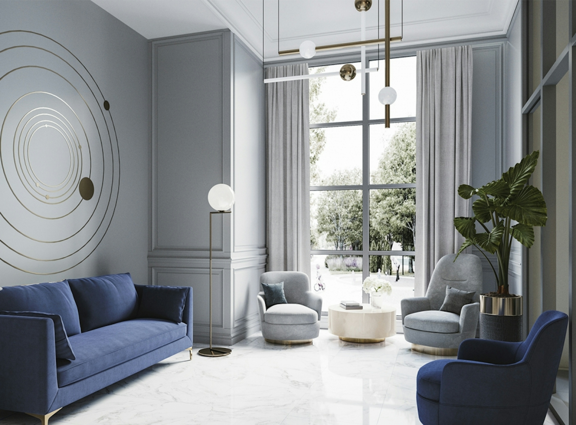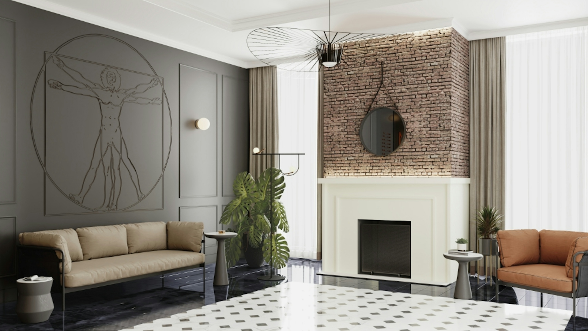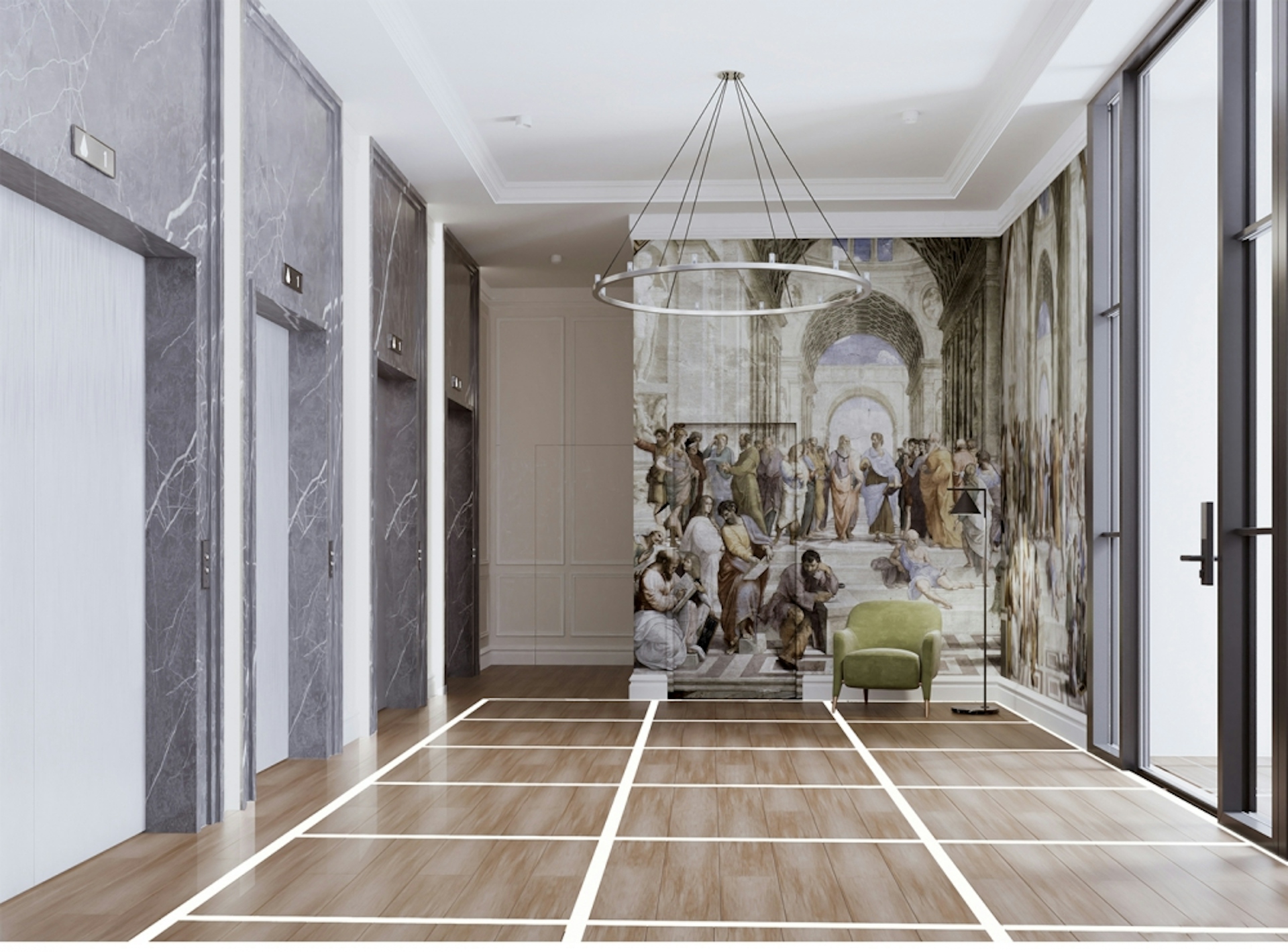 In the design of the lobby and common areas of the residential complex we proposed to use direct references to the main discoveries of each of the scientists in the form of decorative elements, taking into account their epochs. In the "Aristotle" building we use frescoes, and the wall in "Newton" is made in the form of the heliocentric system of the world. In the "Da Vinci" building we used a motif reminiscent of the famous Vitruvian Man, while the accent wall in the "Mendeleev" building is in the form of a table of chemical elements.