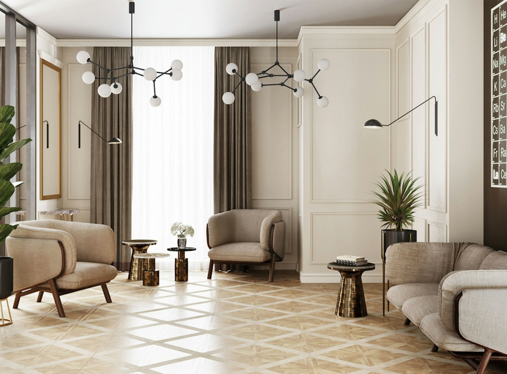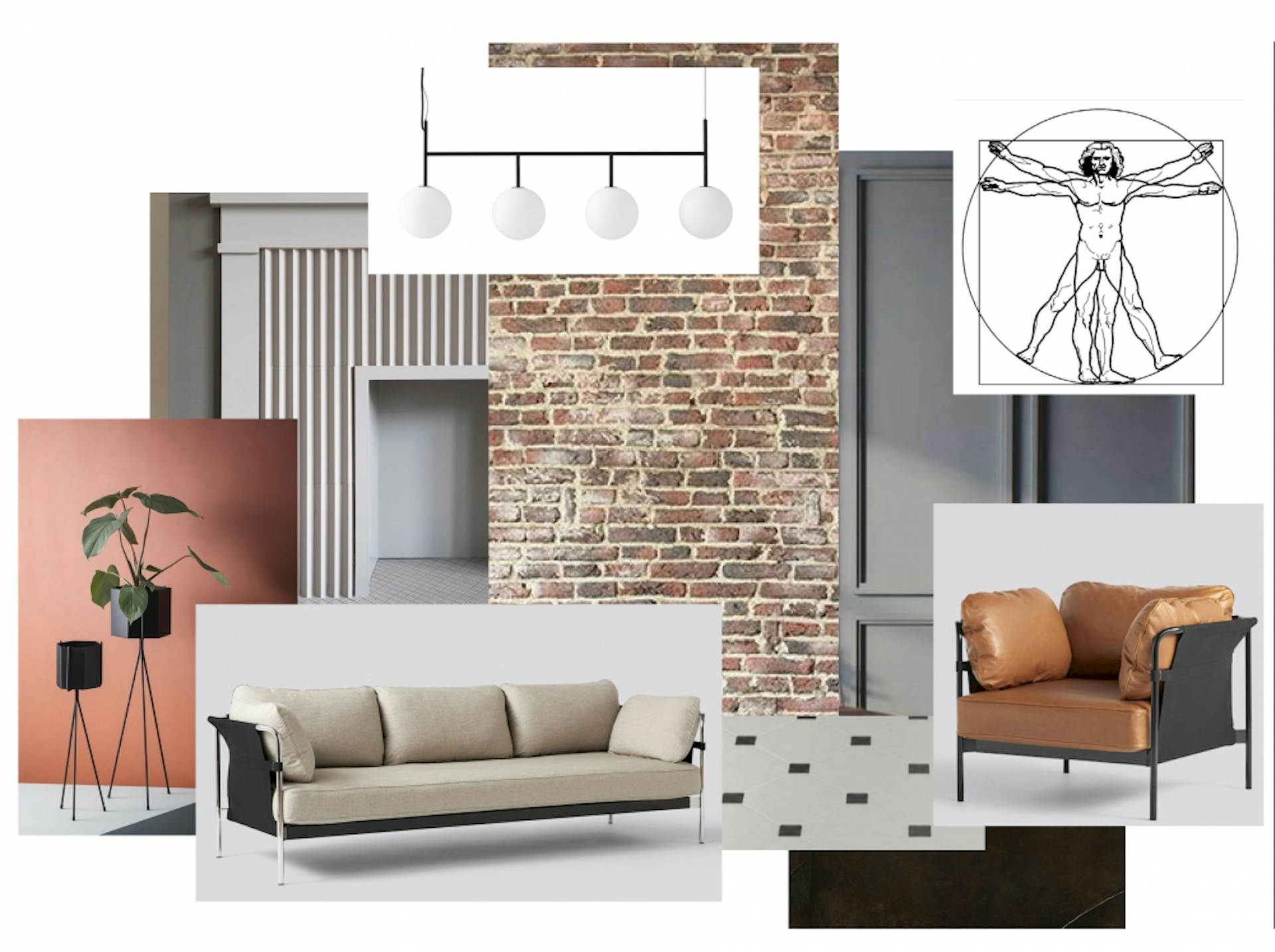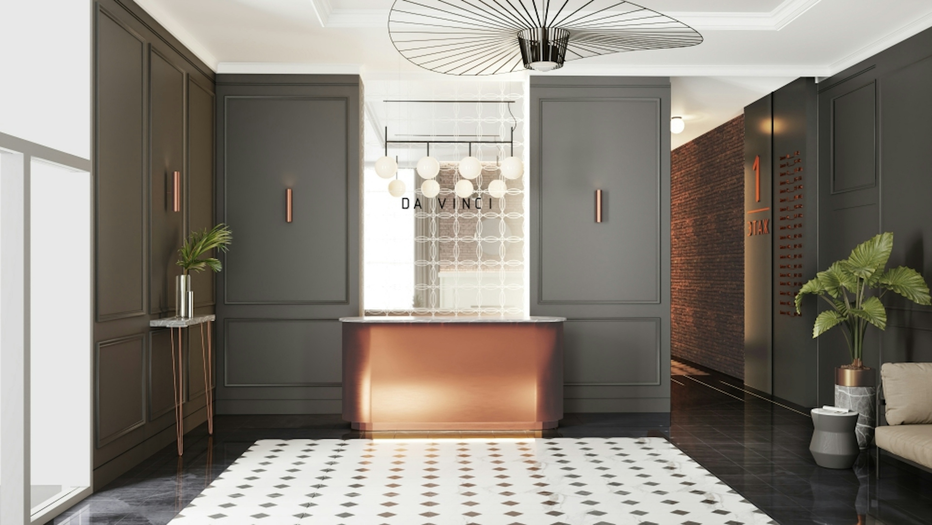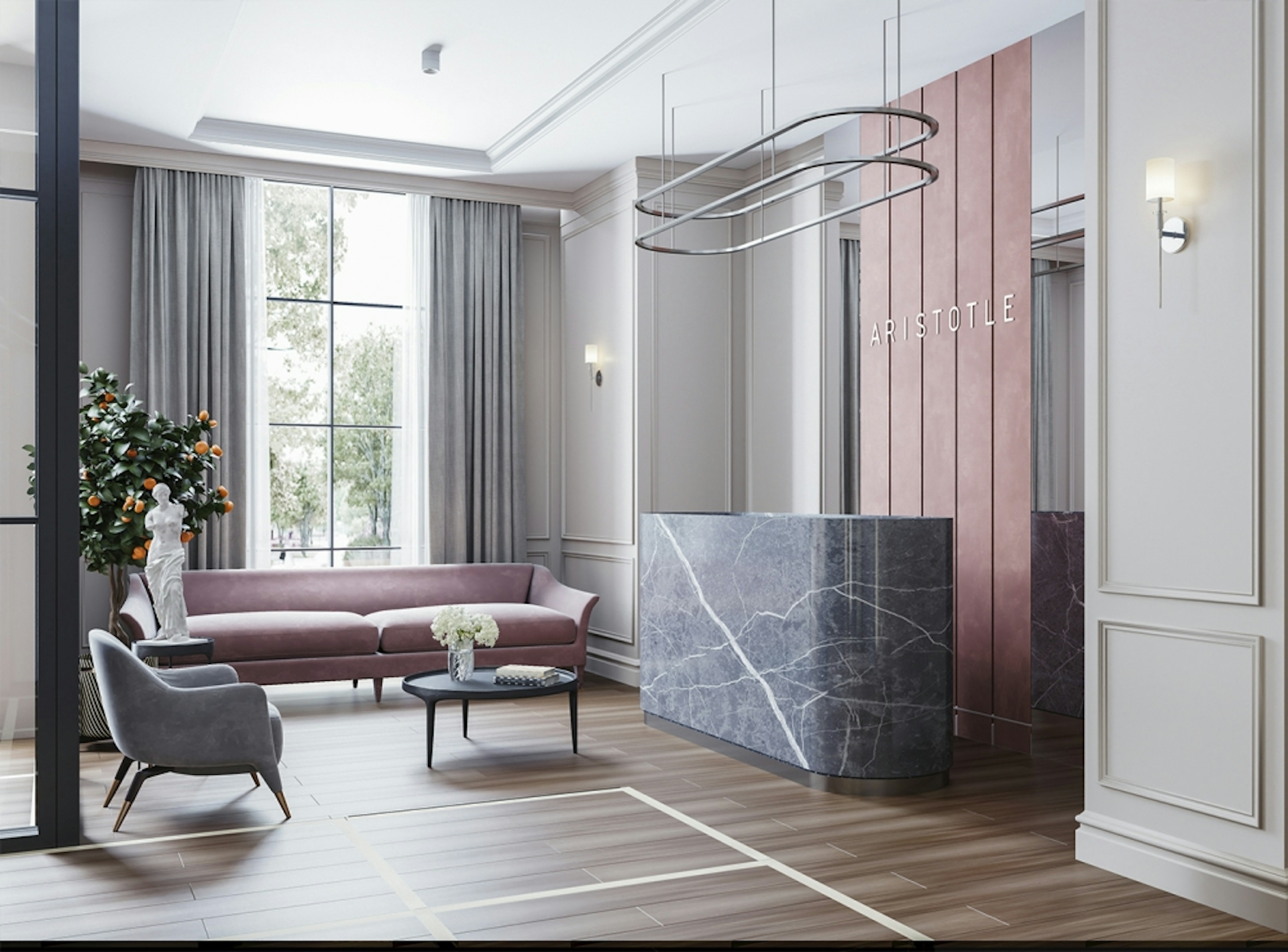 In the design of the lobby and common areas of the residential complex we proposed to use direct references to the main discoveries of each of the scientists in the form of decorative elements, taking into account their epochs. In the "Aristotle" building we use frescoes, and the wall in "Newton" is made in the form of the heliocentric system of the world. In the "Da Vinci" building we used a motif reminiscent of the famous Vitruvian Man, while the accent wall in the "Mendeleev" building is in the form of a table of chemical elements.