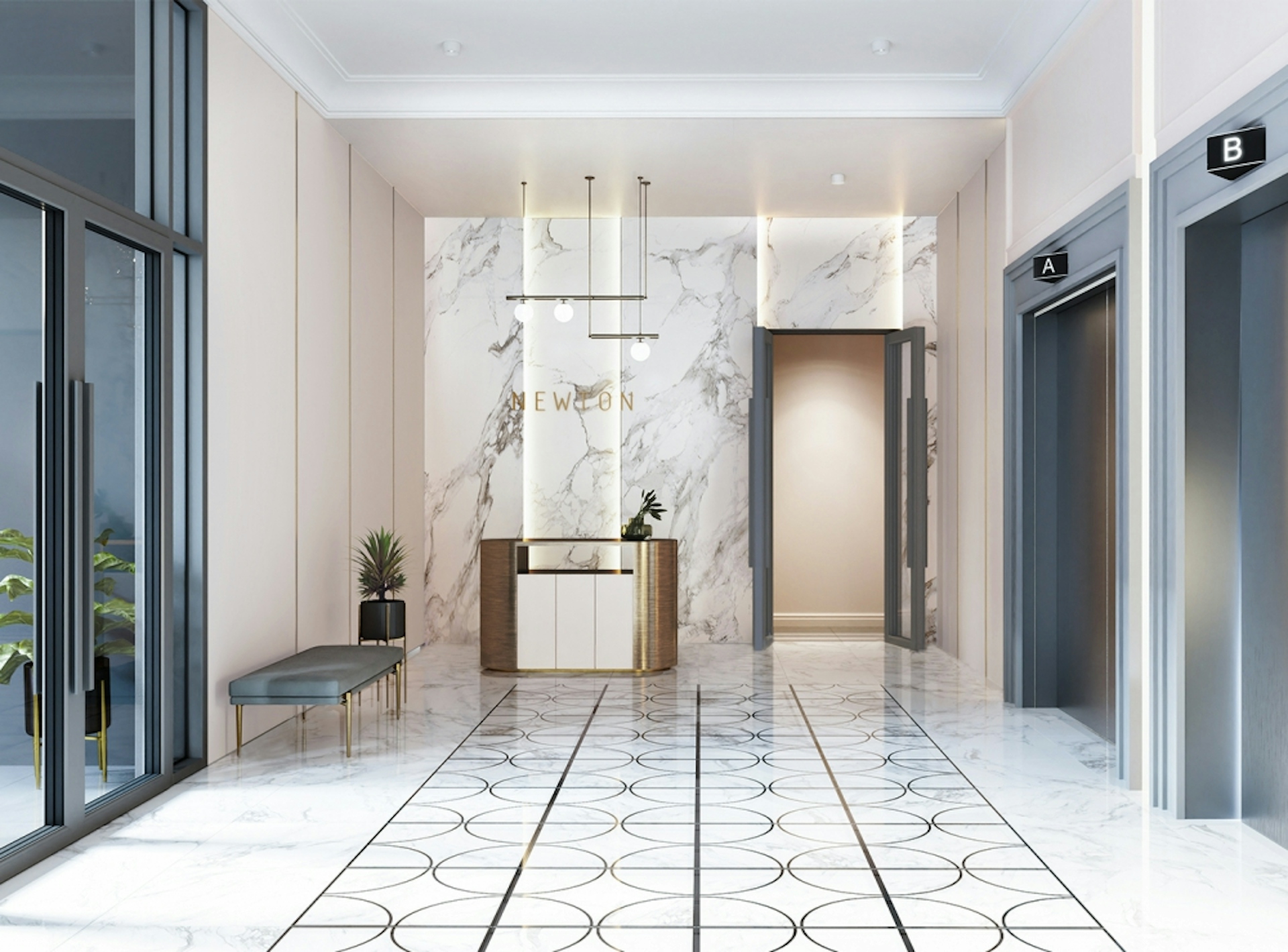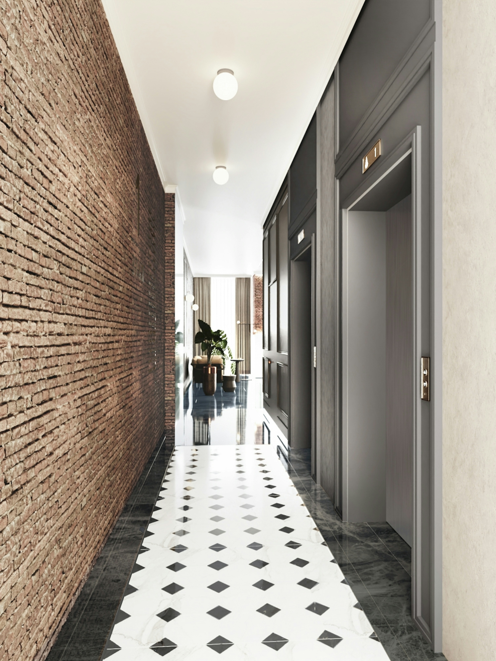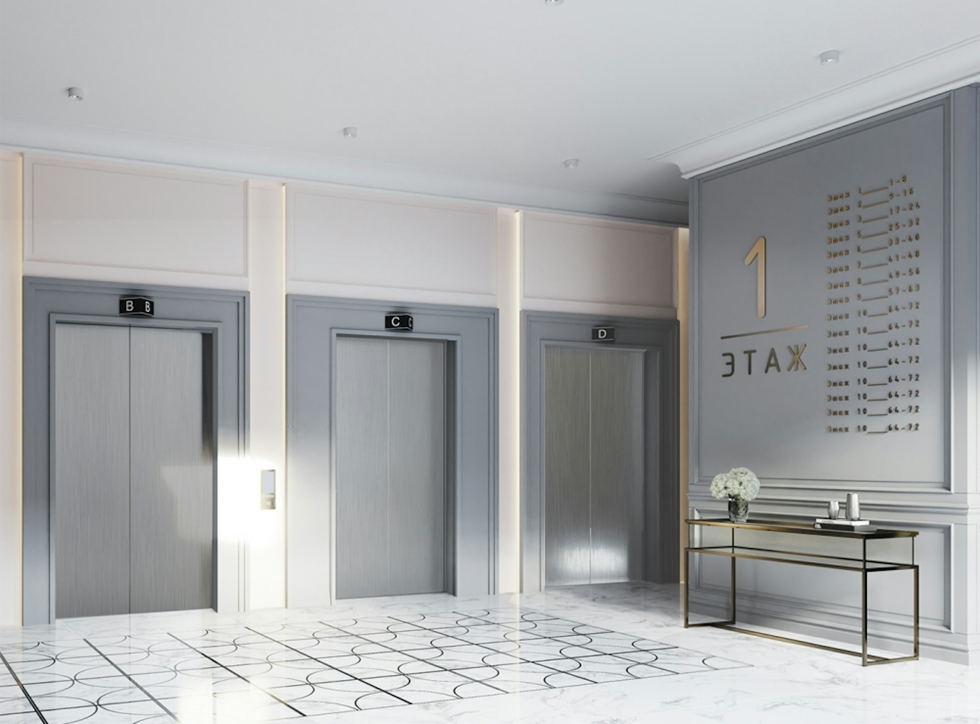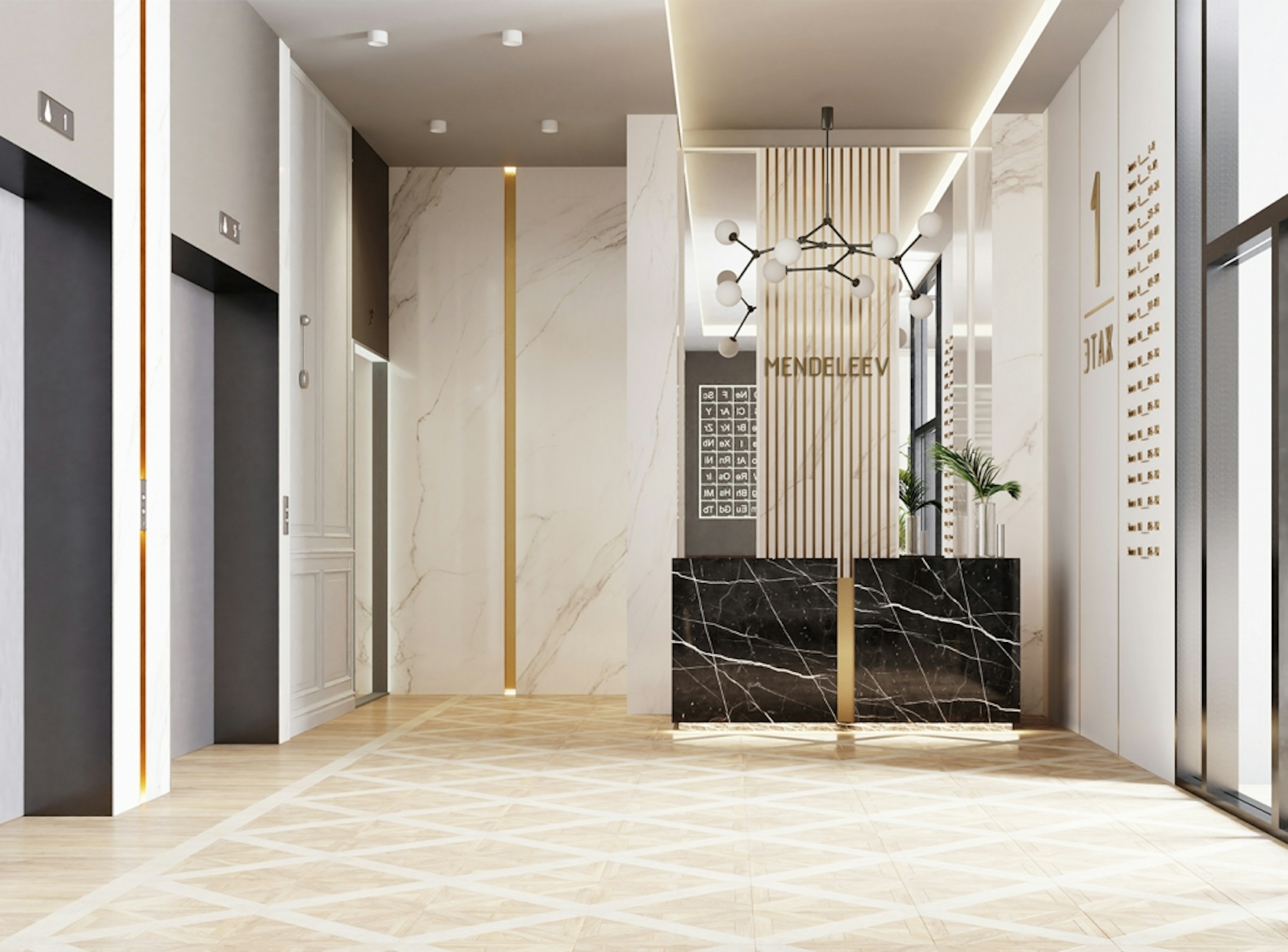 The residential complex is located in Moscow, next to the Khovrino metro station. We designed the interiors of the common areas of the complex, which consists of four 30-storey towers. Each tower is named after a scientist or researcher, which is reflected in the interior design. One of the key ideas of the project is to create a comfortable "transition" zone between the urban environment outside and a cozy home inside, in harmony with the architecture of the complex.
