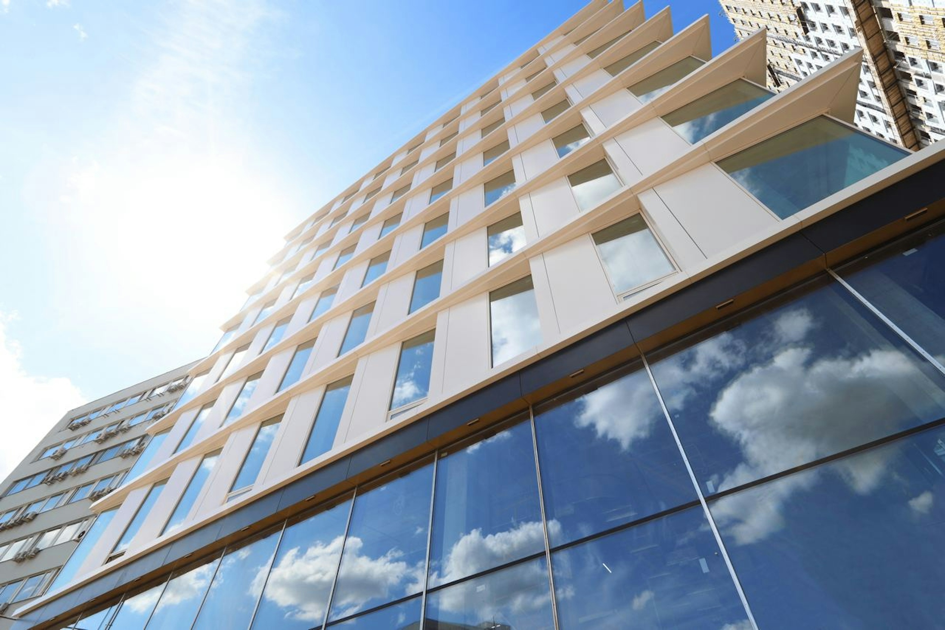 The facades are decorated with white and grey panels. The area of the facade glazing increases depending on the floor height, opening up unique views to the users of the facility.