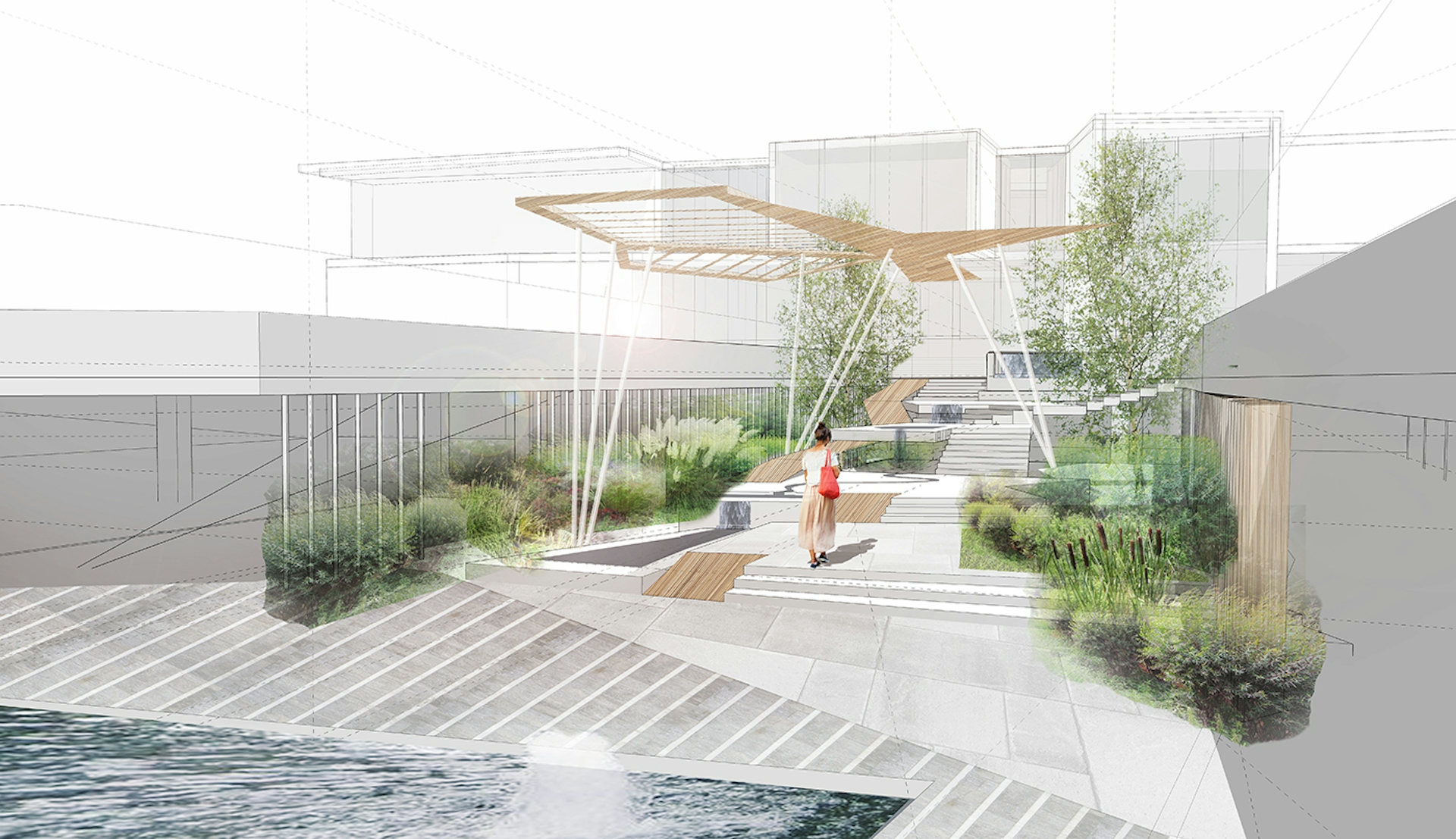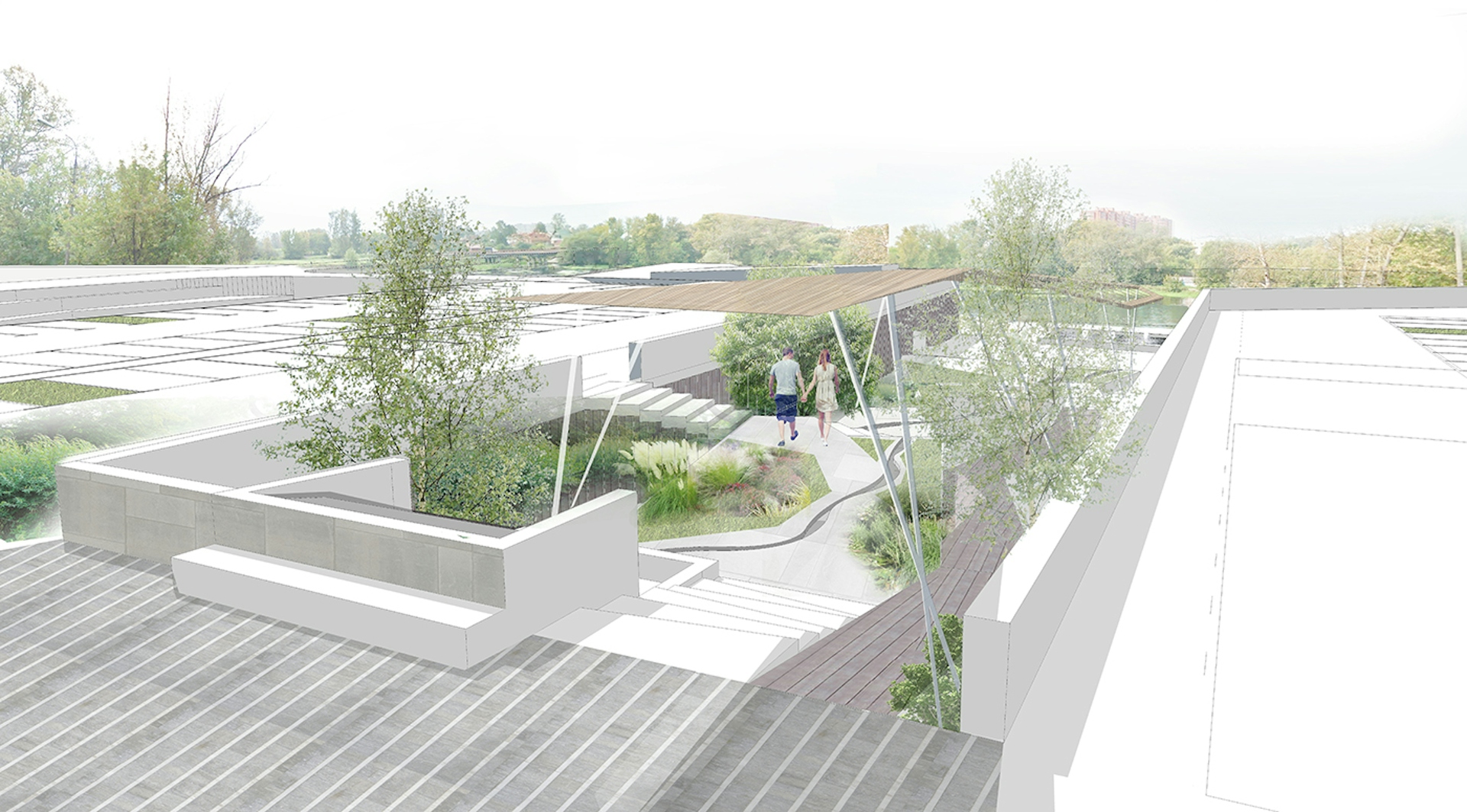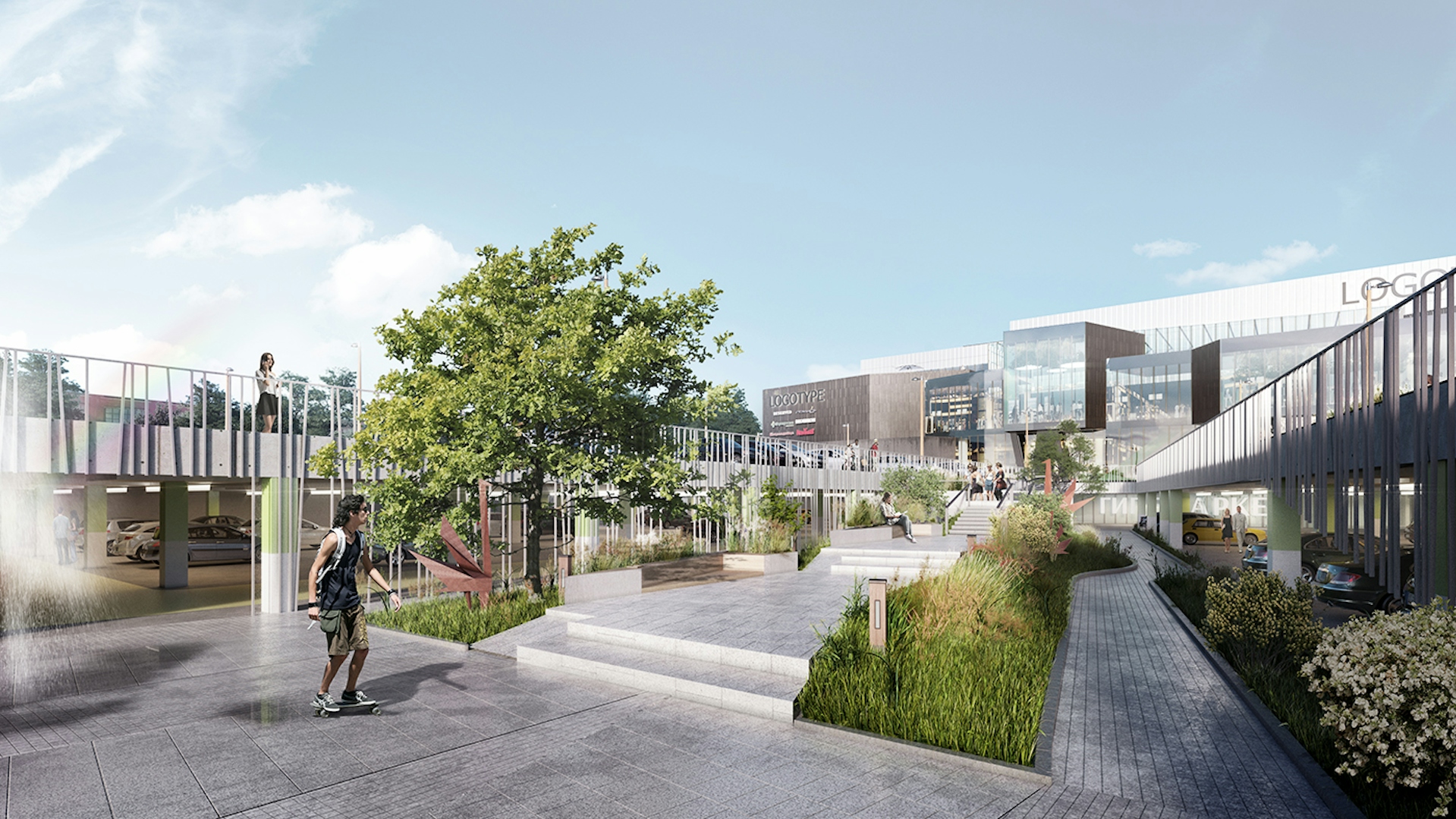 The central element of landscaping is the greenery «canyon» (open descent to the embankment from the level of the main entrance to the shopping center). This element is a landmark of the shopping complex and claims about the combination of urbanism and nature. The path laid between the two levels of parking is designed in such a way as to create an impression on the observer of wildlife. Landscape elements use perennials and grasses; it is planned to plant several mature trees with the intention to attract the viewer's attention, from all possible points of the shopping center and the adjacent territory. The slope was formed by four platforms connected by stairs. To facilitate the construction, it was decided to arrange two lower platforms on the mound, and the two upper platforms on v-shaped columns, with the possibility of passage under them. Thus, the transparency of the descent is created and open the view of the greenery and the embankment from underground floor.