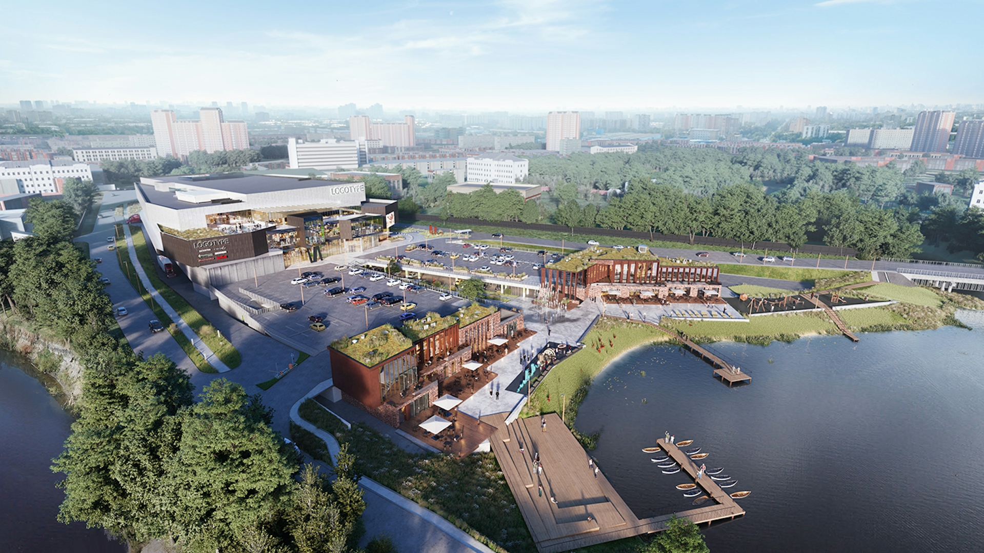 The task of the project was to find a bright self-sufficient solution and to form a unique space, inscribed into the urban context in combination with beautiful landscape features. For a holistic perception of the project, all its components are needed, so we worked in a single concept as the building itself of a shopping complex with landscaping, and the space of common areas.