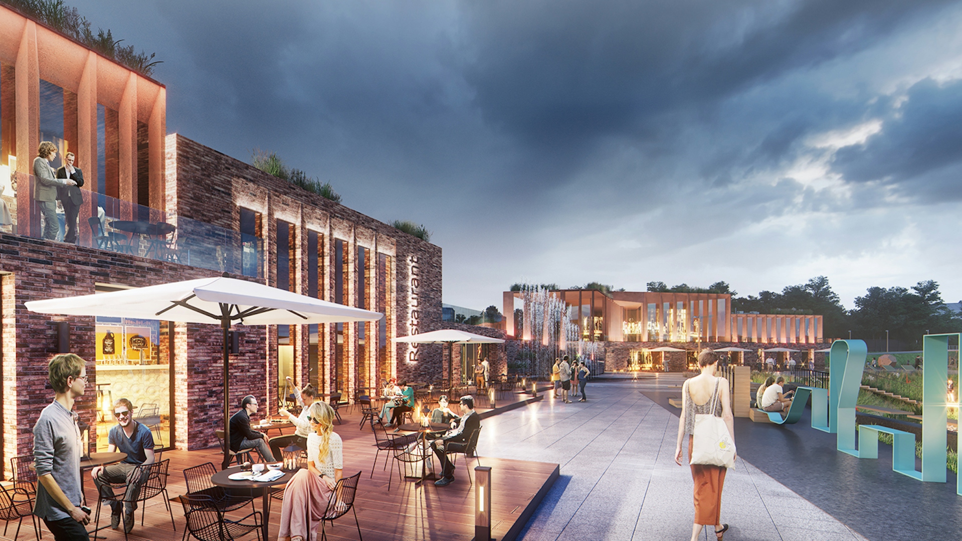 Composition of the embankment is formed by the pavilions of the restaurant and eco-market. Buildings along the arc around the embankment, creating an arcade, through which as through the front gate we are sent to the main building of the shopping complex through the green alley. In the basis for the shape formation of pavilions included the principles of Greek churches, where on a powerful stylobate erected columns. We used a brick foundation that cites the existing industrial environment and lightweight corten structures that parallel the port buildings. The hierarchy of the heights of the building forms a powerful composition, and creates a modern interpretation of the Greek Acropolis. Multilevel architectural composition of this level rises above the river, the peak of which is the open volume of the shopping center. Cubic structural forms of the building are completed by the "canyon" which is cutting the parking in two parts. The open two-level parking is organized so that visitors can make entry and exit from two streets and have direct access to the landscape corridor between the shopping center and the river. The axis of the "canyon" is directed to the central square of the embankment with a fountain. The theme of water and the smooth transition to it are emphasized by corten steel art objects. These are sculptures of birds, made like origami. This image echoes with the general idea of the project - a combination of nature with the tectonics of our time.
