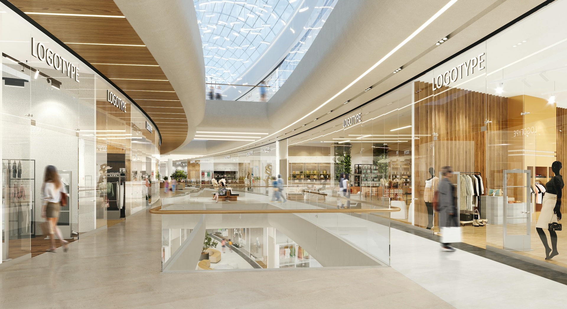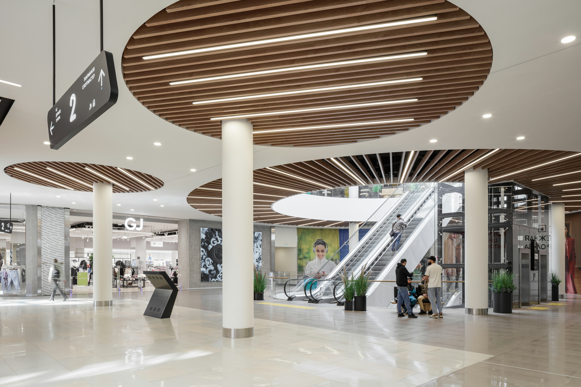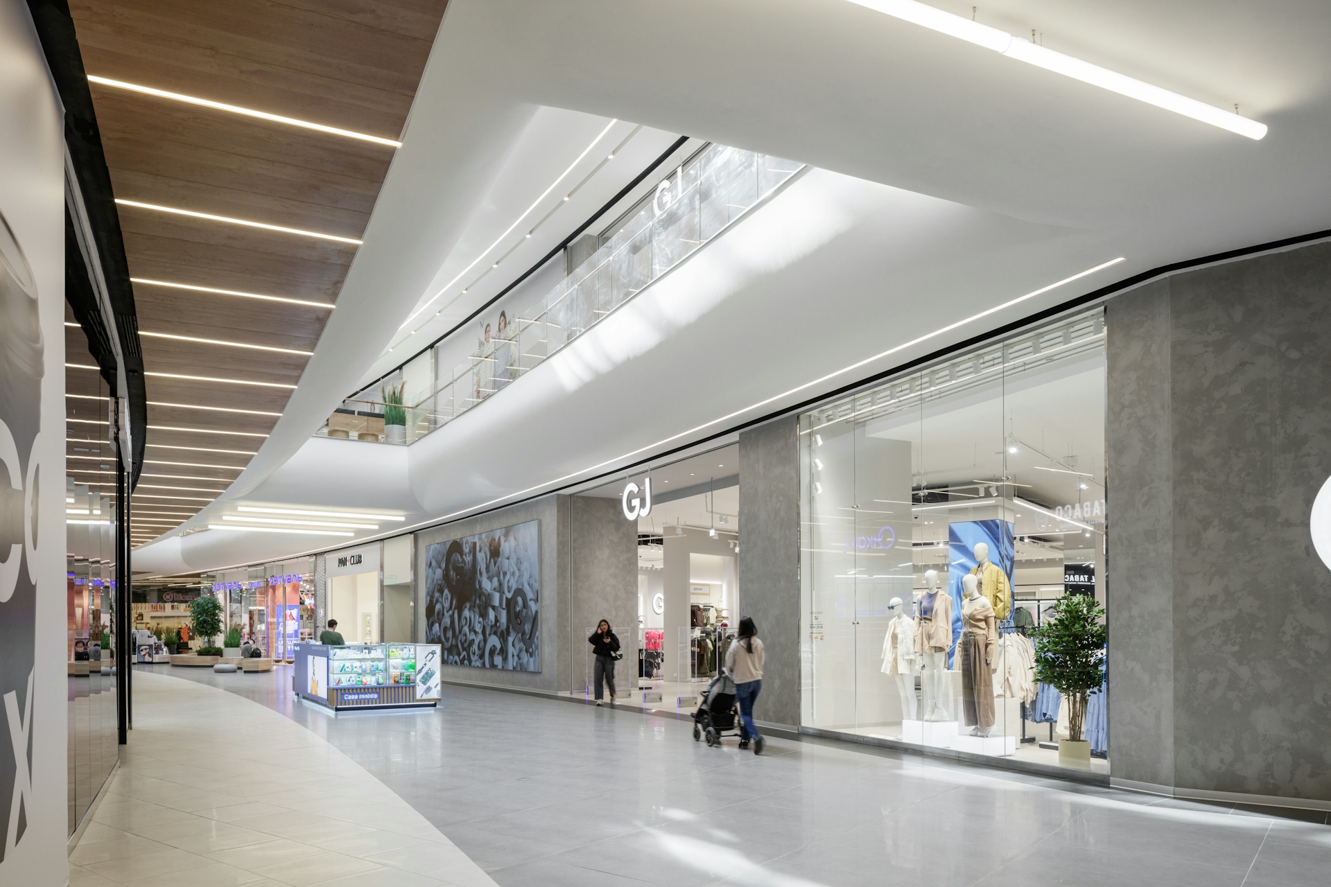 This shopping center is located in a unique spot, next to a large forest park that features diverse landscapes and functional zones. The concept of "INTERACTION WITH NATURE" invites us to consider the relationship between nature and humanity. It encompasses moments of contemplation and meditation by the water, harmony in forest walks, active sports, and social and cultural development. The idea is expressed in the design through materials that are rich and deep in texture and color, as well as the functional content of the zones. The shopping center includes three atriums, two different types of galleries, and corridors leading to restrooms, each of which offers various design solutions and techniques.