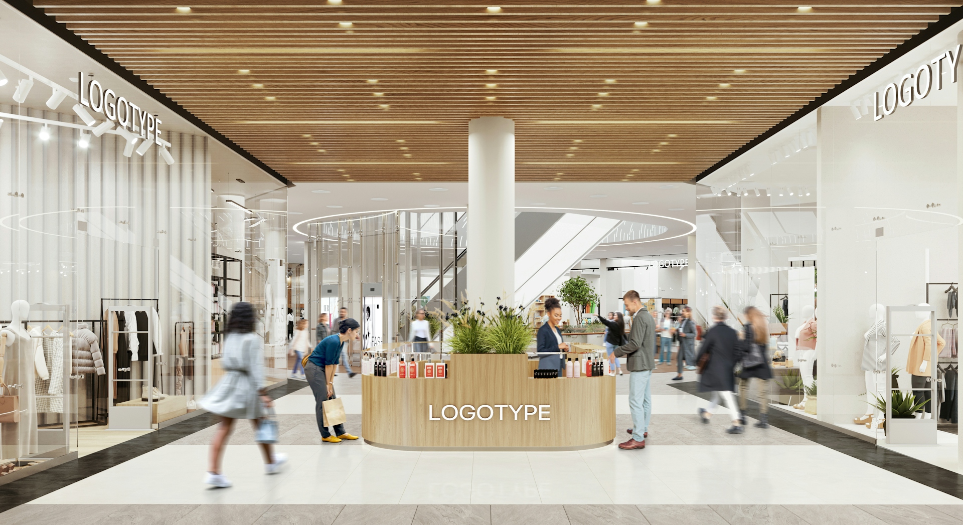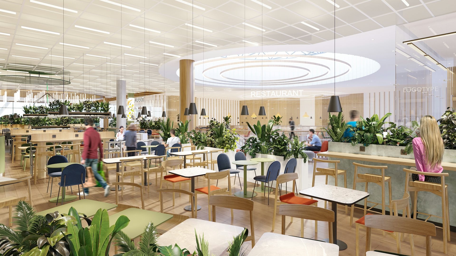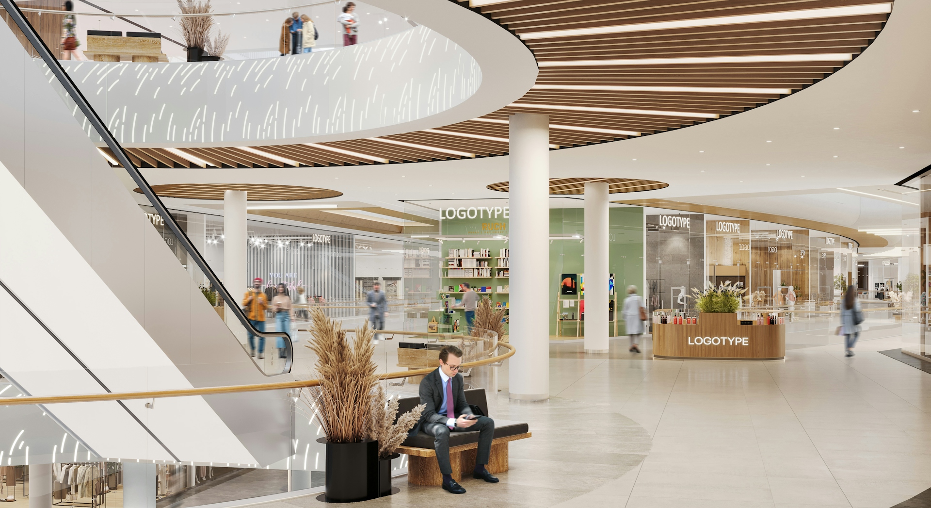 This shopping center is located in a unique spot, next to a large forest park that features diverse landscapes and functional zones. The concept of "INTERACTION WITH NATURE" invites us to consider the relationship between nature and humanity. It encompasses moments of contemplation and meditation by the water, harmony in forest walks, active sports, and social and cultural development. The idea is expressed in the design through materials that are rich and deep in texture and color, as well as the functional content of the zones. The shopping center includes three atriums, two different types of galleries, and corridors leading to restrooms, each of which offers various design solutions and techniques.