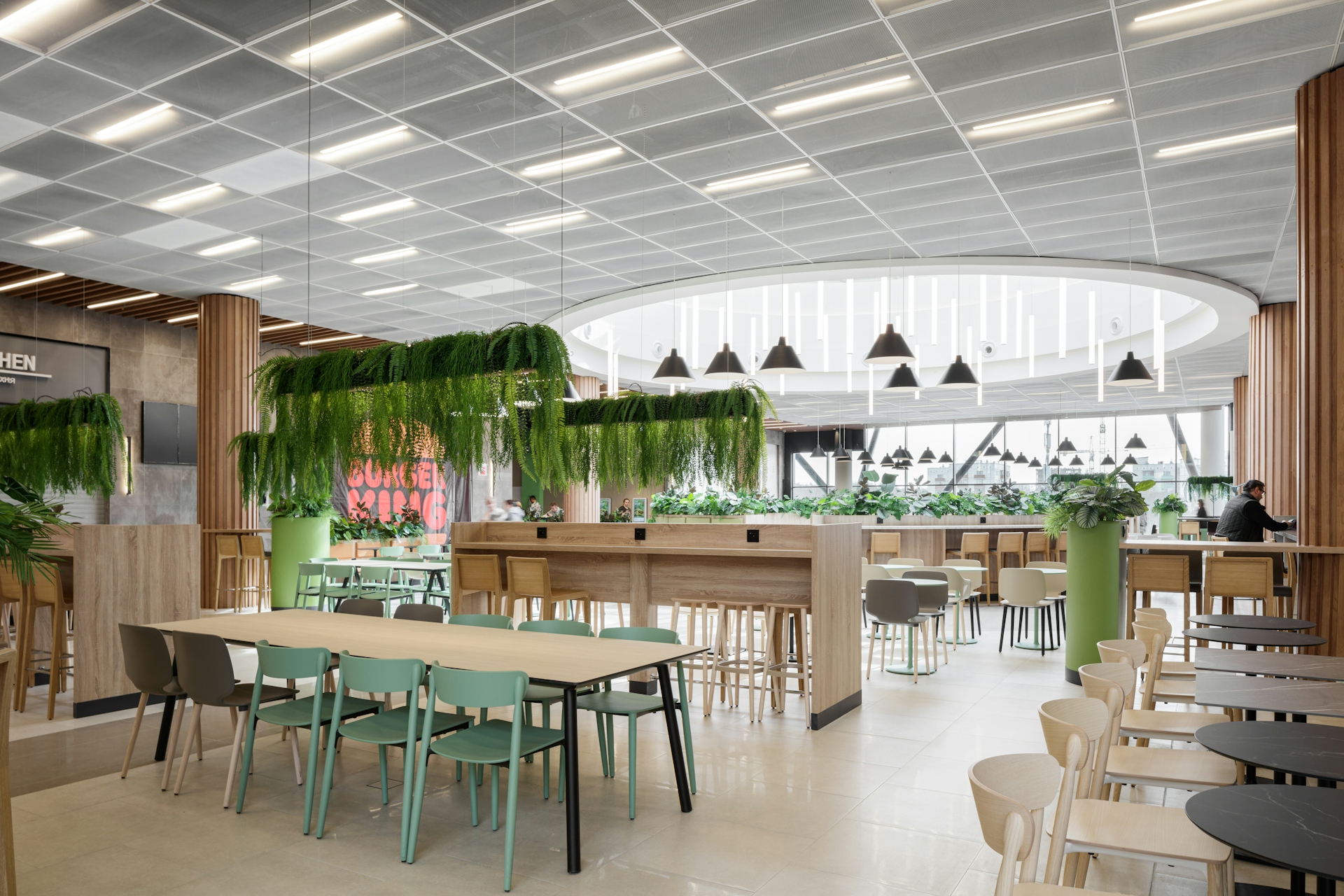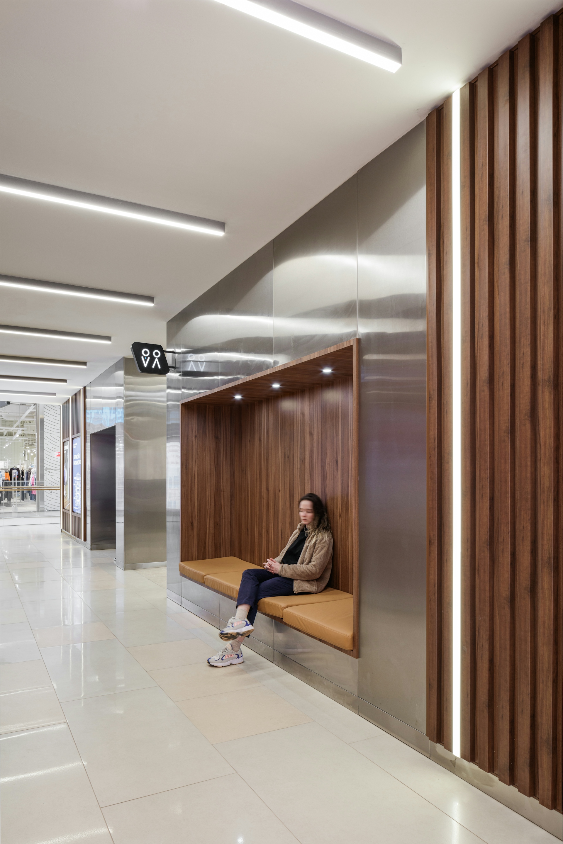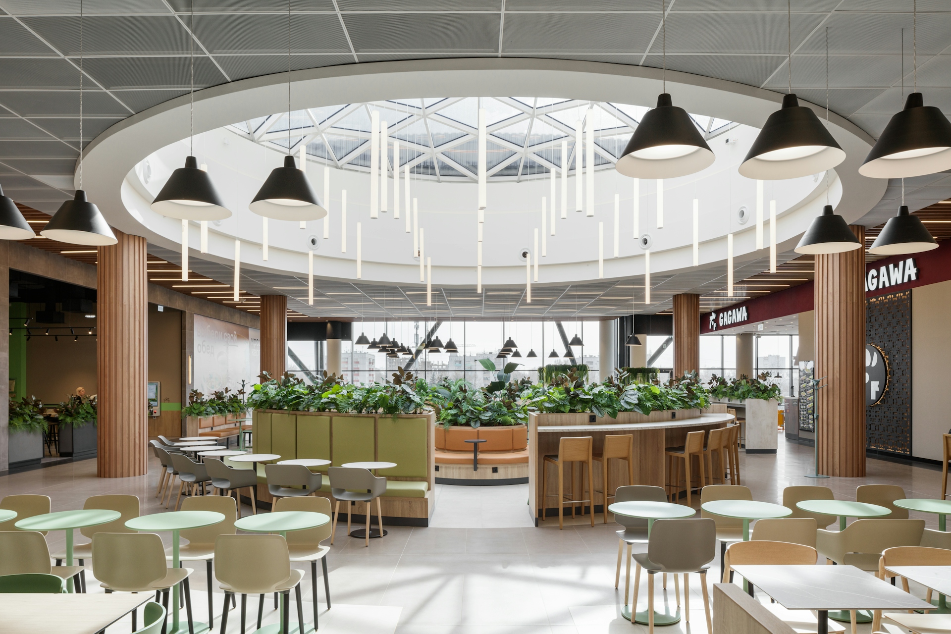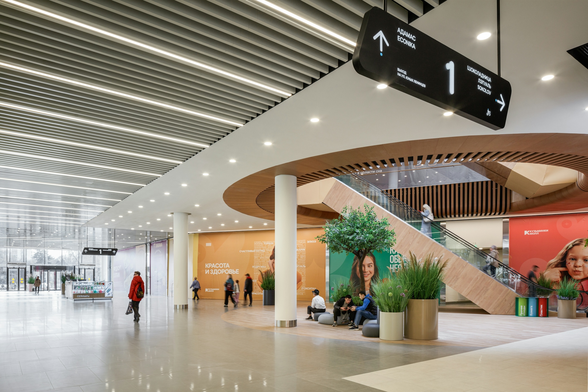For the interiors, simple and light forms with accent areas were chosen. The design is based on natural colors and materials that create an atmosphere of comfort and naturalness. The glass shop windows are complemented by wooden panels, and the lighting is integrated into the perforated ceiling. Natural light is provided through several atriums and glazed roof sections. For the relaxation areas, contrasting design solutions have been selected—niches in the walls upholstered in different shades. Contrast in design is also present in the food court and children's spaces. The food court is located in a scenic area with facade glazing, and its color palette features shades of natural wood combined with greenery, creating the impression of a continuation of the "Kuzminki" park within the project.