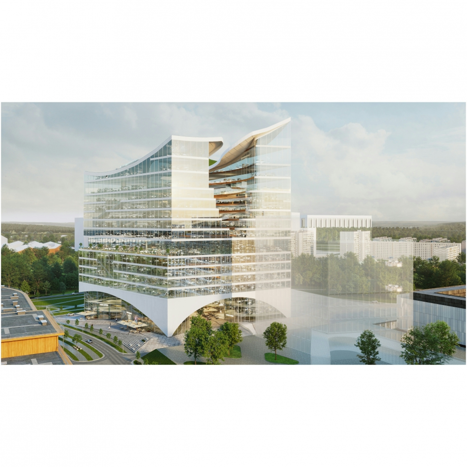 For the new office center, the R&D center in Skolkovo cluster, we have created a concept design of architecture with an unusual curved shape.