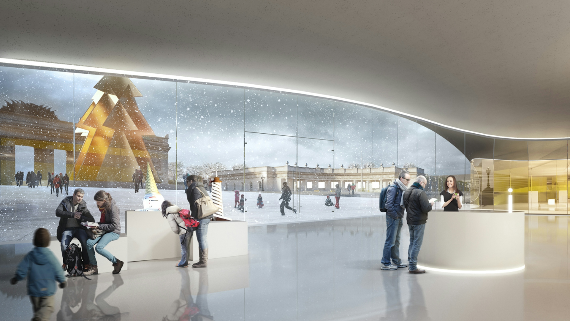 The front of Arch square we see as point of pride and history and symbol of Gorky Park. We suggest enriching the seasonal art expositions, with introduction of circular movable platform. Once without large scale art presence, the platform will turn, bringing the feeling of merry-go-round fair atmosphere. The square is a fair ground, braced to respect the monumental view on the Arch. In the night time the movable circular platform will be a stage for use of the holograms techniques / media sculptures. We will bring the carousel.