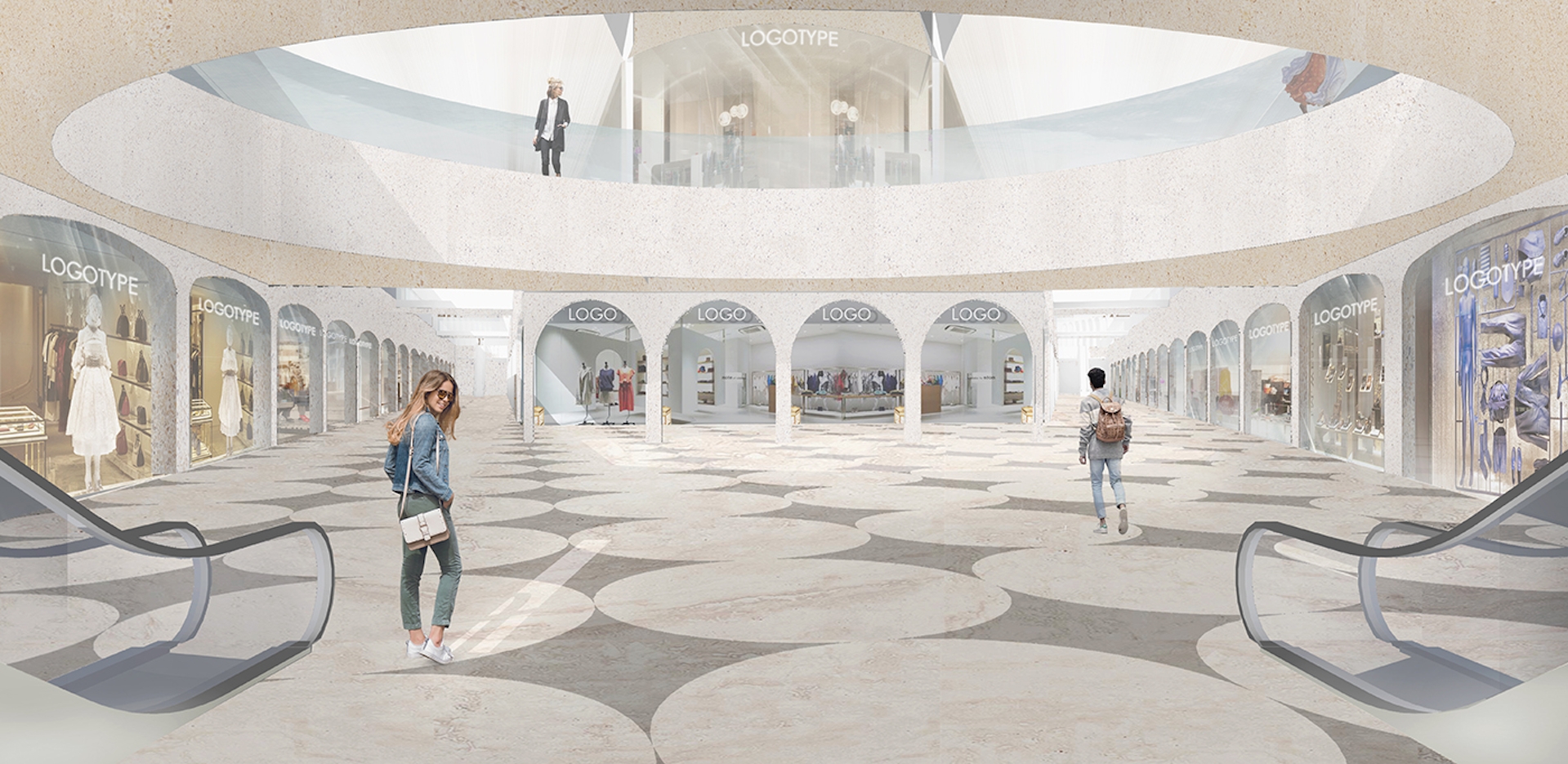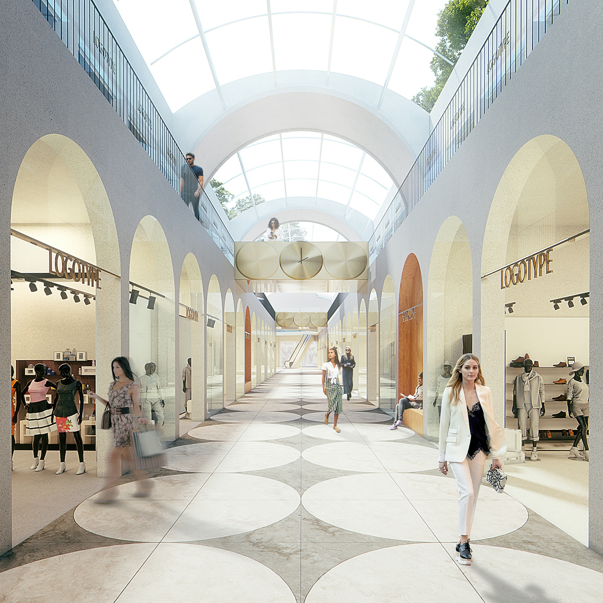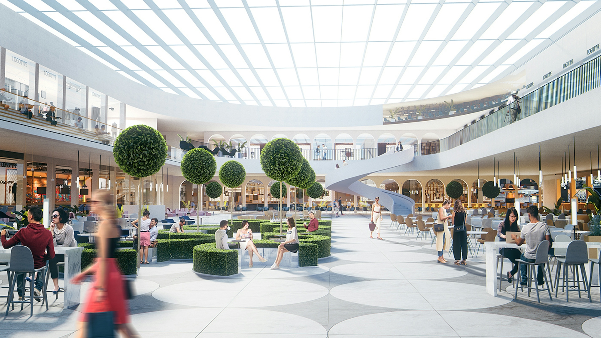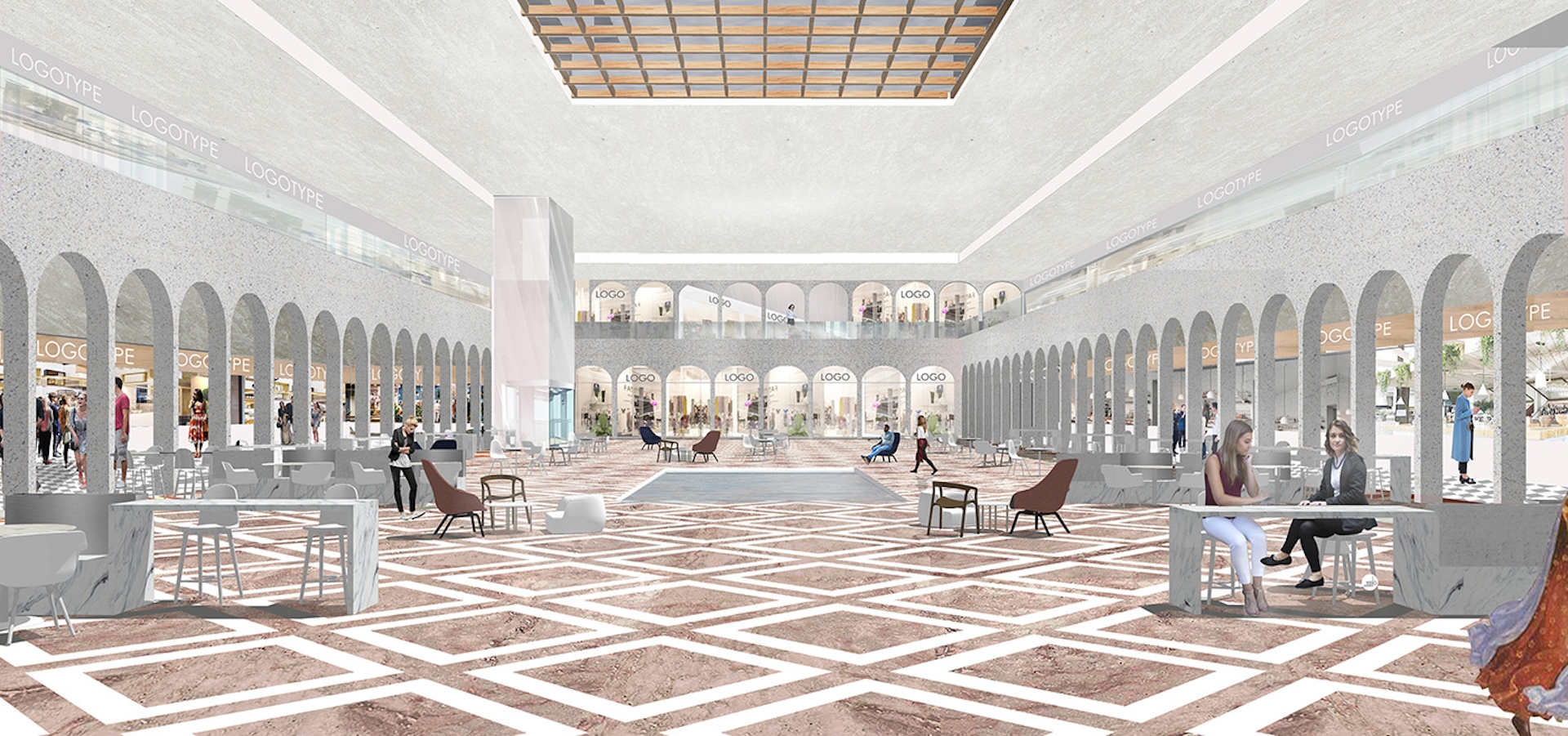 We use modern materials as glass on the ceiling, eco-friendly wood, arches material – agglomerate; black colored metal, led-lighting to create modern look space with iconic design. Costumers would feel themselves in retail galleries as in classical passages and food court would remind them old city square.