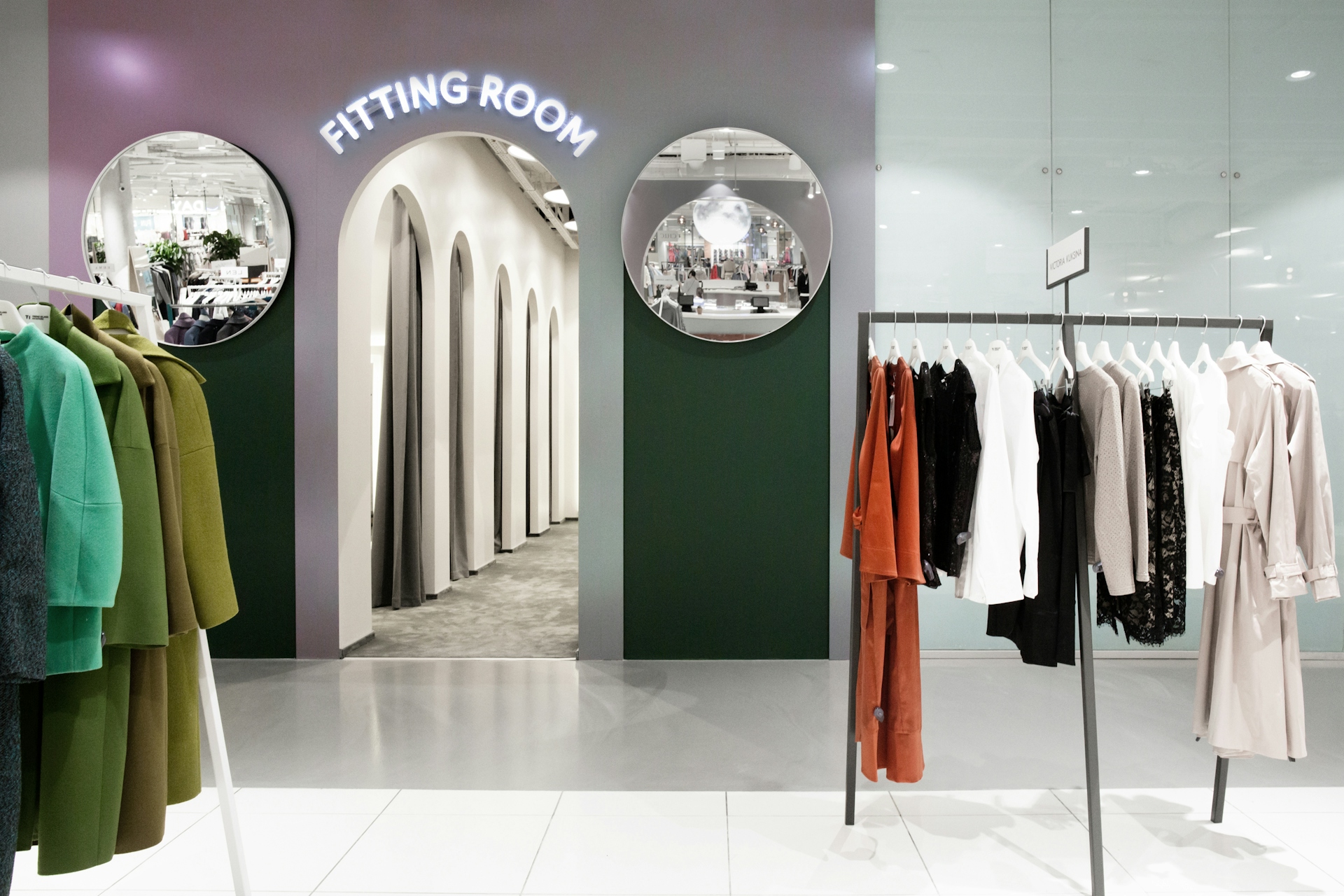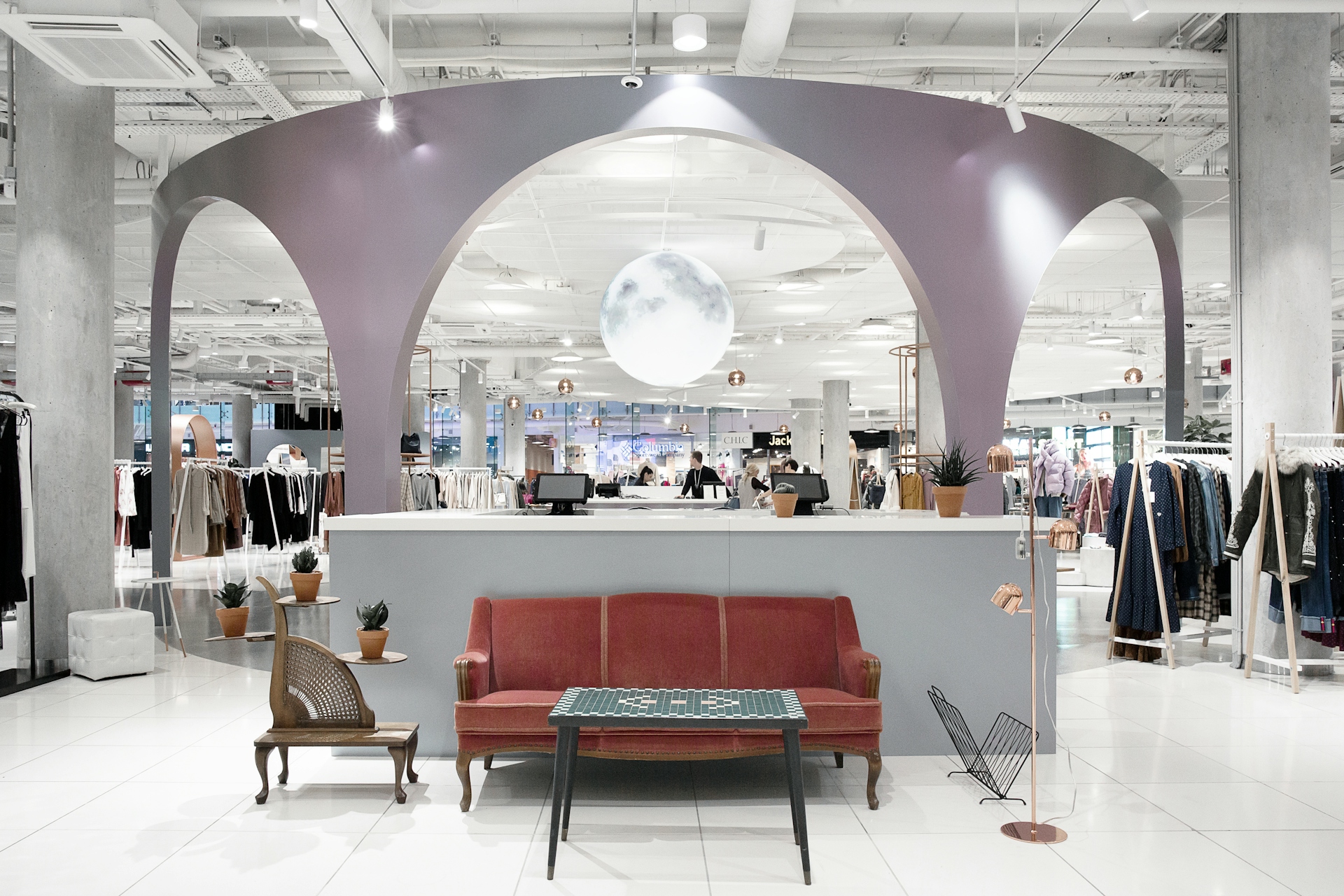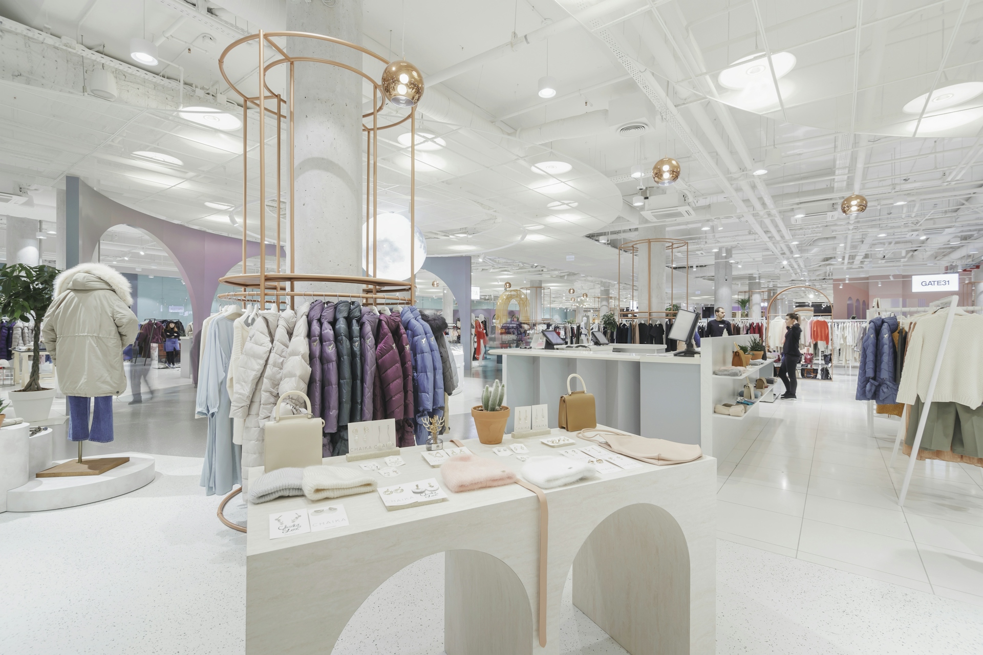 The department store's space is designed in calm tones: soft pink, dusty lilac, and gentle white (the chameleon material shimmers with various shades of pink, gray, and lilac). Rose gold is also used in the interior, creating a cozy and elegant atmosphere. The central art installation, "Moon," was handmade in shades of dawn and sunrise, with a pop-up area for products located underneath it. The functionality of the space is achieved through thoughtfully selected details and solutions: for instance, the massive columns have become functional objects thanks to the circular rails for clothing around them. Additionally, with the help of lightweight, mobile transforming platforms, retailers can create any total looks composition within the store's space.