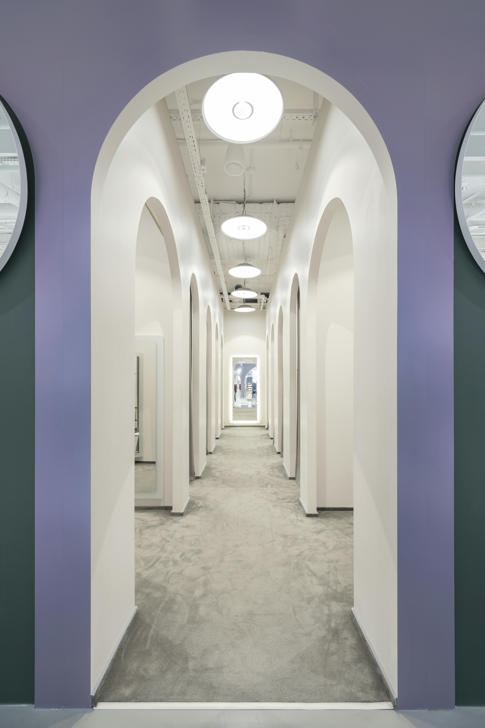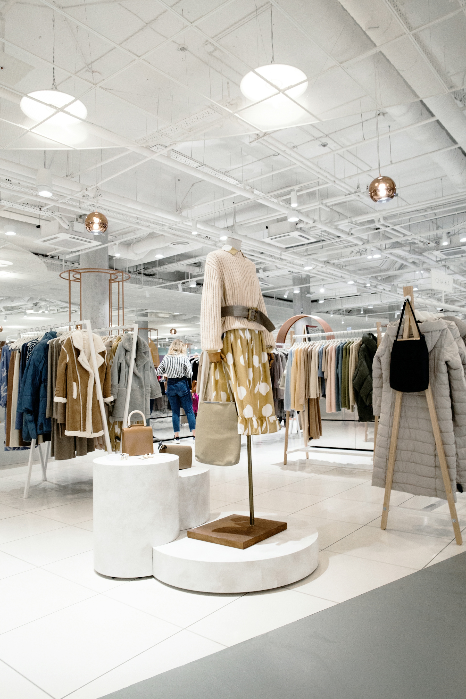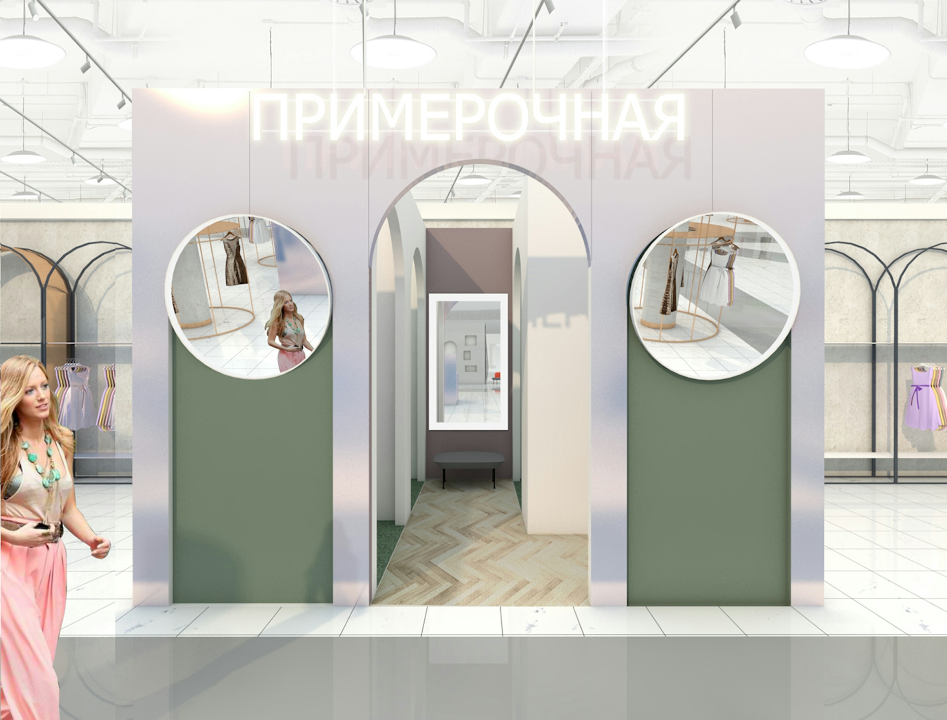 The department store's space is designed in calm tones: soft pink, dusty lilac, and gentle white (the chameleon material shimmers with various shades of pink, gray, and lilac). Rose gold is also used in the interior, creating a cozy and elegant atmosphere. The central art installation, "Moon," was handmade in shades of dawn and sunrise, with a pop-up area for products located underneath it. The functionality of the space is achieved through thoughtfully selected details and solutions: for instance, the massive columns have become functional objects thanks to the circular rails for clothing around them. Additionally, with the help of lightweight, mobile transforming platforms, retailers can create any total looks composition within the store's space.