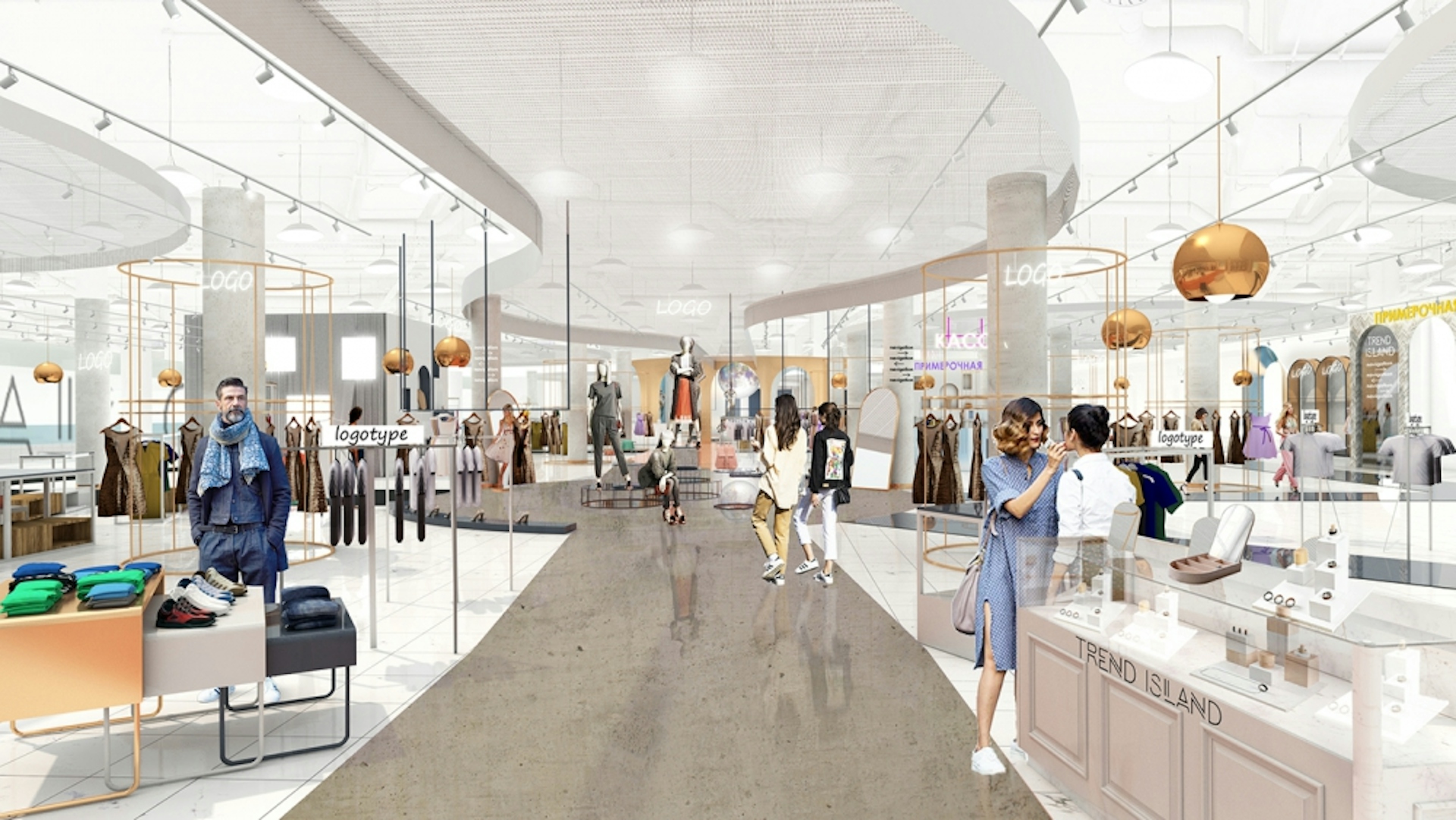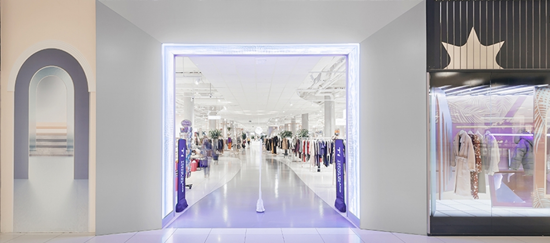 Trend Island is a department store located in Moscow in the Aviapark shopping center, one of the largest shopping centers in Europe. The first phase of this fashionable space, built in 2016, has already become a landmark project for the Aviapark shopping center and for Moscow as a whole. Therefore, one of the tasks in developing the design for the second phase was to reinforce the overall concept and brand of the department store. We created a "legend" that the new phase of the project serves as a reflection in a magical mirror of the existing "sunset island" – the second half of the department store becomes the "island of the rising sun."