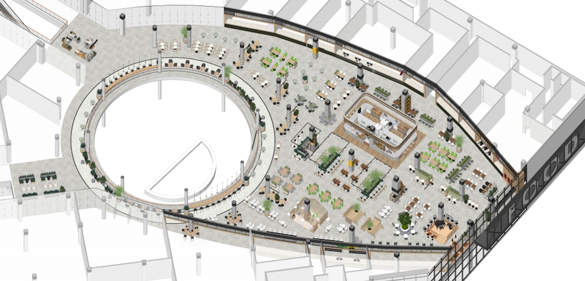 In the guests’ areas we also used elements of the corner style - the texture of concrete and wood, and supplemented them with artificial greenery, convenient in cleaning. The seating areas are designed for different groups of visitors, provide square and rounded tables around columns and atrium, as well as bar and classic seating. "Communal" tables for 8 people are in the European type: benches are provided for visitors. We also have saved the existing furniture for guests partly and re-use them in new design concept. Each visitors’ zone is equipped with sockets - so that you can not only have a snack in the foodhall, but also work on your laptop, or charge your phone. It was possible to isolate the groups with open shelving with the texture of wood with greenery. In the soft areas of the foodhall, we have provided CORE Objects’ furniture from the "On Legs" series, as well as poufs and floor lamps: such places will be ideal for a leisurely cup of coffee. Rich green and terracotta accents in the interior are placed with the help of upholstered furniture textiles.