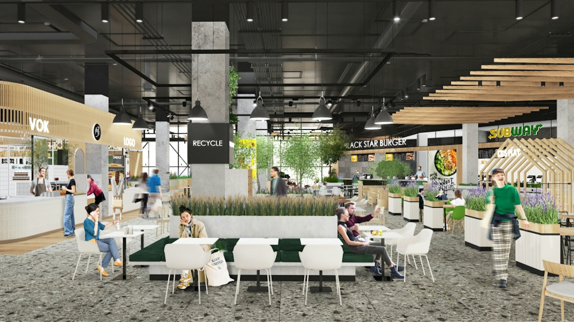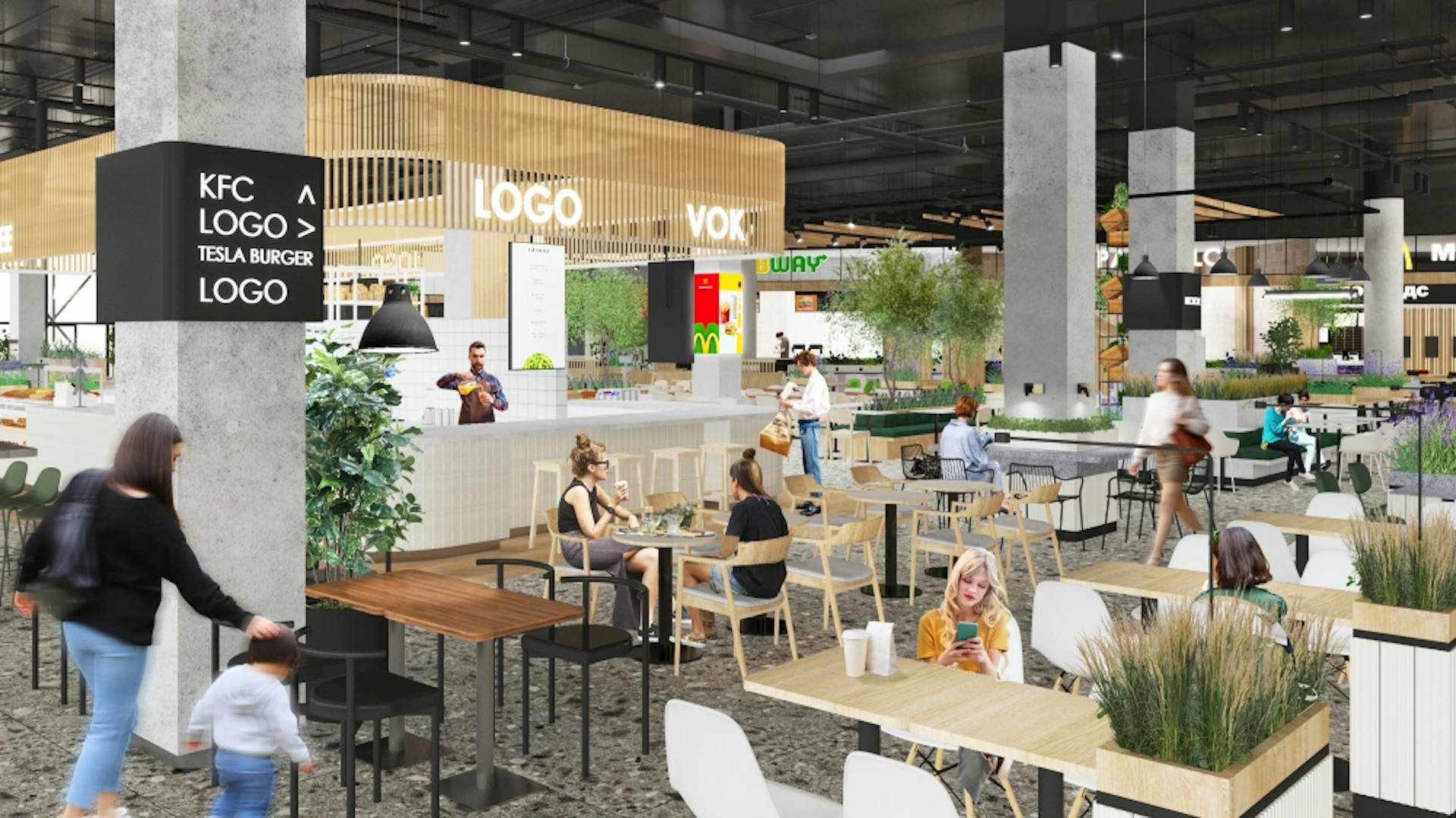The concept of a foodhall has transformed the usual perception of food in shopping malls. Now the gastronomic experience is no less important for the shopping process, which means that the interior of the food hall should have a long pastime and a variety of activities. The foodhall at the Tyumen City Mall is becoming not just a place for lunch on the run, but a full-fledged event space. As part of the new functionality of the foodhall, we have added a stage for events, a kid's playroom, a lounge area, as well as a market with natural greenery. Among the tenants of the foodhall there are both international fastfood giants and local food brands, so it was important to give the common style of placement and design of signage, as well as areas for orders. Countertops with a concrete texture and stylized columns also open up the possibility of placing media screens with advertising information of tenants. For the decoration of the walls and ceiling, we chose a shade of dark graphite. The contrasting solution in the design of the corners - slats made of light wood - made it possible to hide the technical equipment of the tenants from visitors. Structures with a light wood texture are also used as decorative elements of the ceiling. The columns of the foodhall are made in decorative plaster for concrete – we have carefully placed all technical areas behind them, including hygiene areas. The lighting of the foodhall was created with the help of tracking lamps and suspended structures – this is how we visually increase the height of the space. In the stage area, we used additional spotlights for a better view.