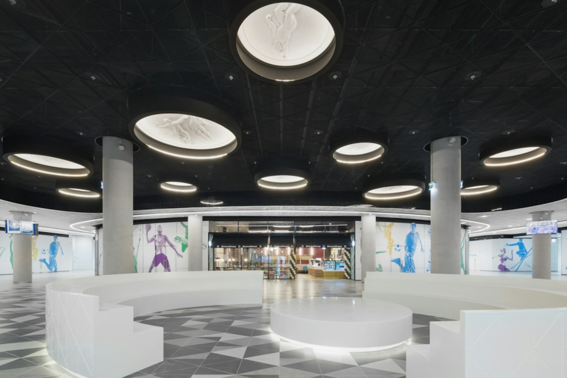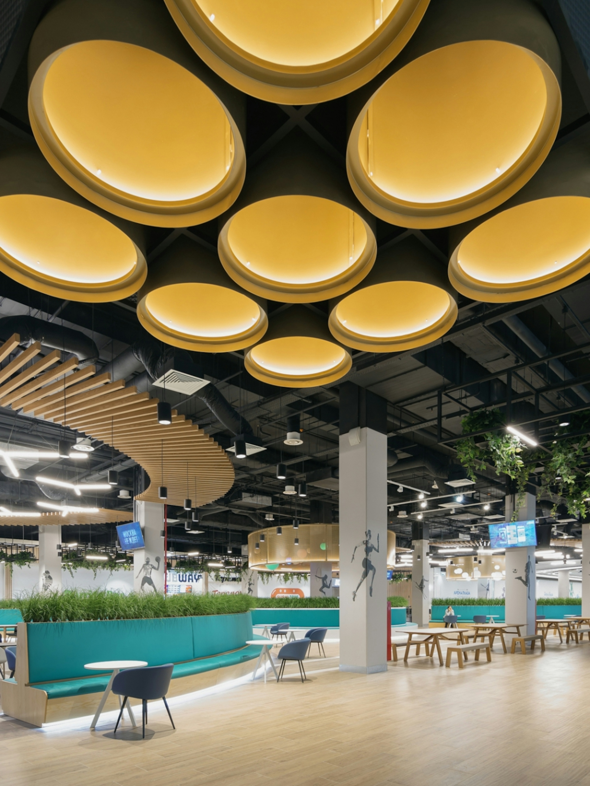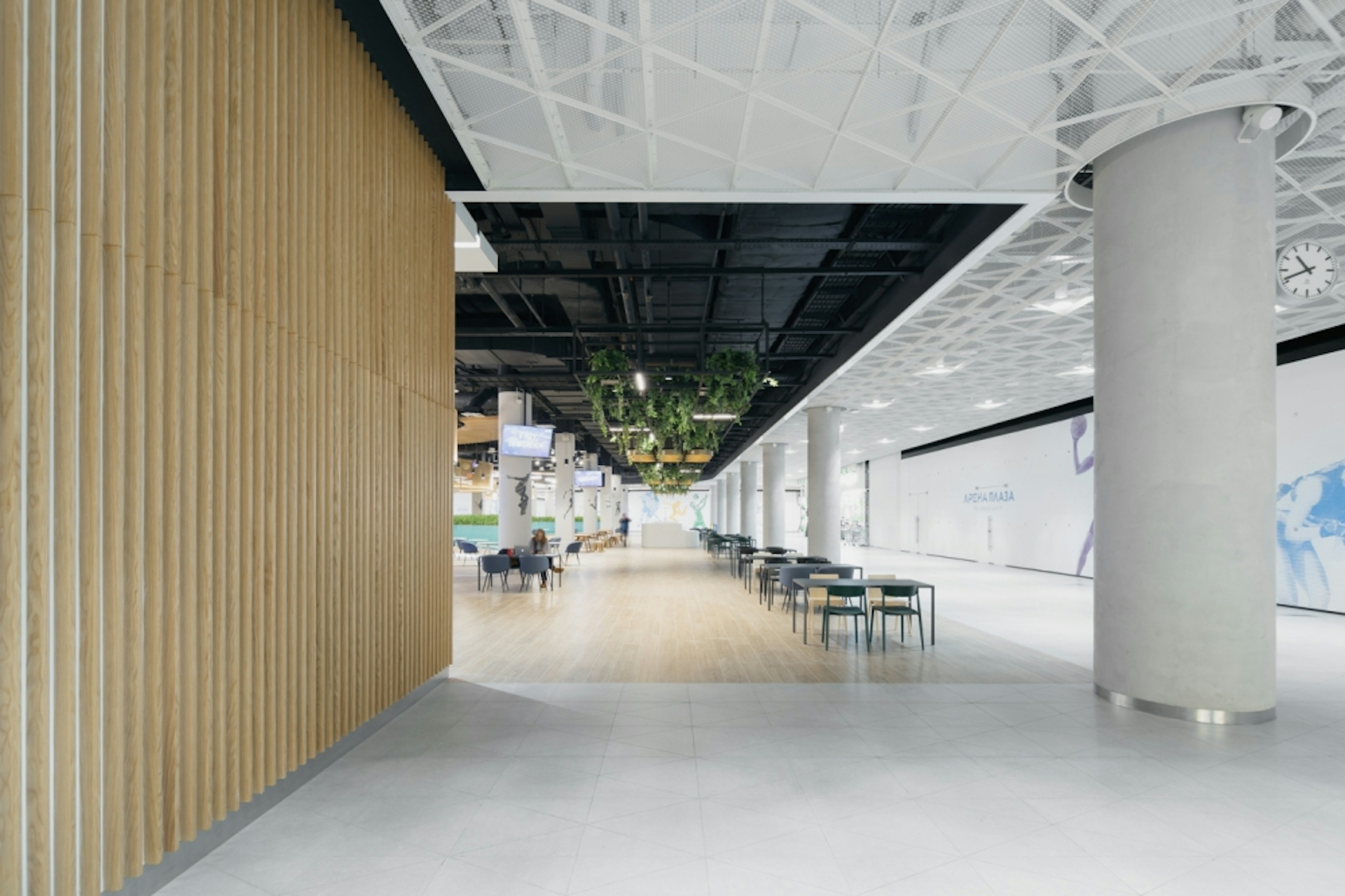 The shopping center, two sports arenas under one roof near the Sports Academy, fitness club and Spa, modern hotel Hyatt Regency Moscow and residential district provide obvious advantages comparing to shopping centers on the Lengradskoe Highway up to Sheremetyevo. We let the green park enter the interior design, united the past and the future. Legendary places, dynamic sports life was symbolically reflected in each detail of our retail area. The Arena Park shopping center has an interior as unique as all the components of the complex itself with a bit of fashion, style, ecology, sport, and history. We all understood that the interior of this shopping center had to be unique as well. We decided to base its design story on three pillars: history, sport, and the park. And keep it distinctive with a slight touch of hedonism.