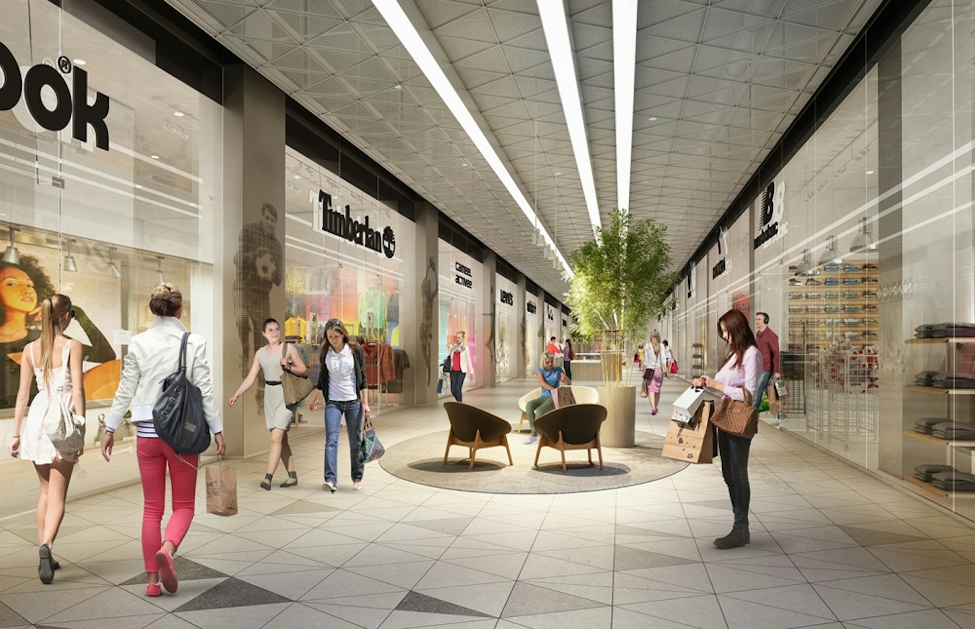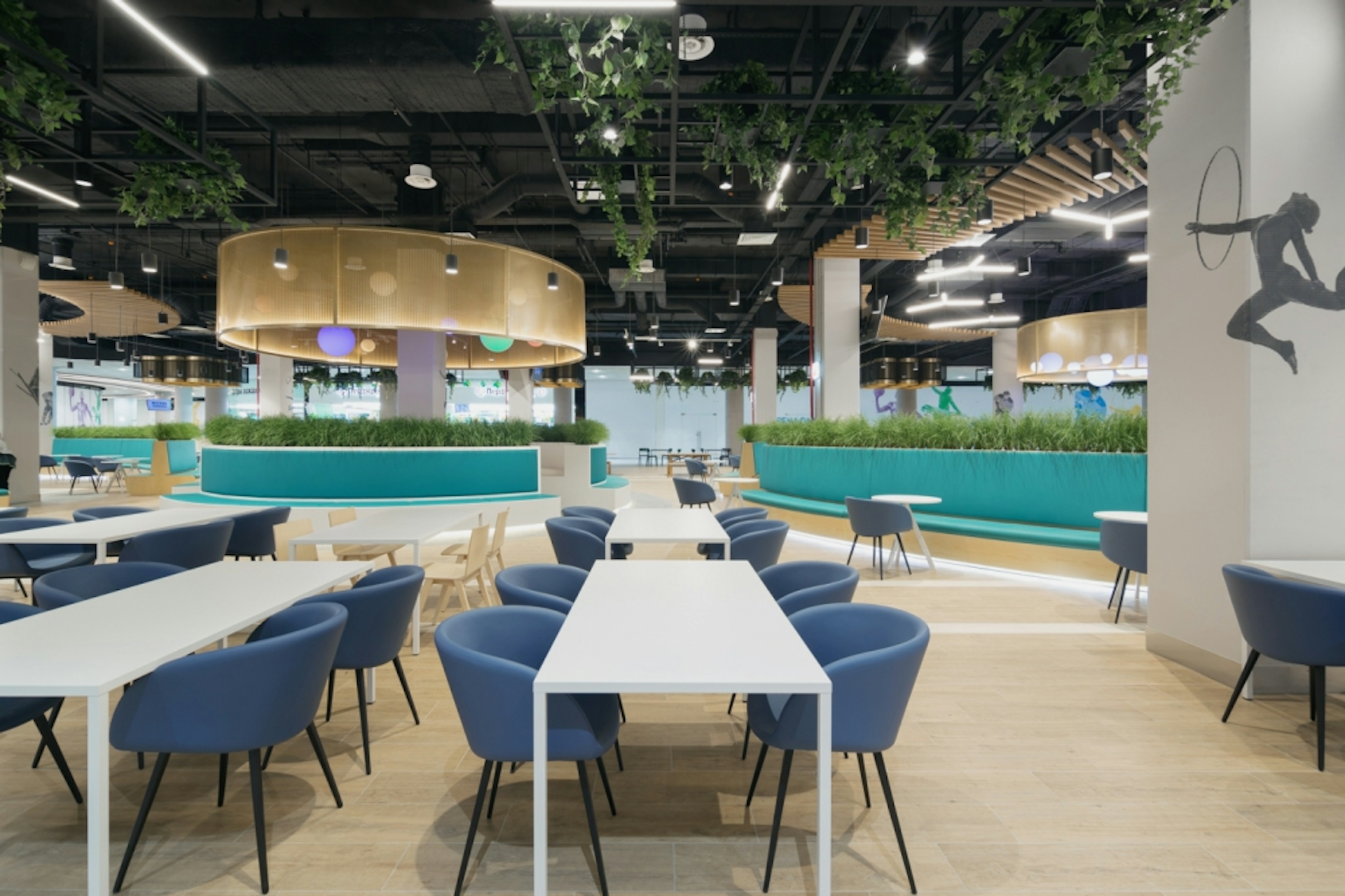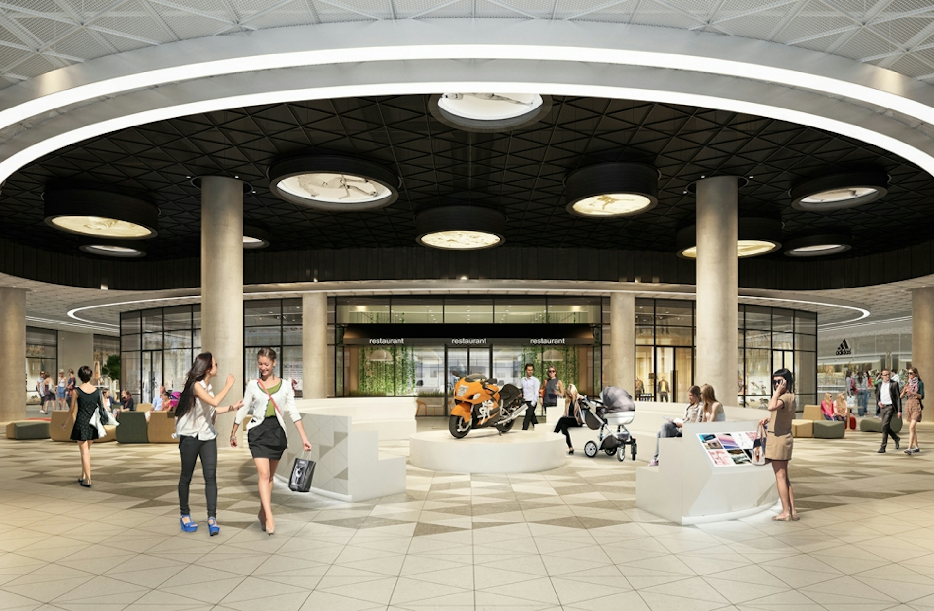 The shopping center, two sports arenas under one roof near the Sports Academy, fitness club and Spa, modern hotel Hyatt Regency Moscow and residential district provide obvious advantages comparing to shopping centers on the Lengradskoe Highway up to Sheremetyevo. We let the green park enter the interior design, united the past and the future. Legendary places, dynamic sports life was symbolically reflected in each detail of our retail area. The Arena Park shopping center has an interior as unique as all the components of the complex itself with a bit of fashion, style, ecology, sport, and history. We all understood that the interior of this shopping center had to be unique as well. We decided to base its design story on three pillars: history, sport, and the park. And keep it distinctive with a slight touch of hedonism.