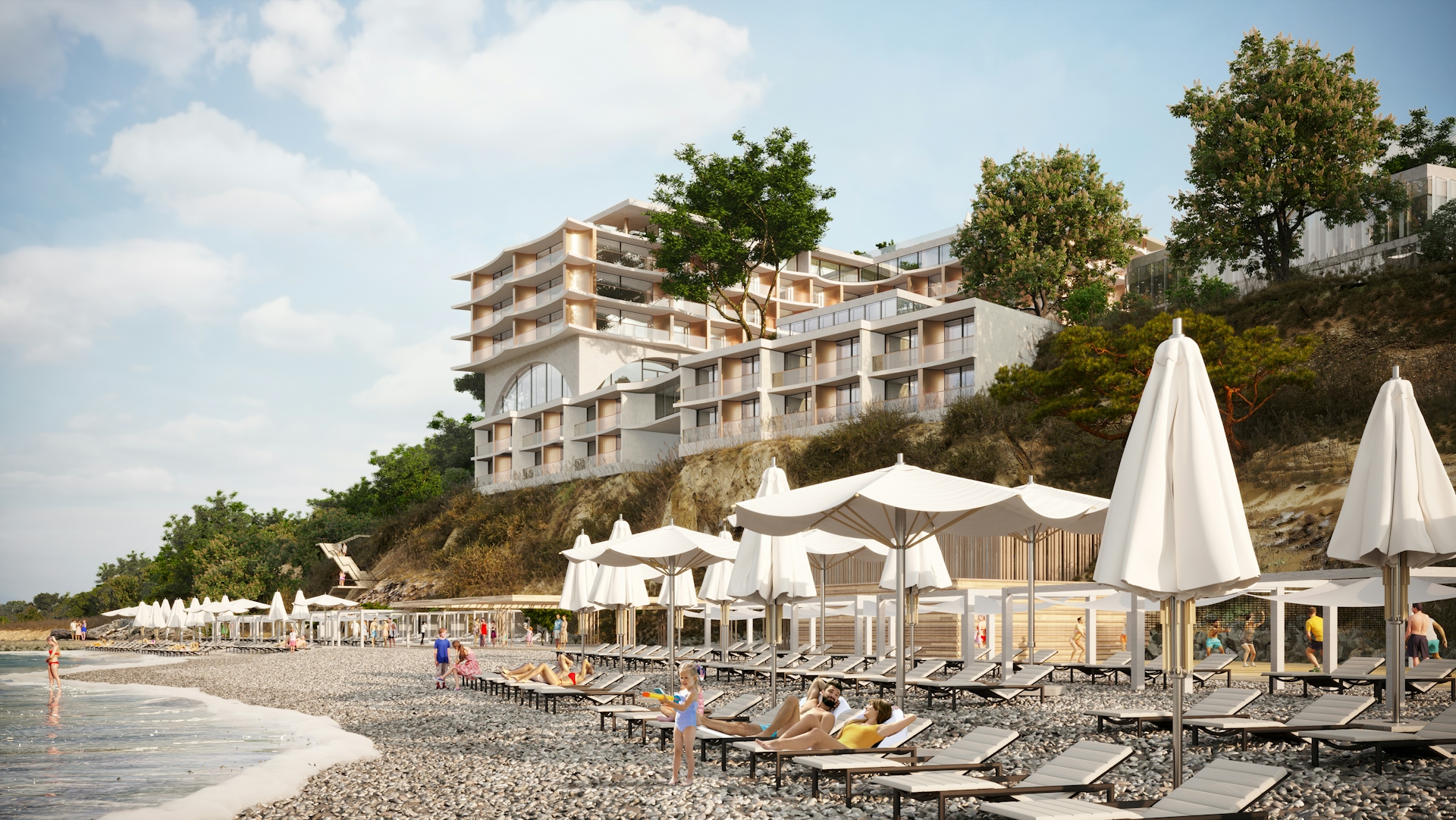 Принцип создания пространства - «Видеть, но не быть на виду». В контакте с природой, мы по-настоящему расслабляемся и освобождаемся, наше восприятие легко переключается, отдыхает нервная система и появляется внутренняя гармония. Расположение и формообразование зданий строится с видами на воду и кроны деревьев. Гостиничный комплекс рассчитан на 120 номеров отеля 5 и 685 номеров в трех корпусах отеля 4*. Общее расчетное количество машиномест в подземном и наземном паркинге – 280. В состав проекта войдет собственная инфраструктура – велнес-центр с выплывным бассейном, а также рестораны, бары и общественные зоны.