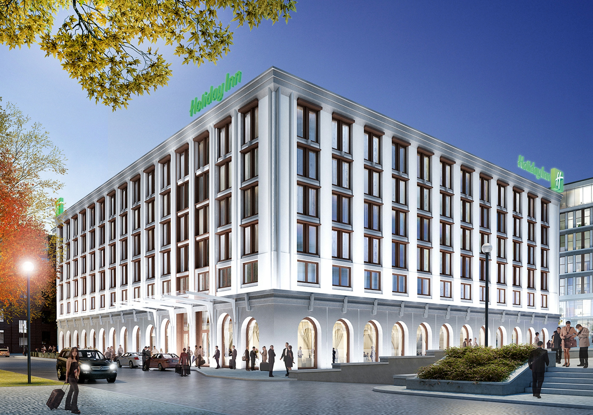 Входная группа следует через существующий старый парк, виды на который открываются из половины из 200 номеров, преимущественно расположенных на верхних этажах здания отеля. За отелем расположено офисное здание с панорамным остеклением. Здесь происходит разделение функций и визуального ряда фасадов: на цоколь, остекленный фасад и пространство под кровлей. Высокие окна оформлены вертикальными деревянными жалюзи снаружи фасада и внутренними солнцезащитными жалюзи в здании. Полностью остекленный первый этаж обеспечивает прямой вид на окружающий благоустроенный ландшафт.