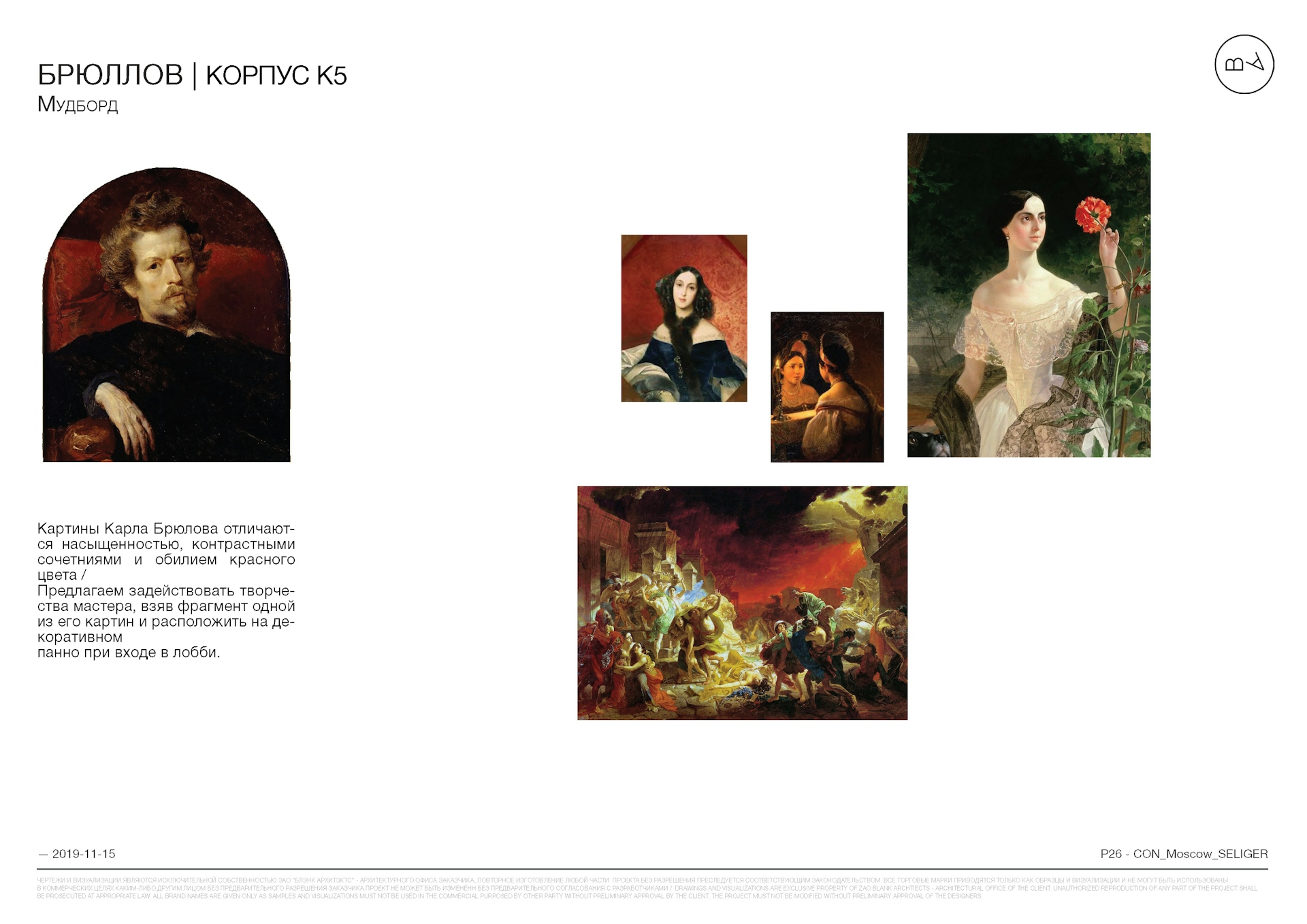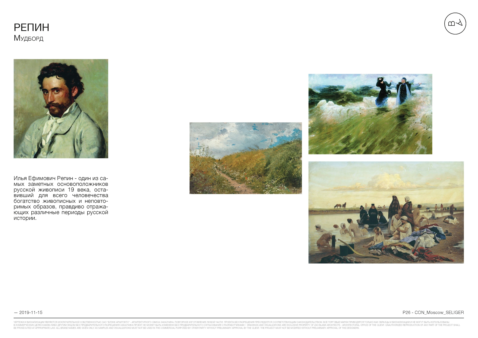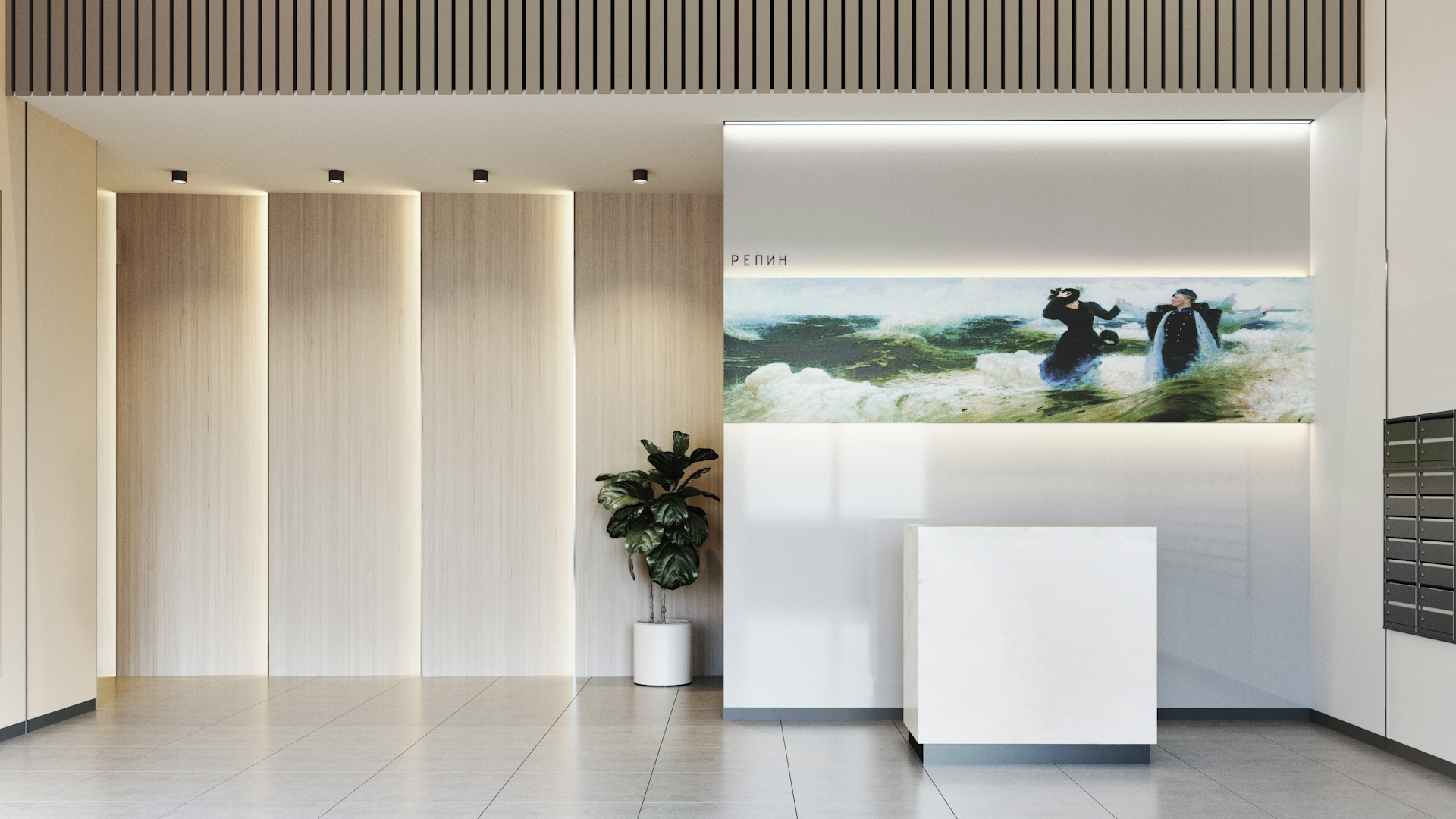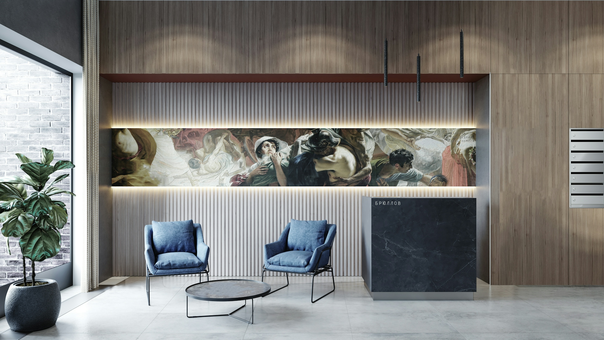 Для небоскреба «Репин» и малоэтажного здания «Брюллов» во второй очереди проекта мы использовали репродукции творений мастеров, взяв фрагменты знаменитых картин и расположив их на декоративном панно в зоне входной группы.