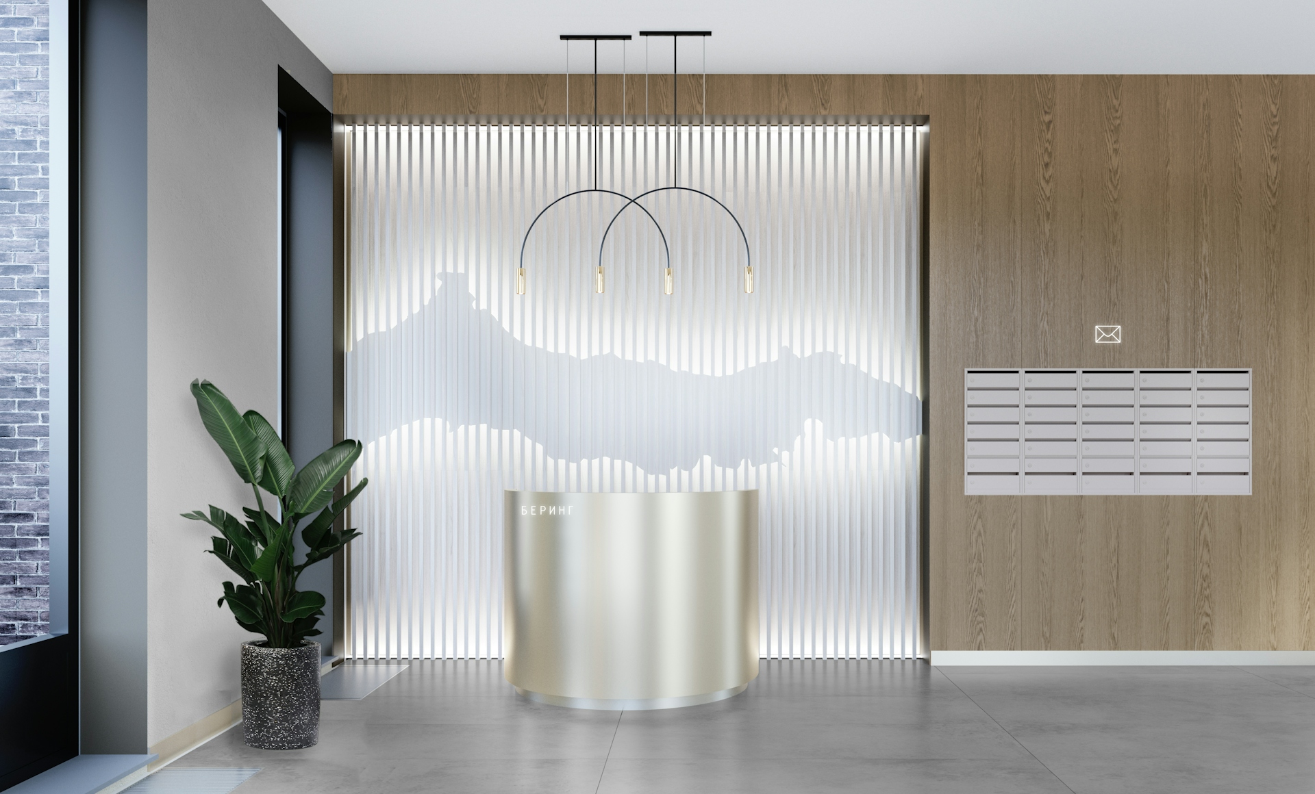 Для лобби «Беринг», посвященного жизни путешественника мы использовали декоративную стену с орнаментом виде контуров острова Беринга.