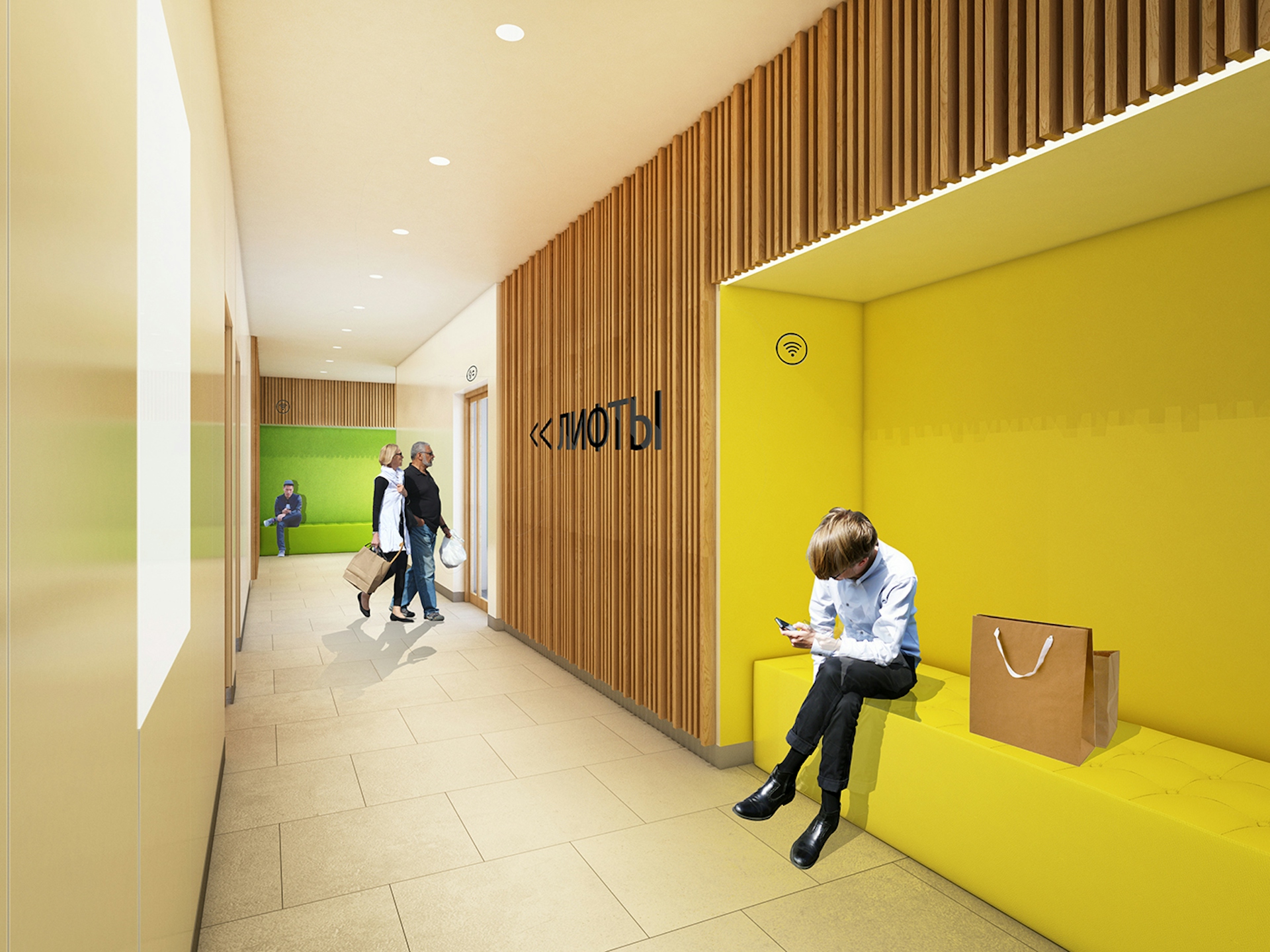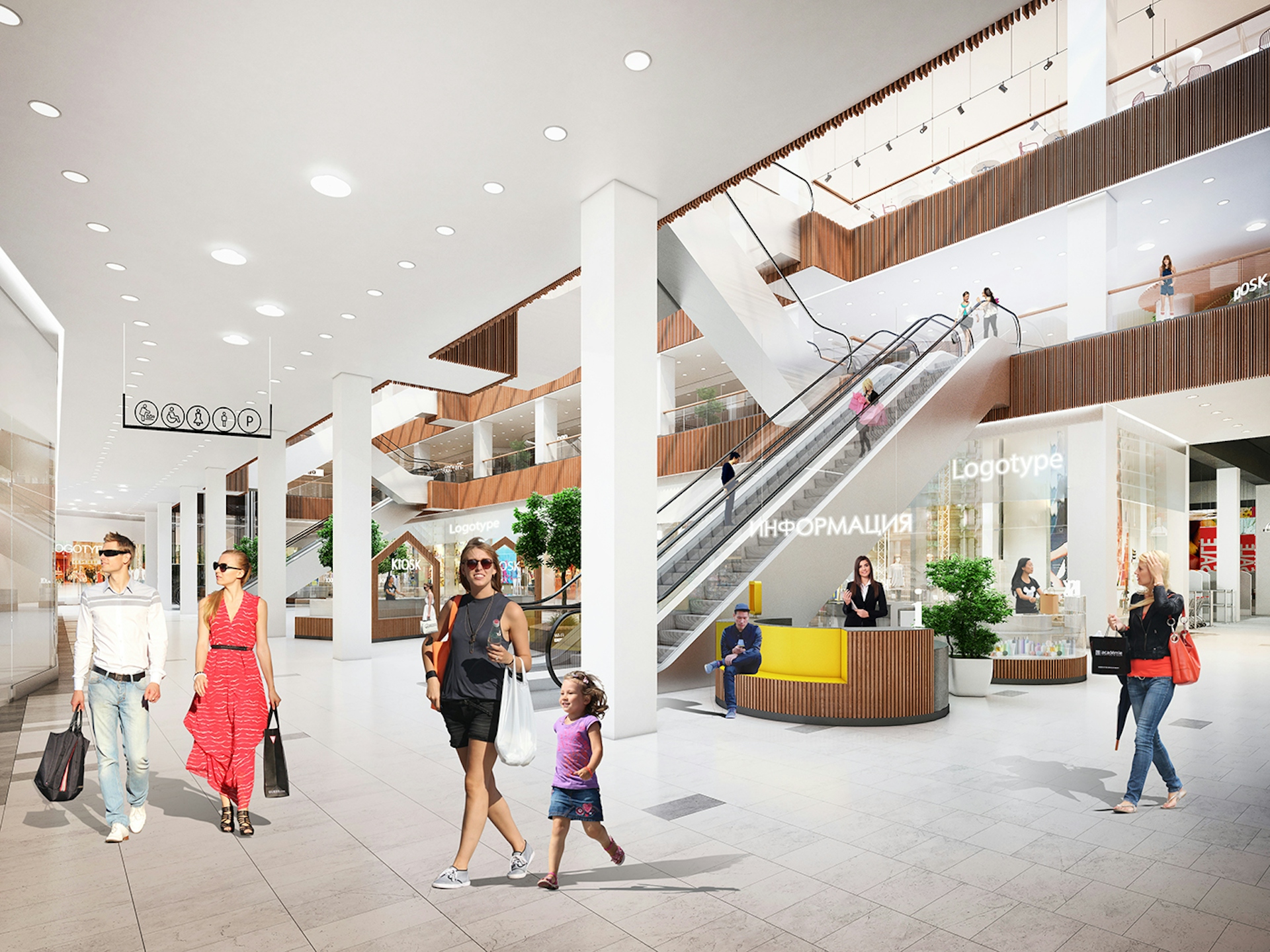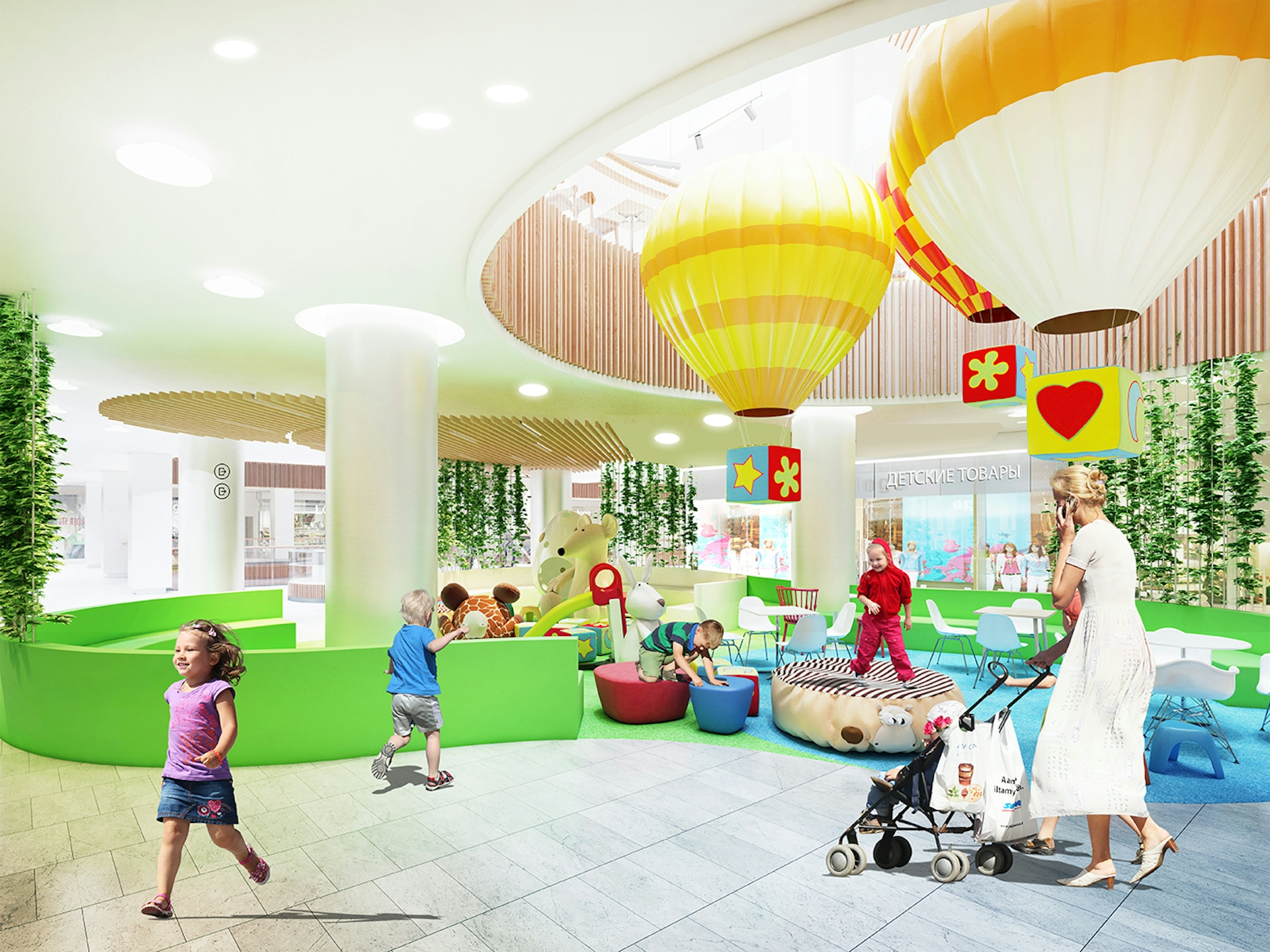 Нам хотелось создать расслабляющую атмосферу с использованием натуральных материалов, таких как камень, дерево и зелень. Главные галереи и атриумы будут выполнены в чистых белых тонах с деревянными элементами, обеспечивая максимальное количество дневного света. Мы добавили цвет с помощью мебели и мелких деталей, а для детских площадок использовали переработанные материалы в тематике популярных персонажей. Дизайн ориентирован на функциональность и комфорт для посетителей, с акцентом на доступность основных услуг. Первый этаж представляет собой открытый атриум с ресторанами и местами для встреч, оформленный в белом цвете и с деревянными панелями. Второй этаж предназначен для семей с детьми, где создана безопасная и яркая зона площадью 20 м² в стиле "Angry Birds". Мы обновили туалеты и комнаты для мам с детьми, чтобы обеспечить максимальный комфорт. Каждая зона отдыха включает в себя уголок для кормления, маленькую площадку, точку для подогрева пищи и туалет для детей.