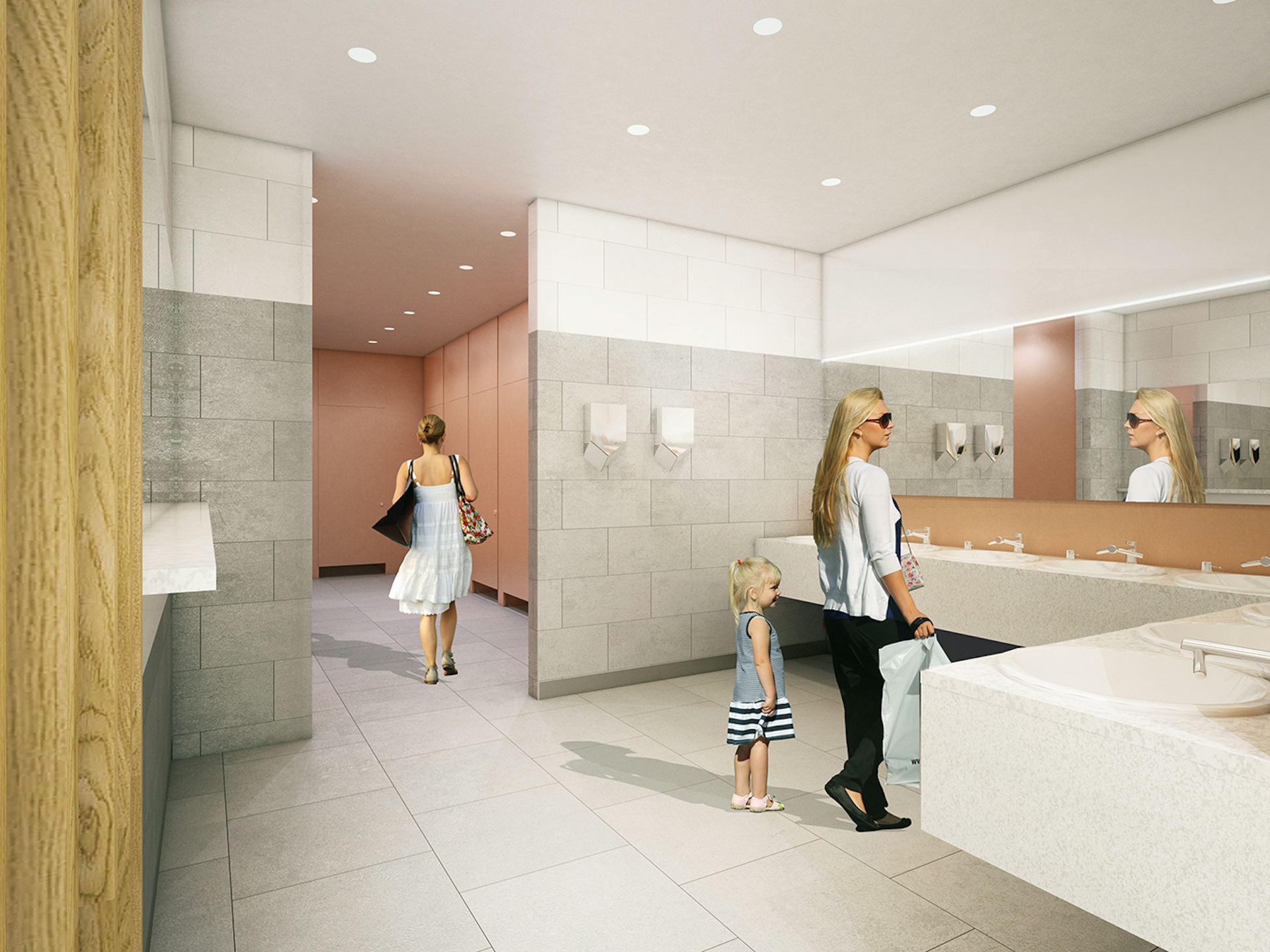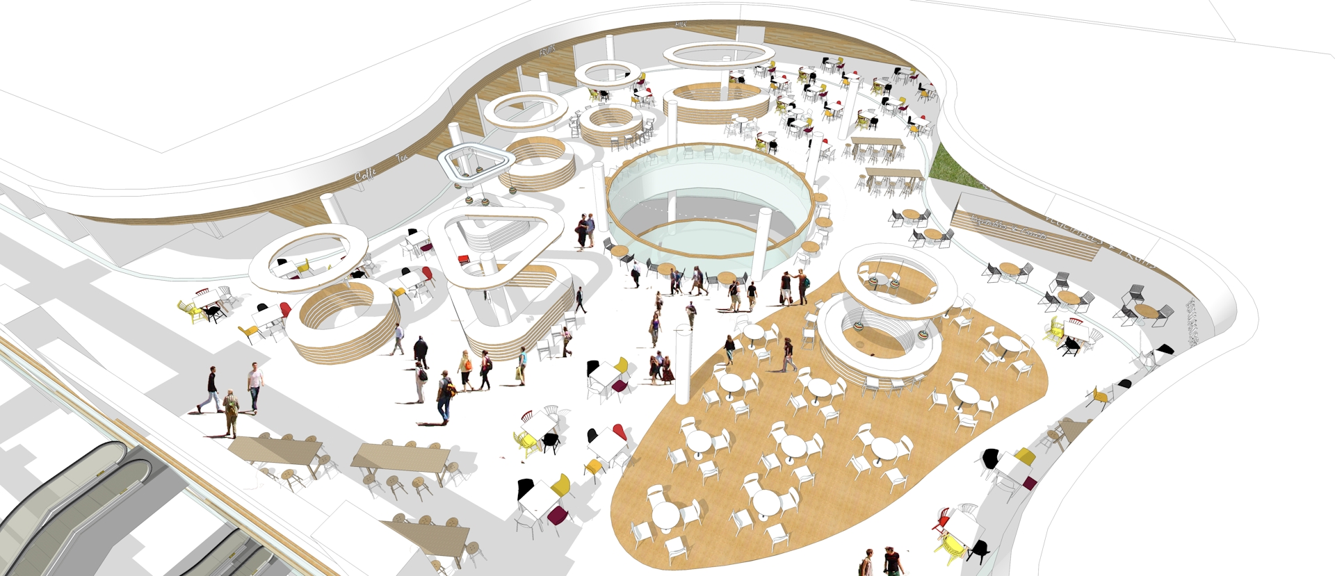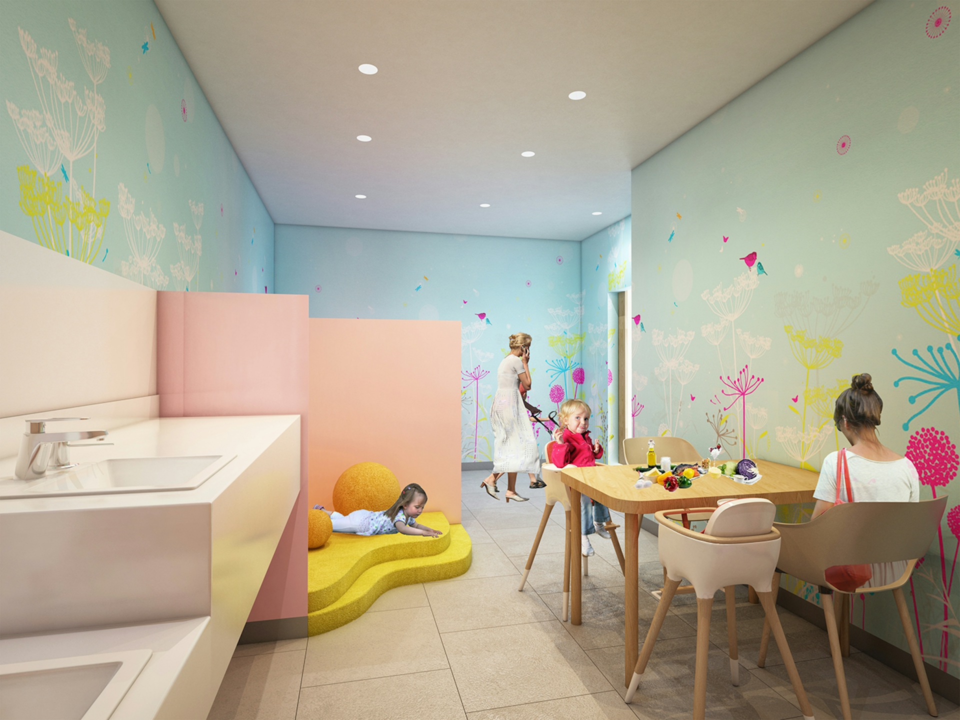 Нам хотелось создать расслабляющую атмосферу с использованием натуральных материалов, таких как камень, дерево и зелень. Главные галереи и атриумы будут выполнены в чистых белых тонах с деревянными элементами, обеспечивая максимальное количество дневного света. Мы добавили цвет с помощью мебели и мелких деталей, а для детских площадок использовали переработанные материалы в тематике популярных персонажей. Дизайн ориентирован на функциональность и комфорт для посетителей, с акцентом на доступность основных услуг. Первый этаж представляет собой открытый атриум с ресторанами и местами для встреч, оформленный в белом цвете и с деревянными панелями. Второй этаж предназначен для семей с детьми, где создана безопасная и яркая зона площадью 20 м² в стиле "Angry Birds". Мы обновили туалеты и комнаты для мам с детьми, чтобы обеспечить максимальный комфорт. Каждая зона отдыха включает в себя уголок для кормления, маленькую площадку, точку для подогрева пищи и туалет для детей.