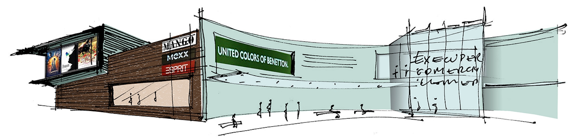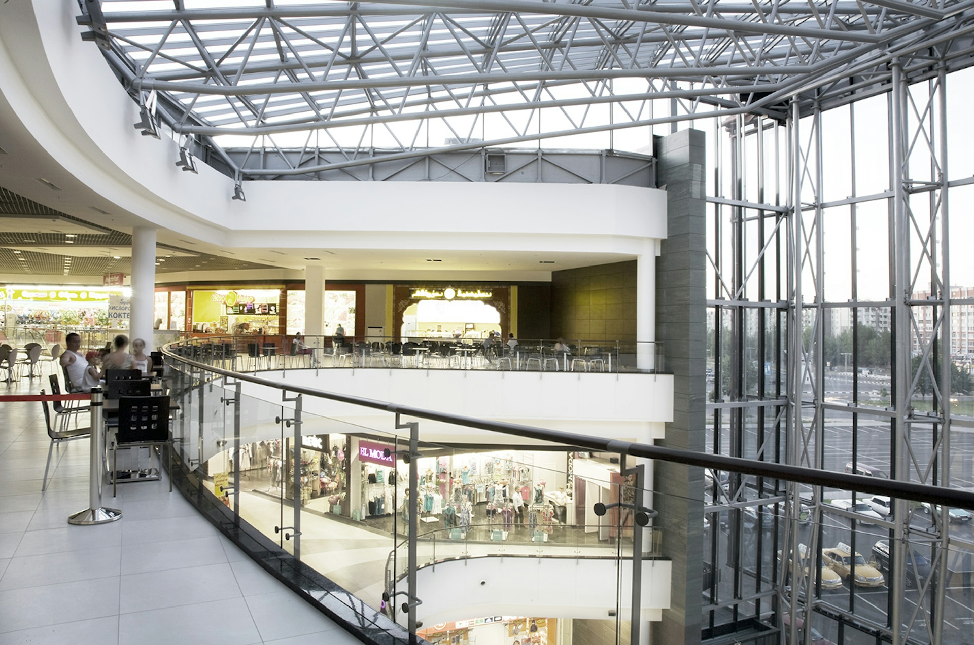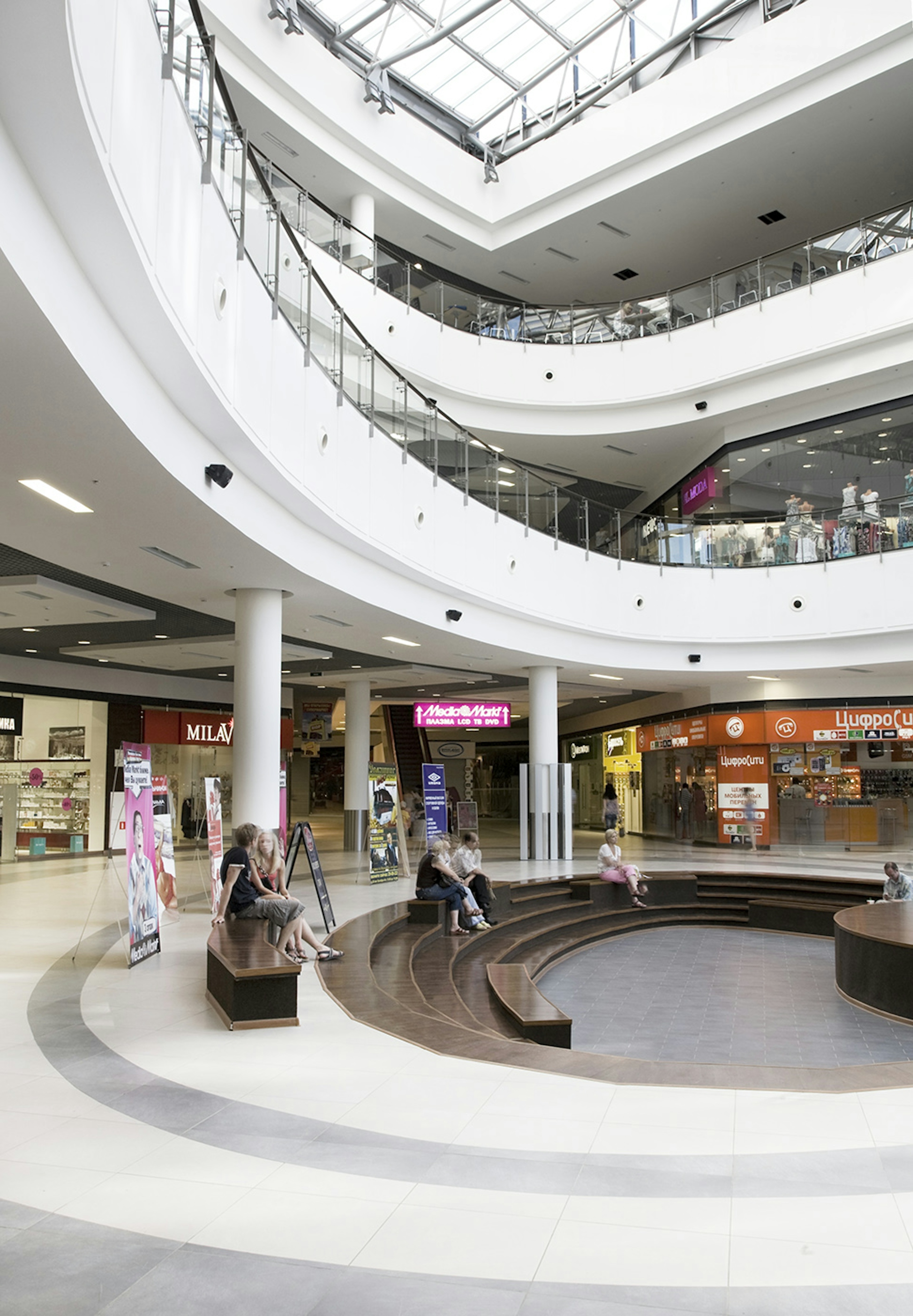 Центральной точкой торгового центра выступает трехэтажный атриум с террасами, отступающими друг от друга, чтобы создать впечатление арены. Небольшая сцена для мероприятий расположена на первом этаже. Весь атриум также становится входной зоной здания и хорошо заметен снаружи через стеклянный фасад. Главный фасад имеет плавную форму дуги с центральным входом и атриумом, а выступающая «коробка» кинотеатра определяет развлекательную функцию. Простые материалы, используемые для отделки фасада, такие как стальные панели и плитка, компенсируются деталями, такими как навес вдоль главного фасада и стеклянная стена главного входа. Все это создает впечатление доступности и дружелюбного отношения к семейной аудитории торгового центра.