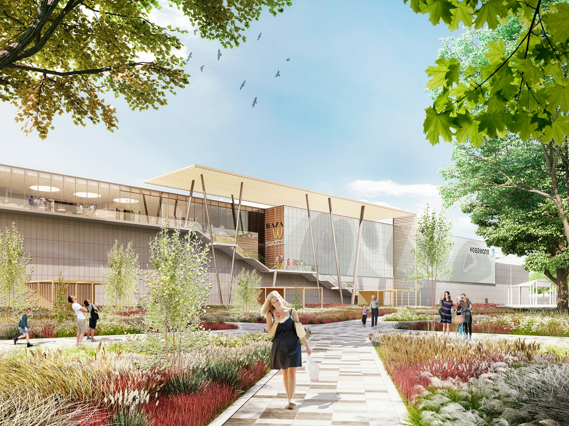 Основной идеей дизайна фасада была связь с ближайшим парком в окружении объекта. Мы хотели создать плавно перетекающую атмосферу, в которой парк становился бы продолжением торгового объекта. Нам удалось сформировать очень удобный и легкий доступ по пандусу и открытым лестницам к ресторанному дворику в торговом центре из ближайшего парка. Дизайн фасада делает объект интересным в окружении для местных жителей, и мы хотели отразить внутренние изменения проекта также и снаружи. В дизайне интерьеров, как и фасадов, мы использовали множество природных материалов и ярких цветов.