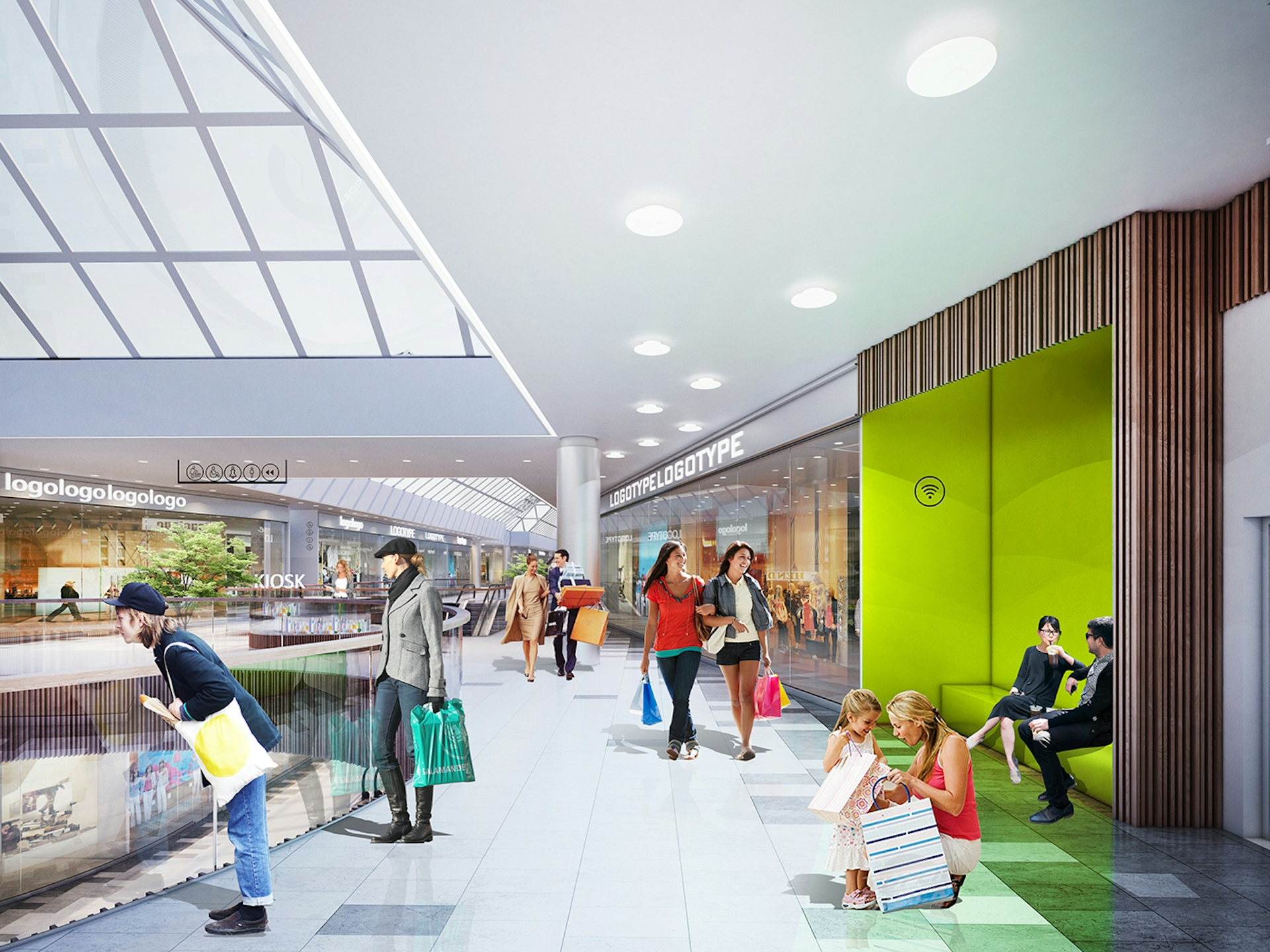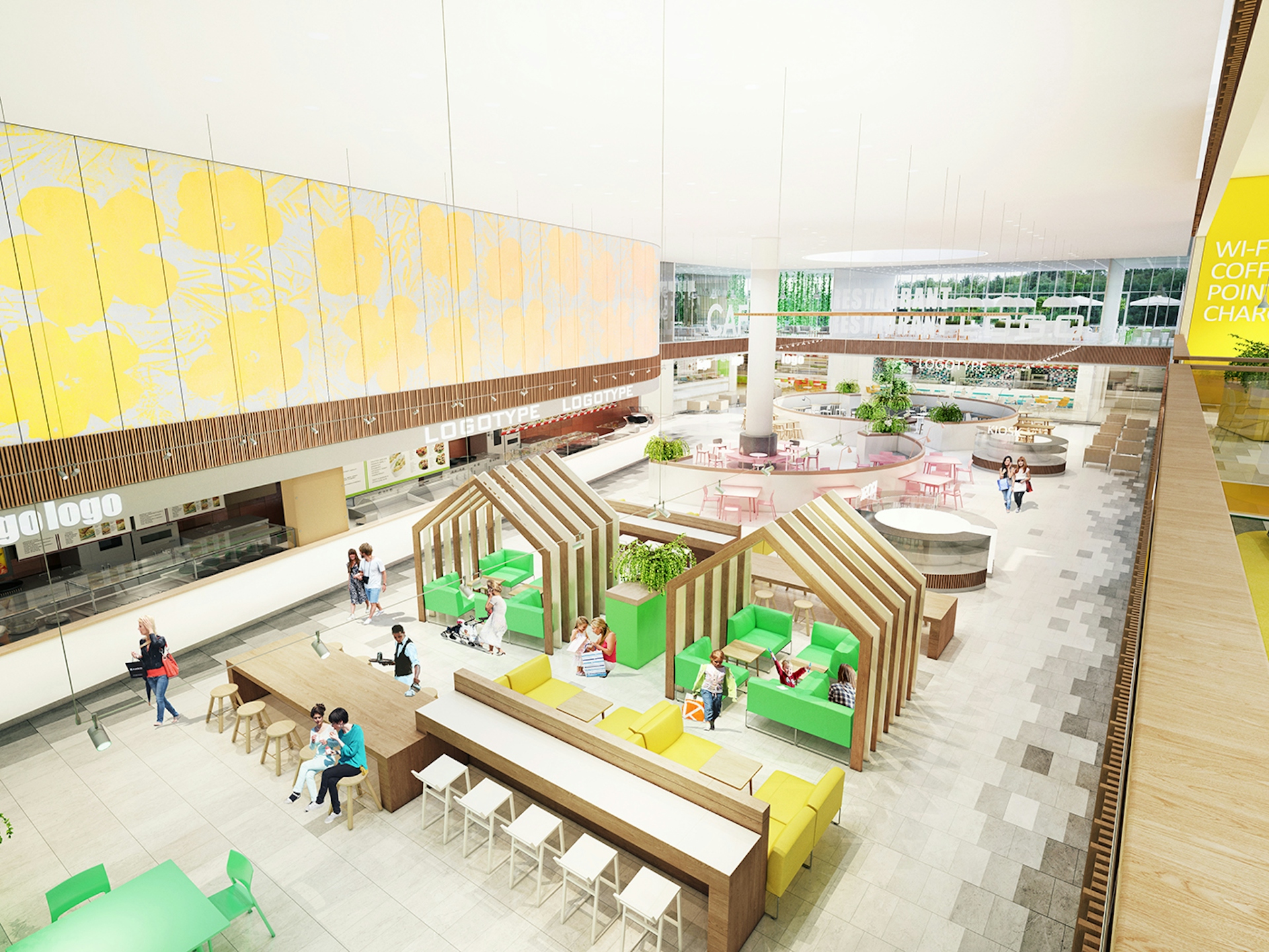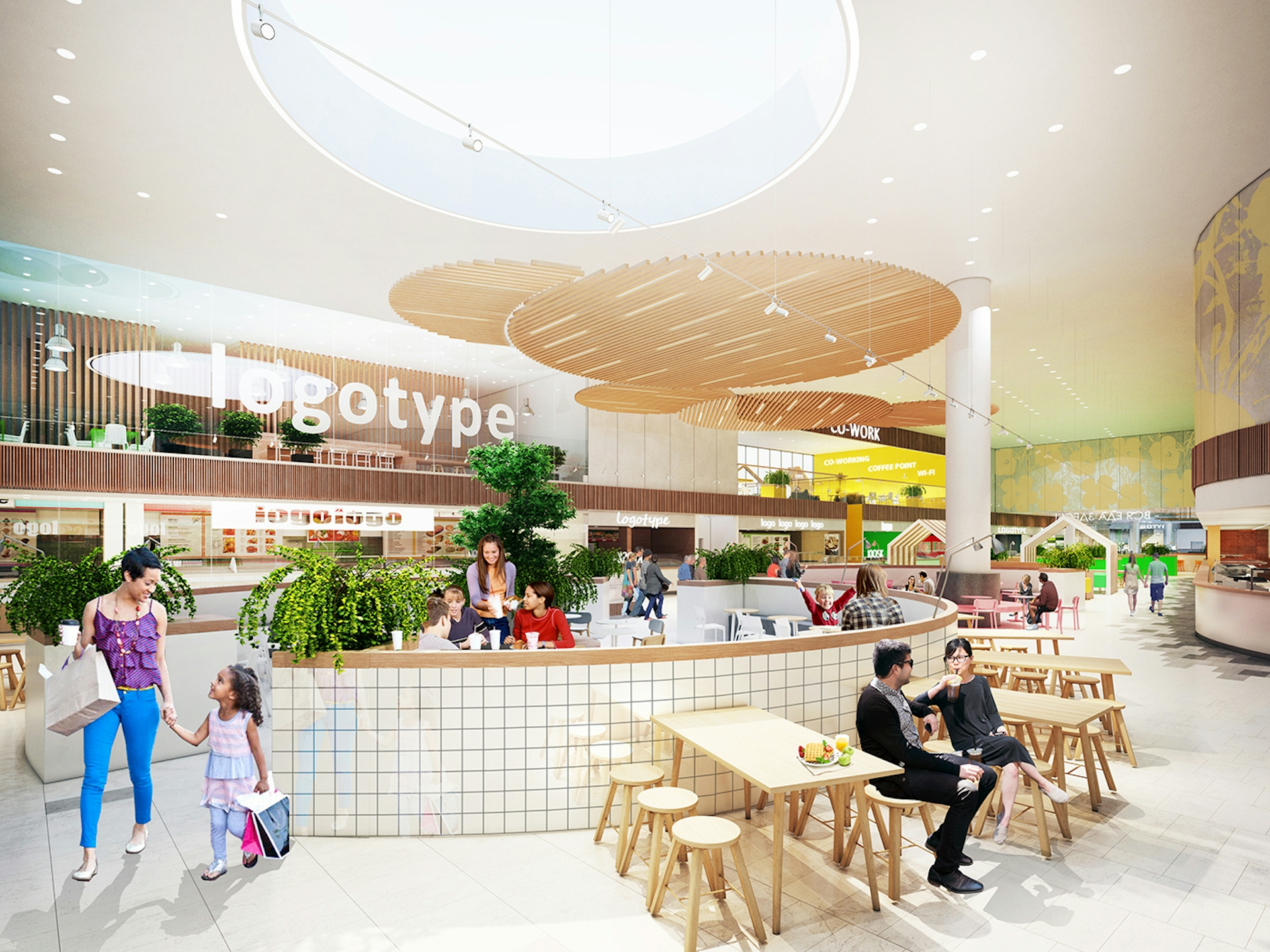 На 1-м этаже мы изменили дизайн пола и отделку потолка, добавили светильники и спроектировали новые витрины магазинов. Мы предложили яркий дизайн с большим количеством белого цвета и добавили в интерьеры красочные зоны отдыха с мягкой мебелью. Проемы внутренних атриумов мы подчеркнули деревянными панелями. 2-й этаж выполнен в том же стиле. Мы изменили планировку фудкорта, сделав его в два раза больше и удобнее. Пространство разделено на небольшие зоны с различными типами сидячих мест для групп от двух до шести человек. На 2-м этаже мы также добавили зону коворкинга, с неформальными рабочими местами и столами для деловых переговоров. С двух уровней ресторанов открывается вид на близлежащий парк. Мы также организовали на втором этаже красочную, безопасную игровую площадку для самых маленьких посетителей нашего торгового центра.