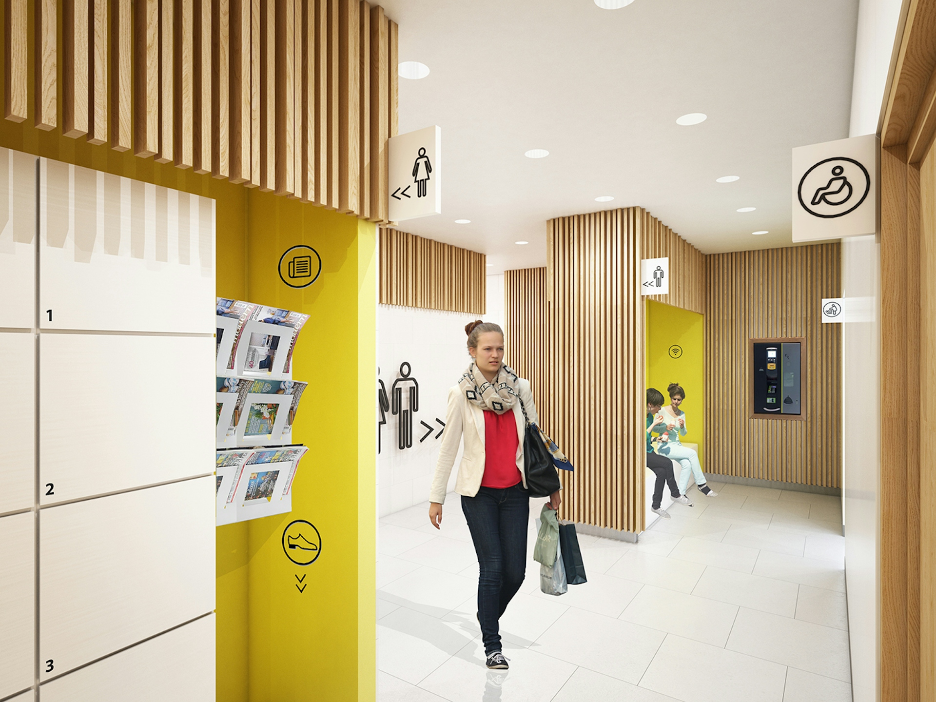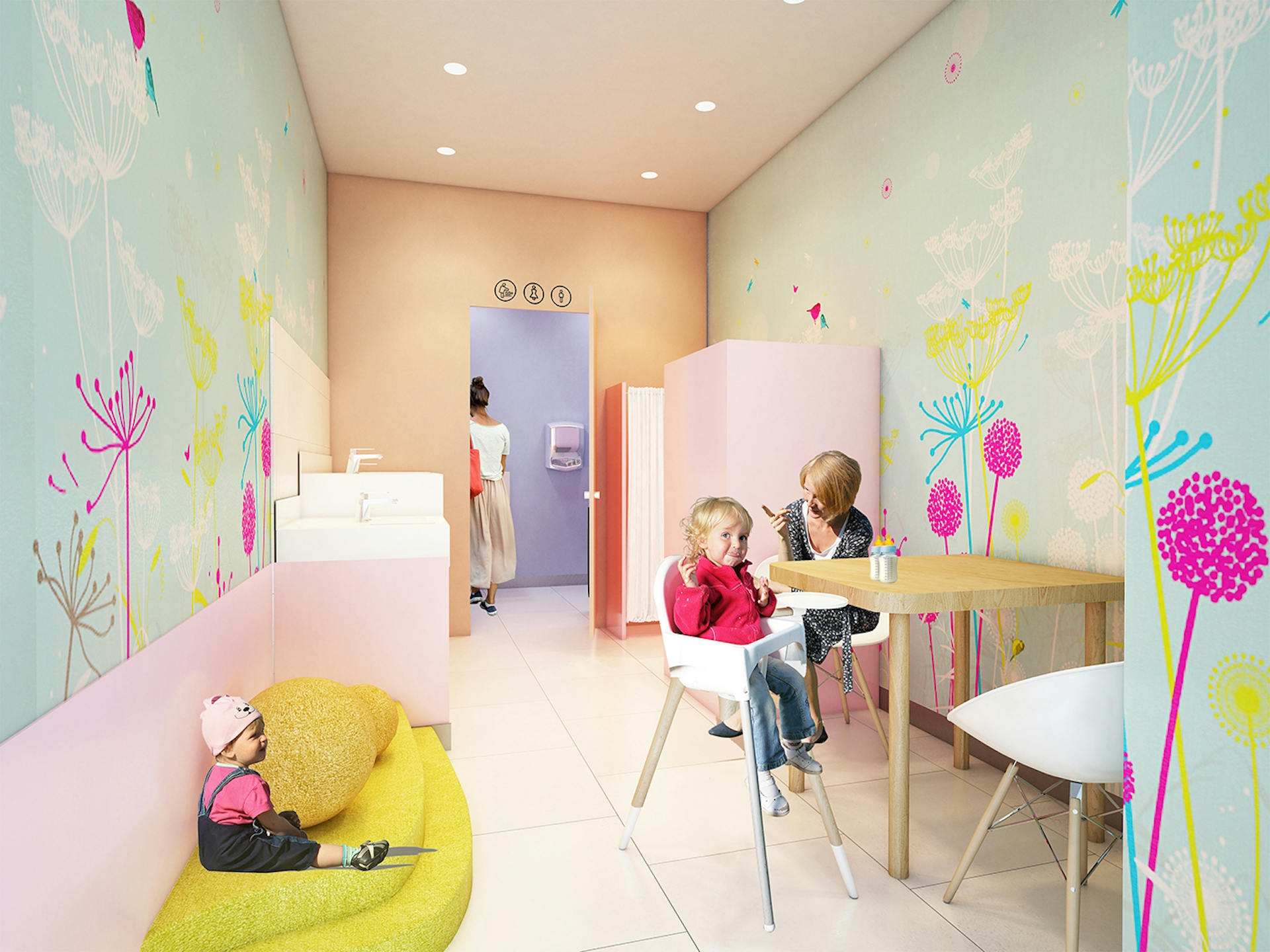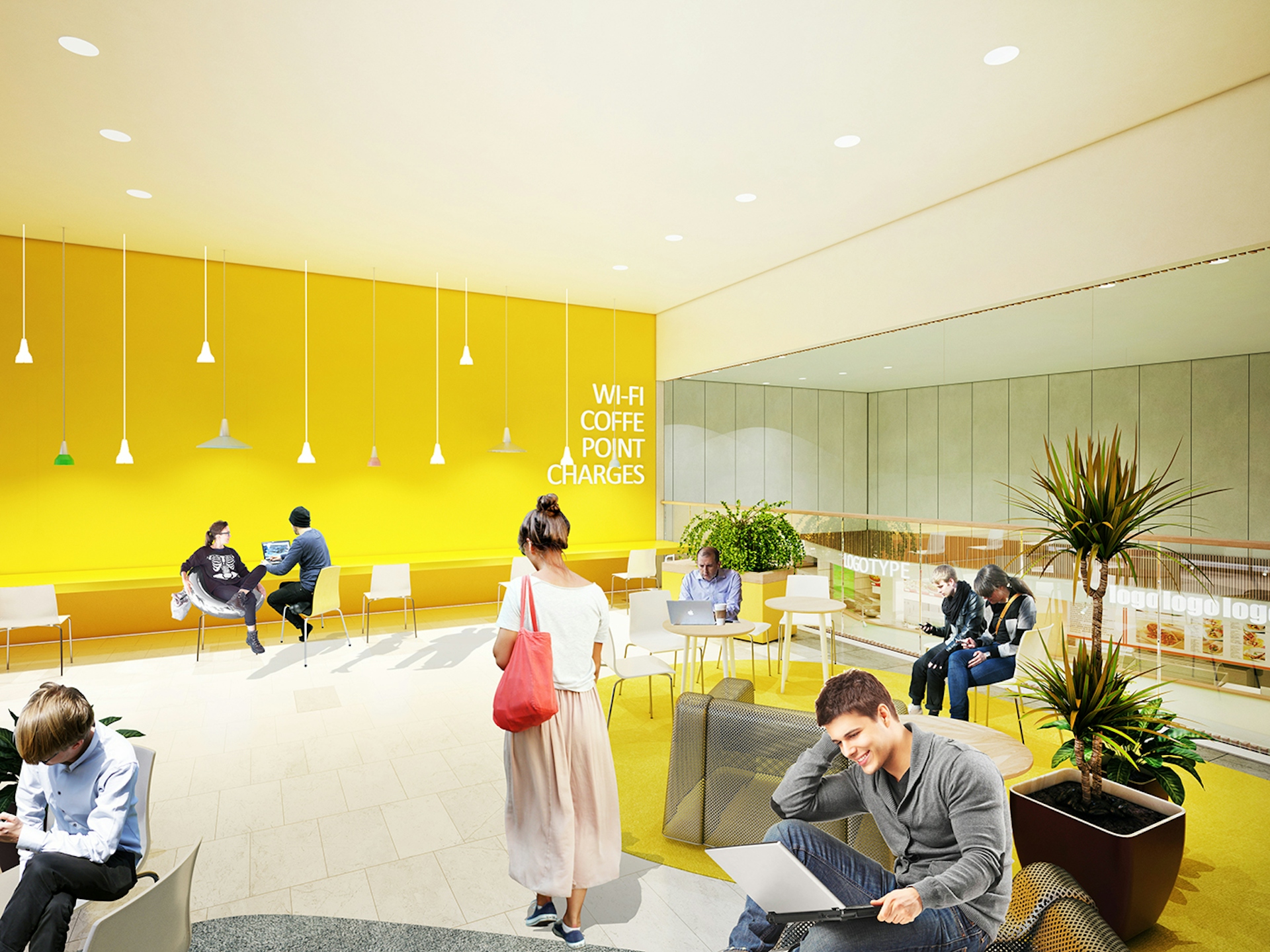 На 1-м этаже мы изменили дизайн пола и отделку потолка, добавили светильники и спроектировали новые витрины магазинов. Мы предложили яркий дизайн с большим количеством белого цвета и добавили в интерьеры красочные зоны отдыха с мягкой мебелью. Проемы внутренних атриумов мы подчеркнули деревянными панелями. 2-й этаж выполнен в том же стиле. Мы изменили планировку фудкорта, сделав его в два раза больше и удобнее. Пространство разделено на небольшие зоны с различными типами сидячих мест для групп от двух до шести человек. На 2-м этаже мы также добавили зону коворкинга, с неформальными рабочими местами и столами для деловых переговоров. С двух уровней ресторанов открывается вид на близлежащий парк. Мы также организовали на втором этаже красочную, безопасную игровую площадку для самых маленьких посетителей нашего торгового центра.