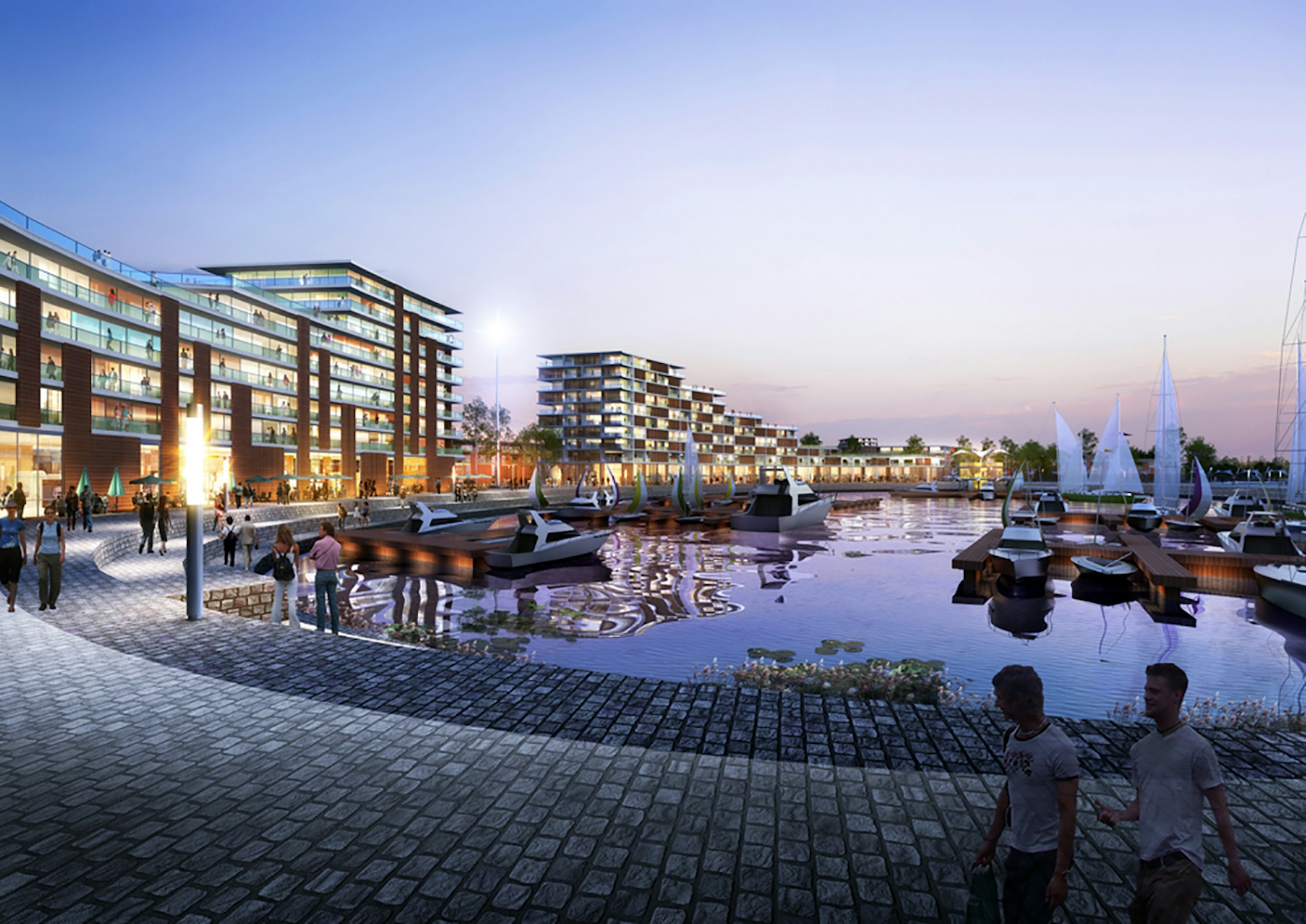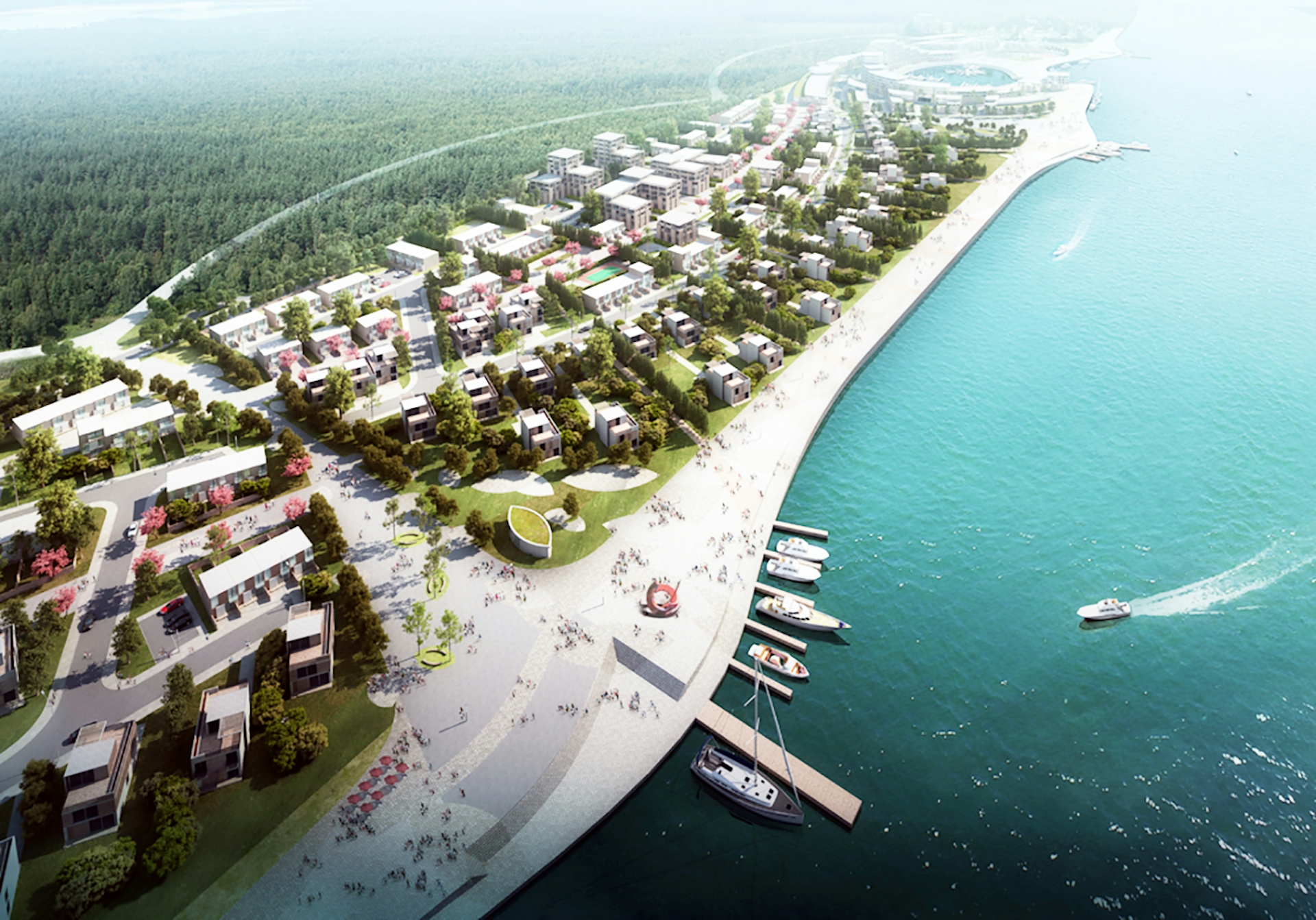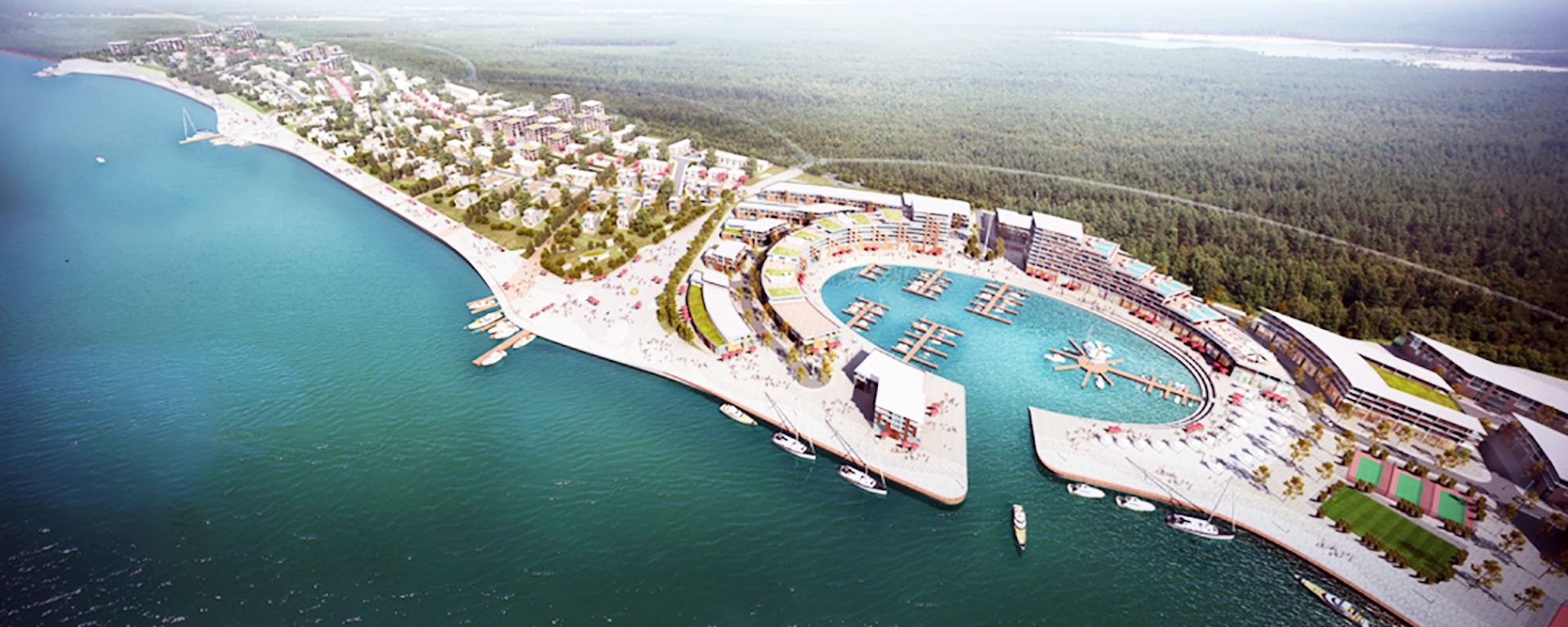 Участок представляет собой вытянутую прямоугольную форму на левом берегу реки Волги в Тверской области, площадью 48,0 га. Южная граница - река Волга, западная - частные земельные участки для садов, северная - рекреационные цели. Рельеф имеет плавный уклон с перепадом высот около 3 м. На участке протекают ручьи, впадающие в Волгу. Он находится в "третьей санитарно-защитной зоне" с ограничениями на использование. Принятое планировочное решение предусматривает размещение пяти комплексов, которые будут построены поэтапно. Каждый из них связан рекреационными зонами с протекающими через них притоками реки. В комплексах преобладают многоквартирные дома и трехэтажные виллы, а также двух- и трехэтажные таунхаусы и многоэтажные жилые здания. Квартиры различаются по количеству этажей и имеют первые этажи смешанного использования, включая два детских сада на тридцать пять мест, расположенные на первых этажах многоэтажных зданий. Часть территории отведена под строительство сухого дока для хранения и незначительного ремонта частных яхт. Жилые зоны соединены обширным благоустройством для общественного пользования с открытыми бассейнами, спортивными и рекреационными площадками. Парковка для владельцев вилл и таунхаусов расположена на их территориях. Планировочное решение комплекса марины имеет наивысшую плотность застройки и включает искусственный водоем с причальными сооружениями для яхт (яхтенный порт), яхтенный клуб, загородный клуб, гостиницу на набережной, многоэтажные квартиры и отдельно стоящее оборудование для спорта и отдыха.