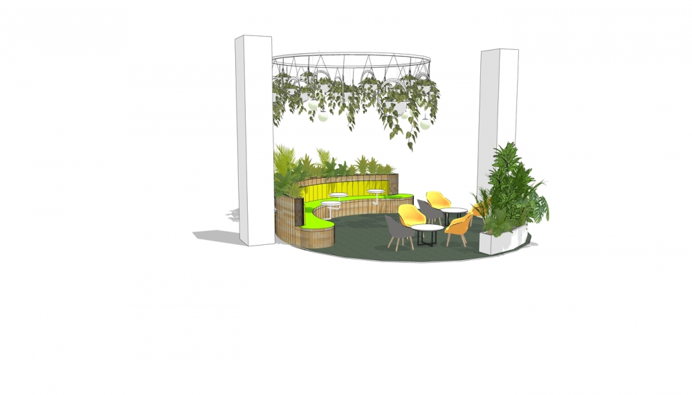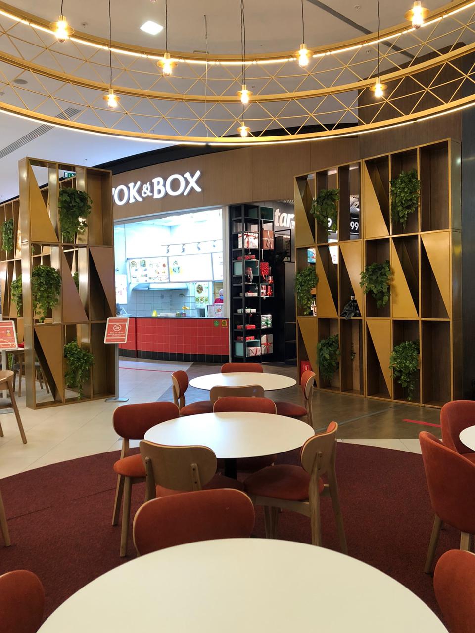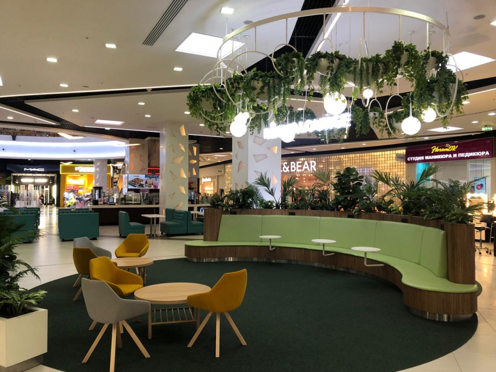 Фудкорт – одна из самых привлекательных зон торгового центра с атмосферой для комфорта и расслабления посетителей. Мы определили места для разных групп гостей: большие столы для компаний из 8-10 человек и стандартные посадочные места для 2-4 человек. Мы также предусмотрели коворкинг-зону, где можно поработать с ноутбуком. Вся зона фудкорта окружена зеленью и оформлена современными декоративными элементами.