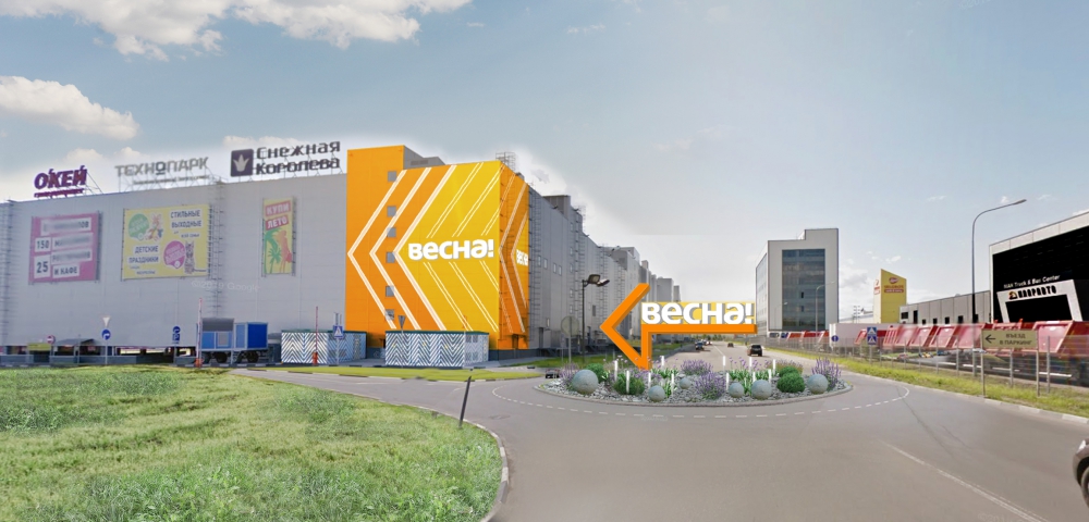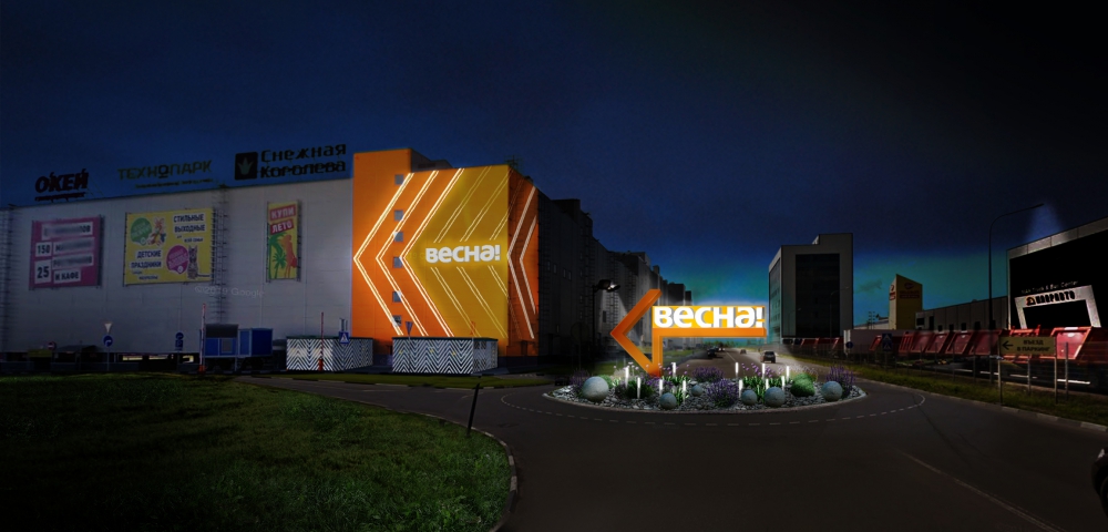 Нашей задачей было также создание элементов навигации на фасаде объекта со стороны Алтуфьевского шоссе. Для этой задачи мы использовали угол фасада, где добавили яркие элементы и световые короба, указывающие направление движения к торговому центру. На кольце для автомобилей мы разместили навигационный «тотем» и разработали ландшафтный дизайн, который станет визитной карточкой торгового центра.