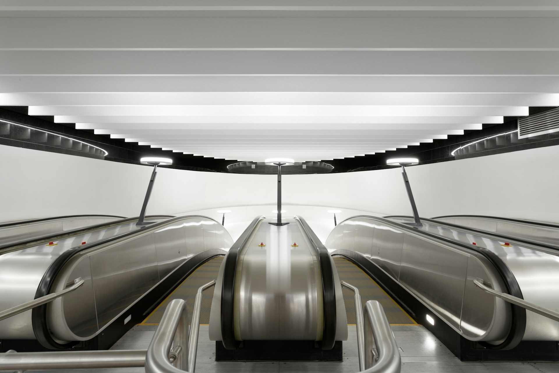 An arch sequence that smoothly goes from one entrance to the other. By using different colors on the end of platform we’ve shown the passenger where the exit and corridor are located to the Rizhsky Railway Station and Rizhskaya metro station exit. The wall imitates the blurred views of the windows of a train, car, plane in transit. They will be surprised by a different view each few meters. We used common materials, and outlined the arch’s shape with our lighting design and steel. The resulting, calm symmetrical sequences are repeated from entrance to entrance.